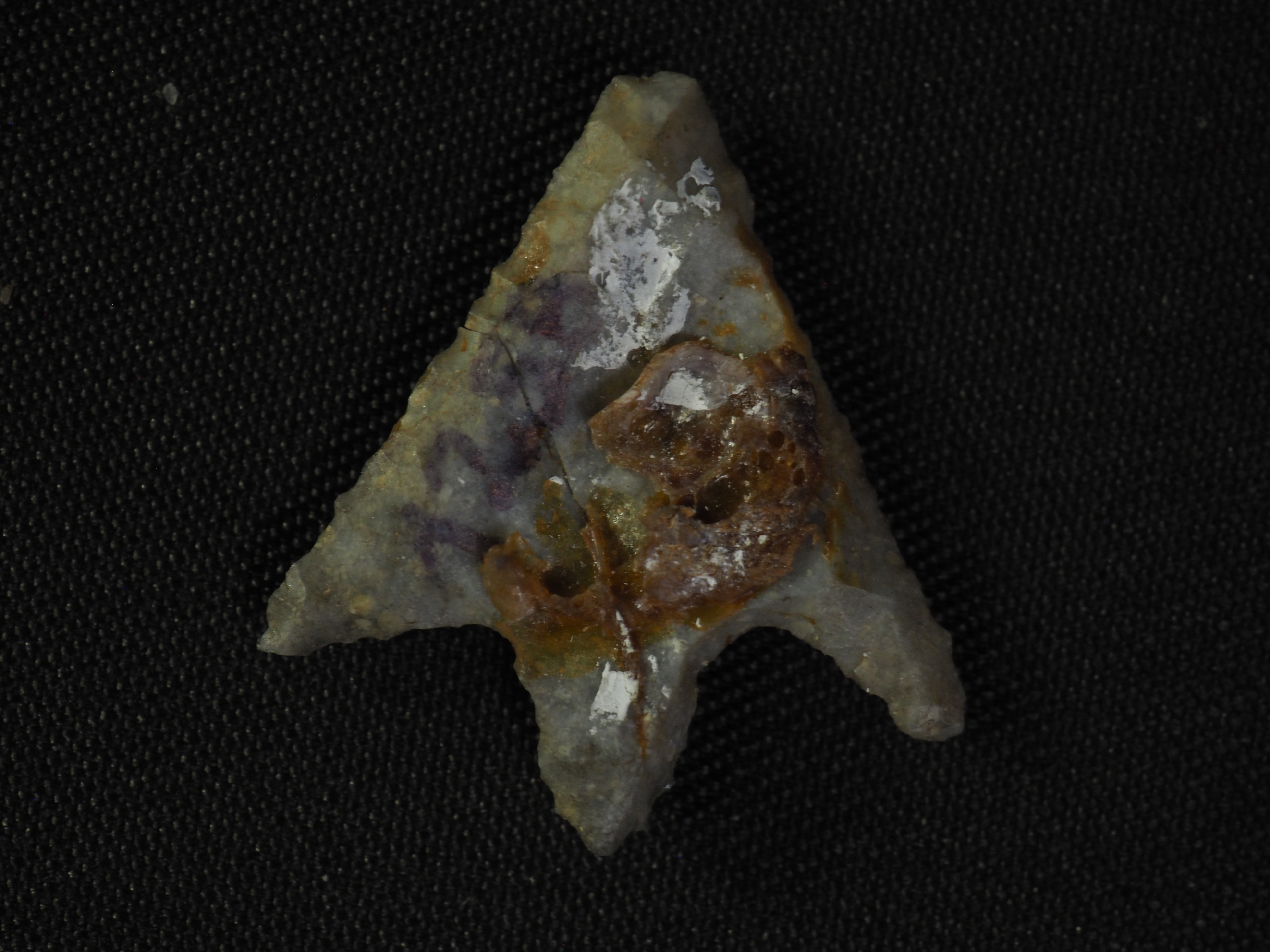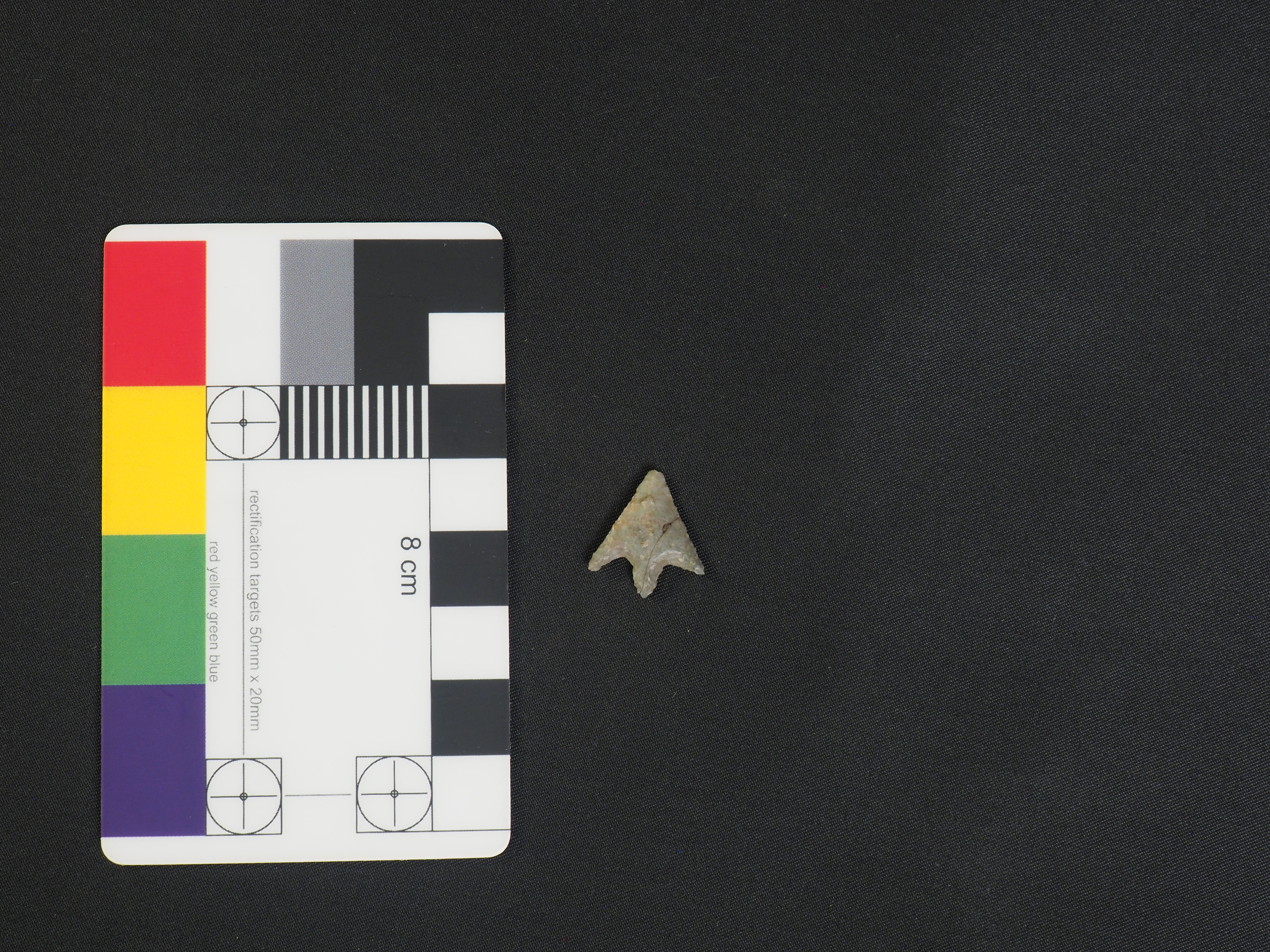 Instrumento de piedra tallada de color blanco. Probable uso como elemento de caza de macrofauna. Técnica: Tallado. Morfología: Objeto lítico con limbo de forma triangular pedunculada, con dos aletas, extremo distal terminante en punta y sección transversal biconvexa. Se encuentra erosionado.