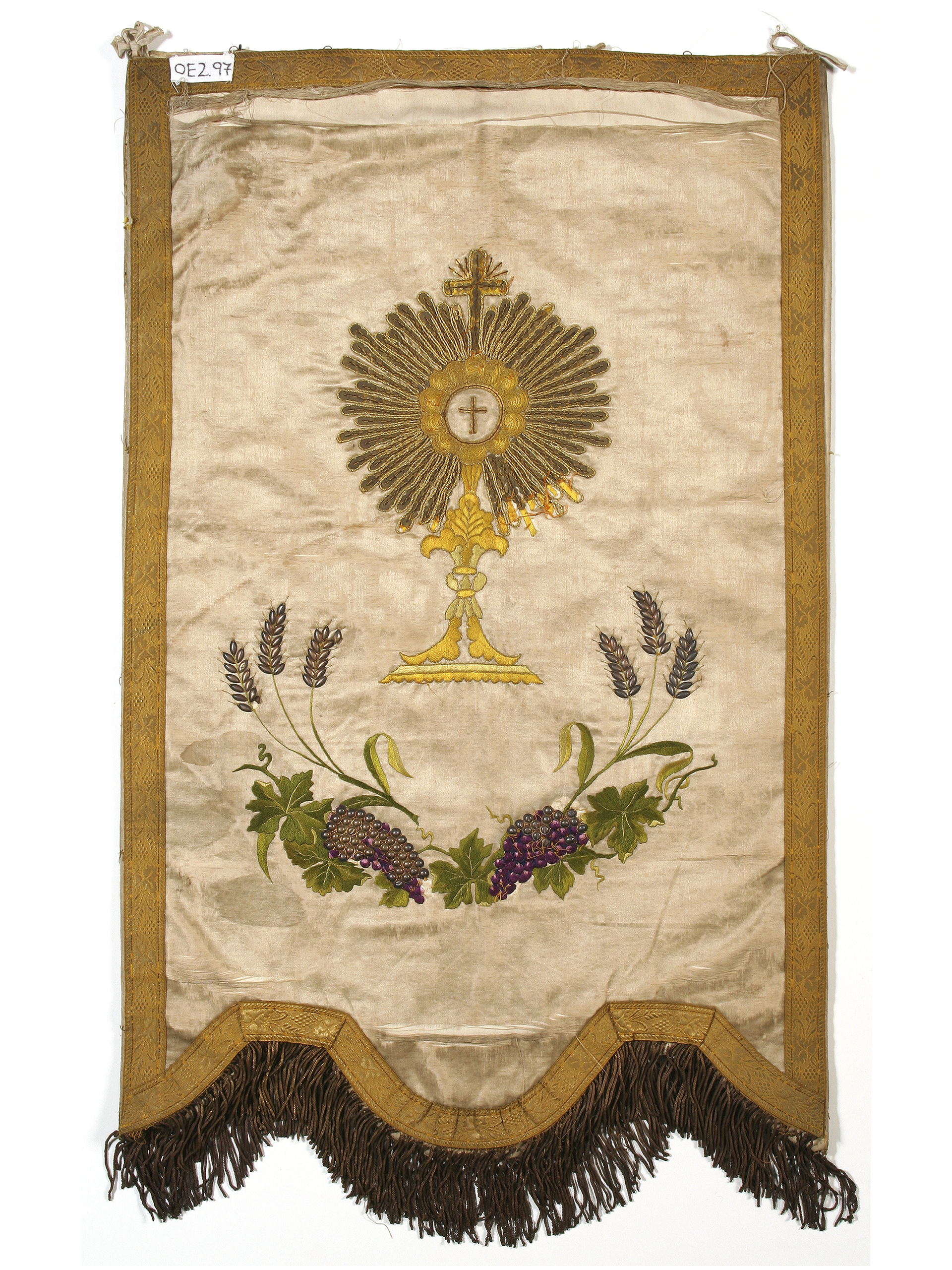 dc.description | dc.description | White satin banner with gold velvet appliqués on the front, embroidered chalice with vines and ears of wheat on the back. Galloon ribbon on edges and metallic fringes at the bottom. | |