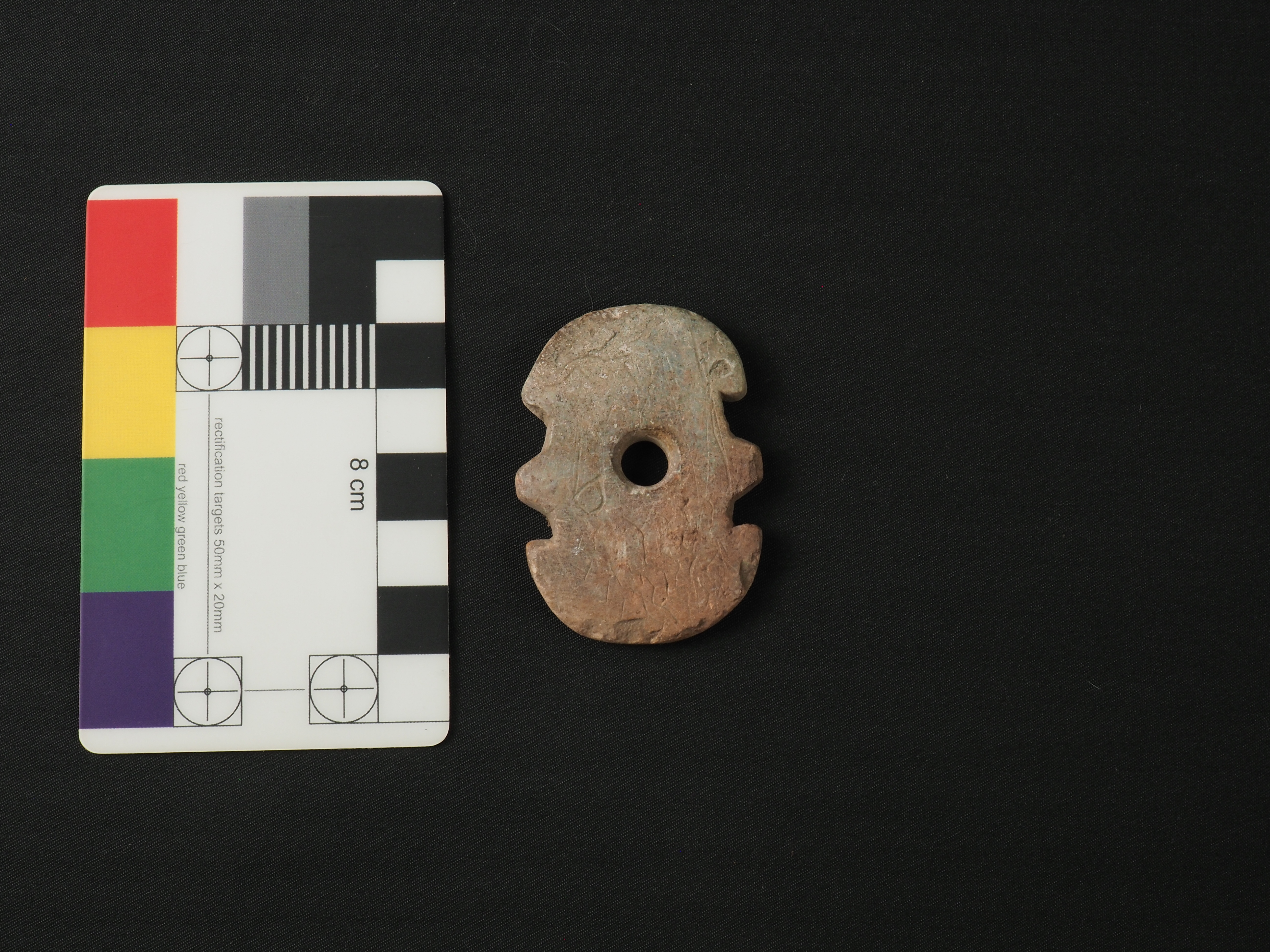 dc.description | dc.description | Artefacto de piedra pulida de color marrón que, probablemente, se utilizaba como implemento de trabajo textil para calibrar de forma homogénea las hebras manufacturadas. Técnica: Roca tallada, pulida y perforada. Morfología: Objeto de forma ovoide con perforación transversal hiperboloide central y bordes redondeados y secciones dentadas redondeadas como complemento a la perforación central. La sección transversal es plana en ambas caras. | |