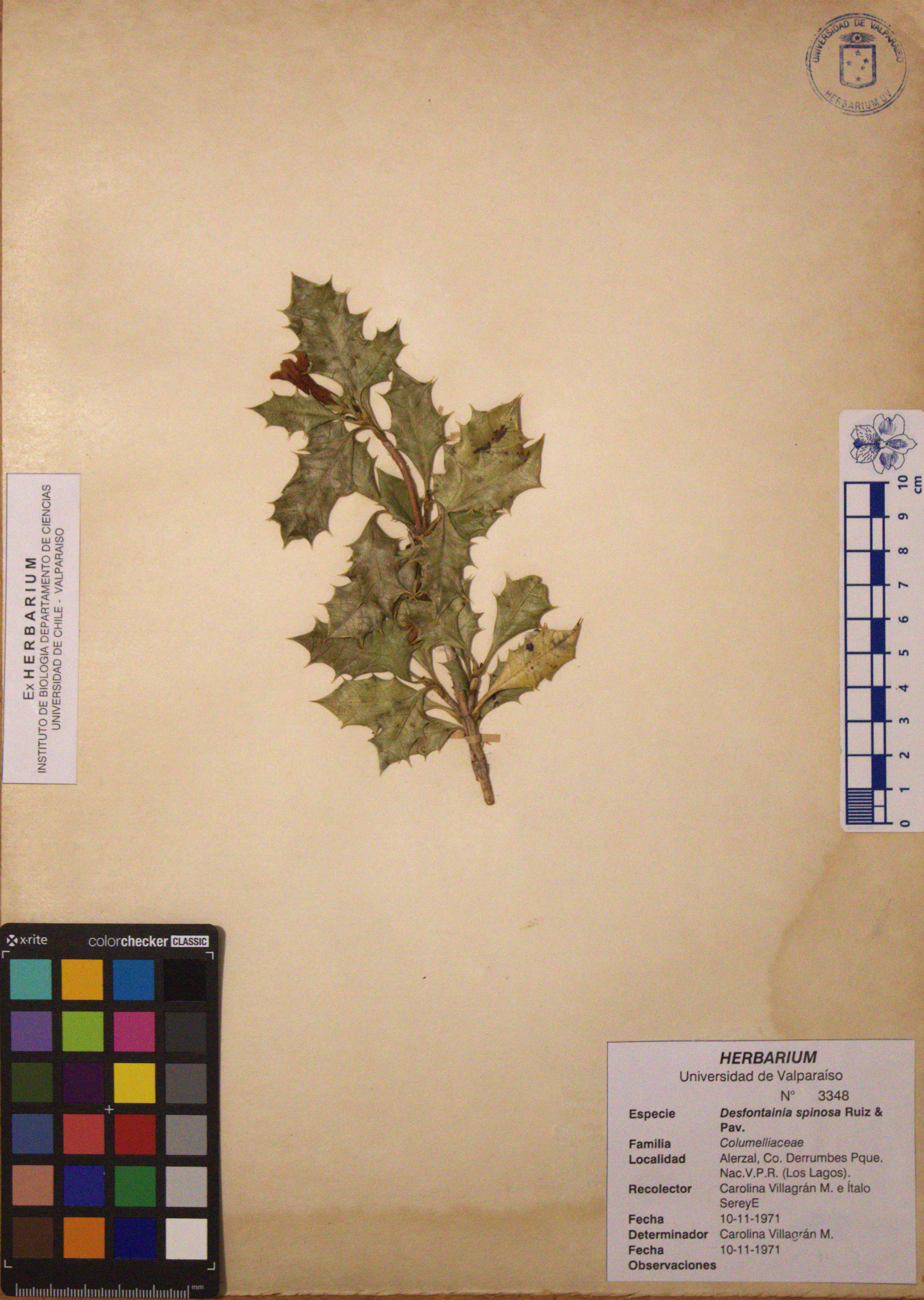 Flora nativa originaria de Chile, Argentina, Perú, Bolivia, Ecuador, Colombia, Venezuela, Costa Rica y Panamá perteneciente a la familia Columelliaceae y del género Desfontainia.