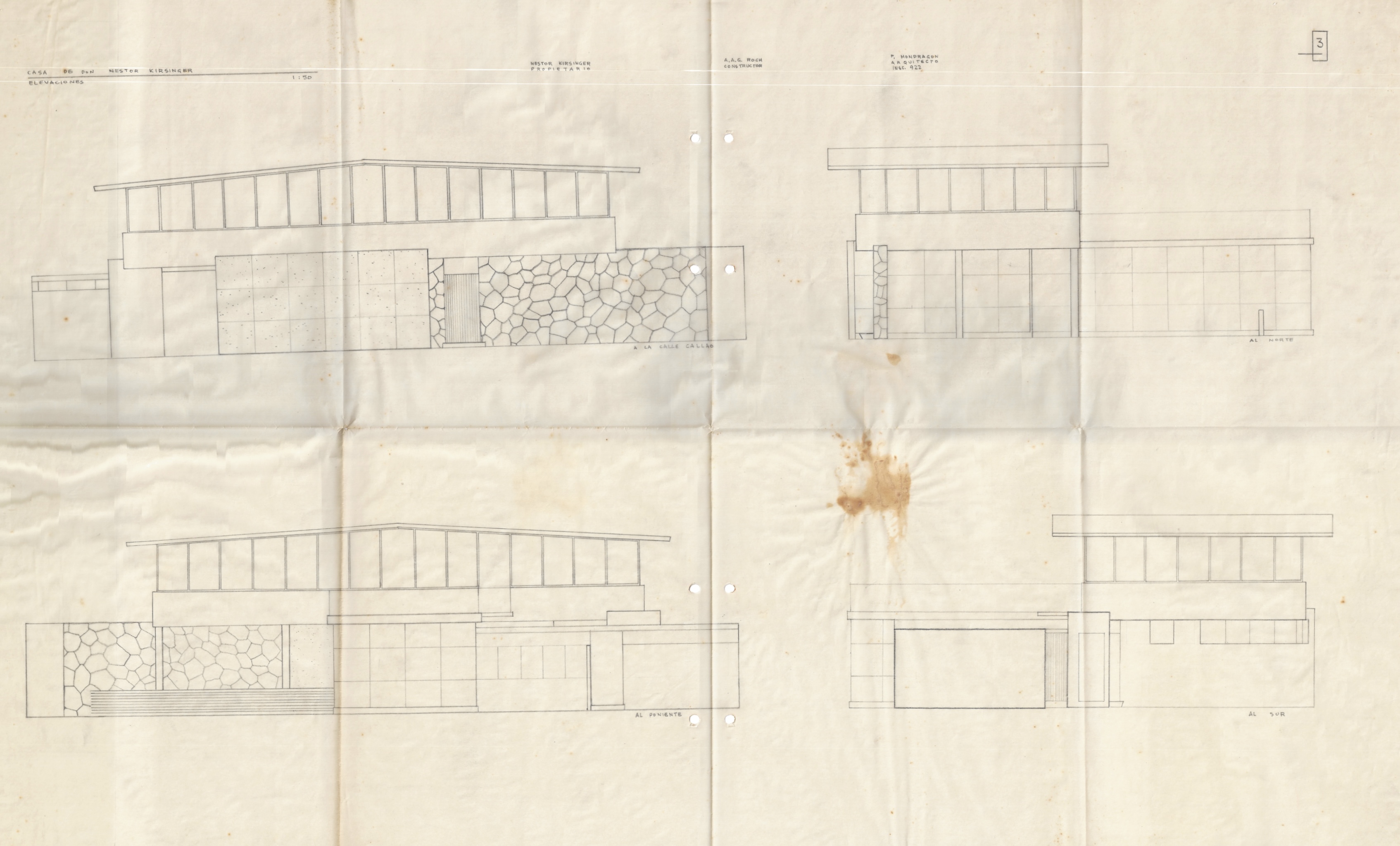 El proyecto Casa para don Néstor Kinsinger está compuesto por dos planos. El primero presenta los detalles constructivos de la planta del primer piso en escala 1:50. El segundo corresponde a la fachada de la vivienda, representada en sus distintas orientaciones, también en escala 1:50, completando así la descripción arquitectónica esencial del proyecto.