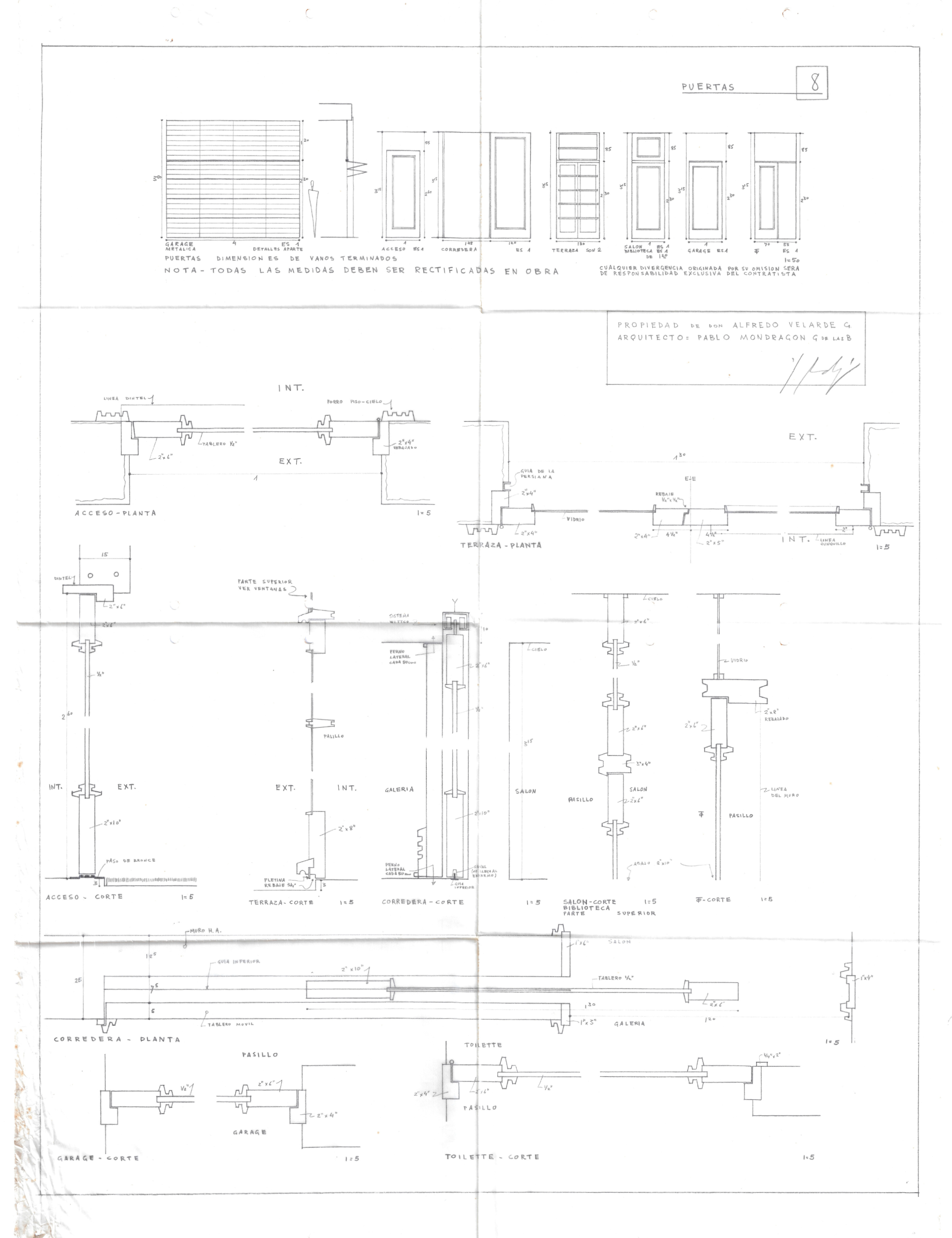 Los documentos contemplan también detalles de puertas, con la indicación expresa de que todas las medidas deben ser rectificadas en obra, y detalles de ventanas en escala 1:5, acompañados de la misma nota técnica. El conjunto se complementa con planos adicionales que describen puertas, ventanas, guardapolvos, molduras y junquillos.