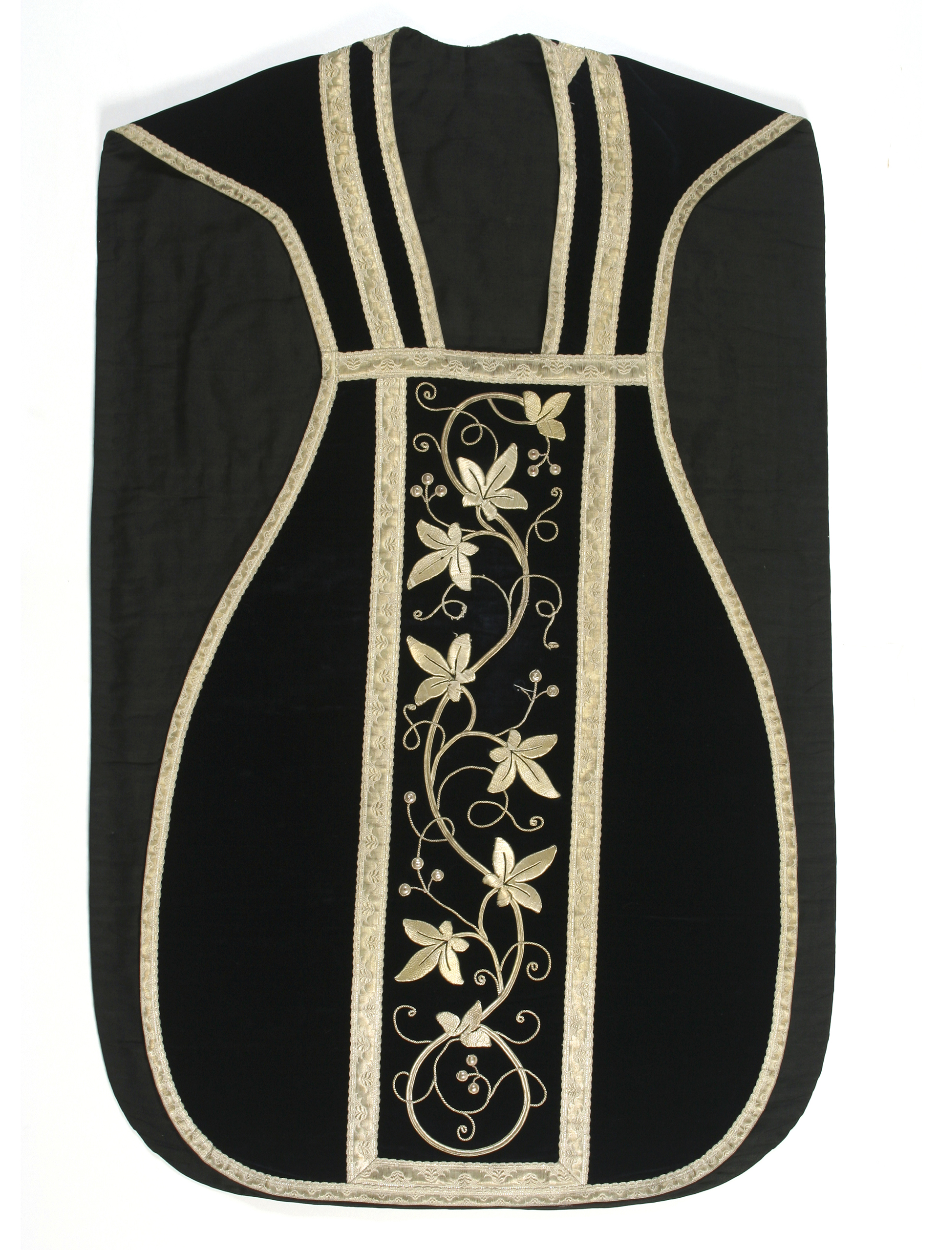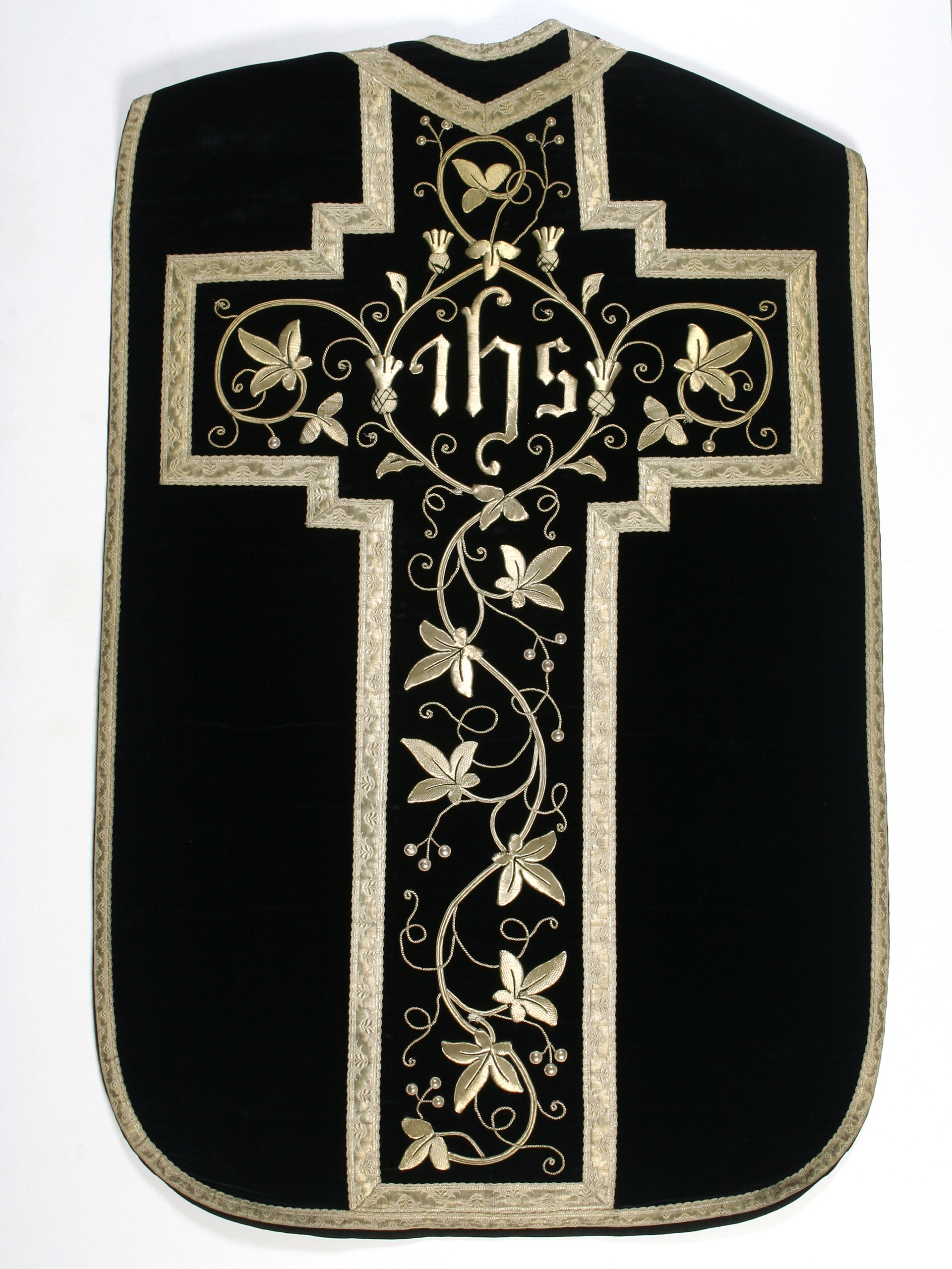 Tela negra con bordados floral en tonos plateados, cruz de espalda formada por cinta y cristograma bordado en parte central,