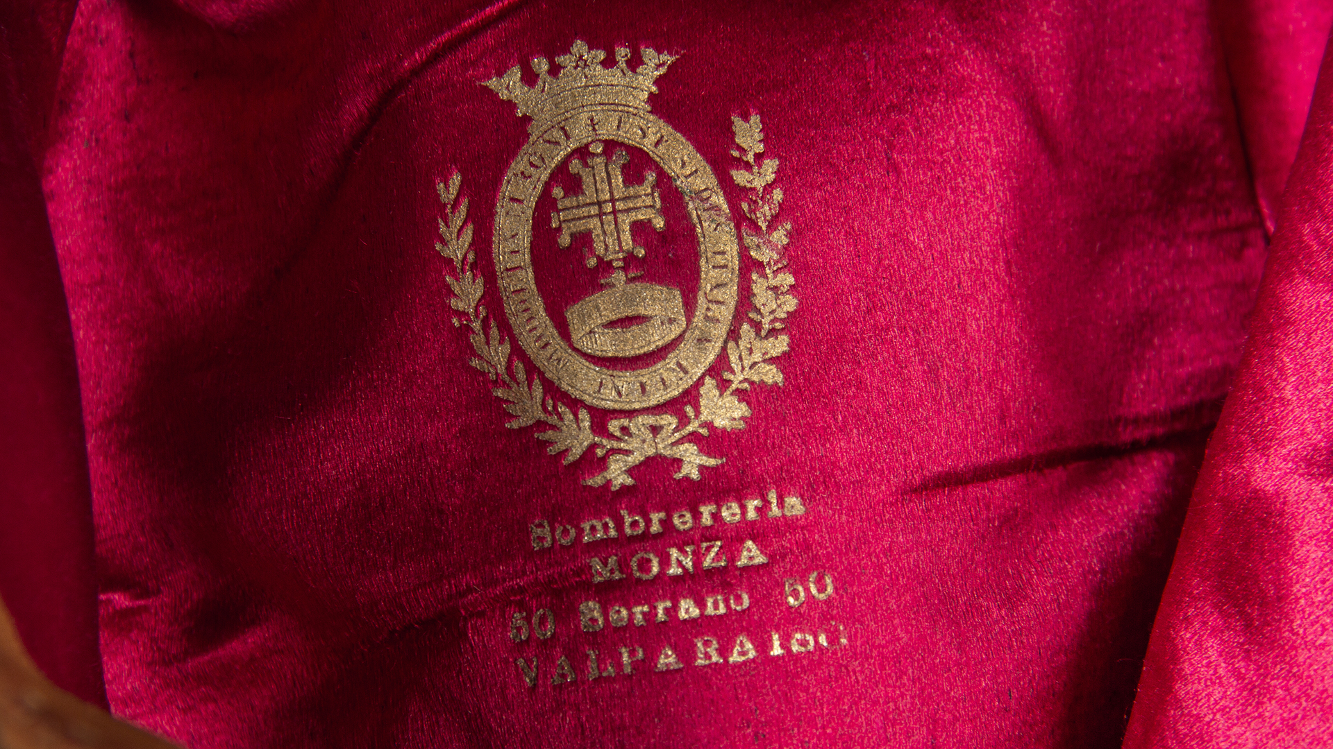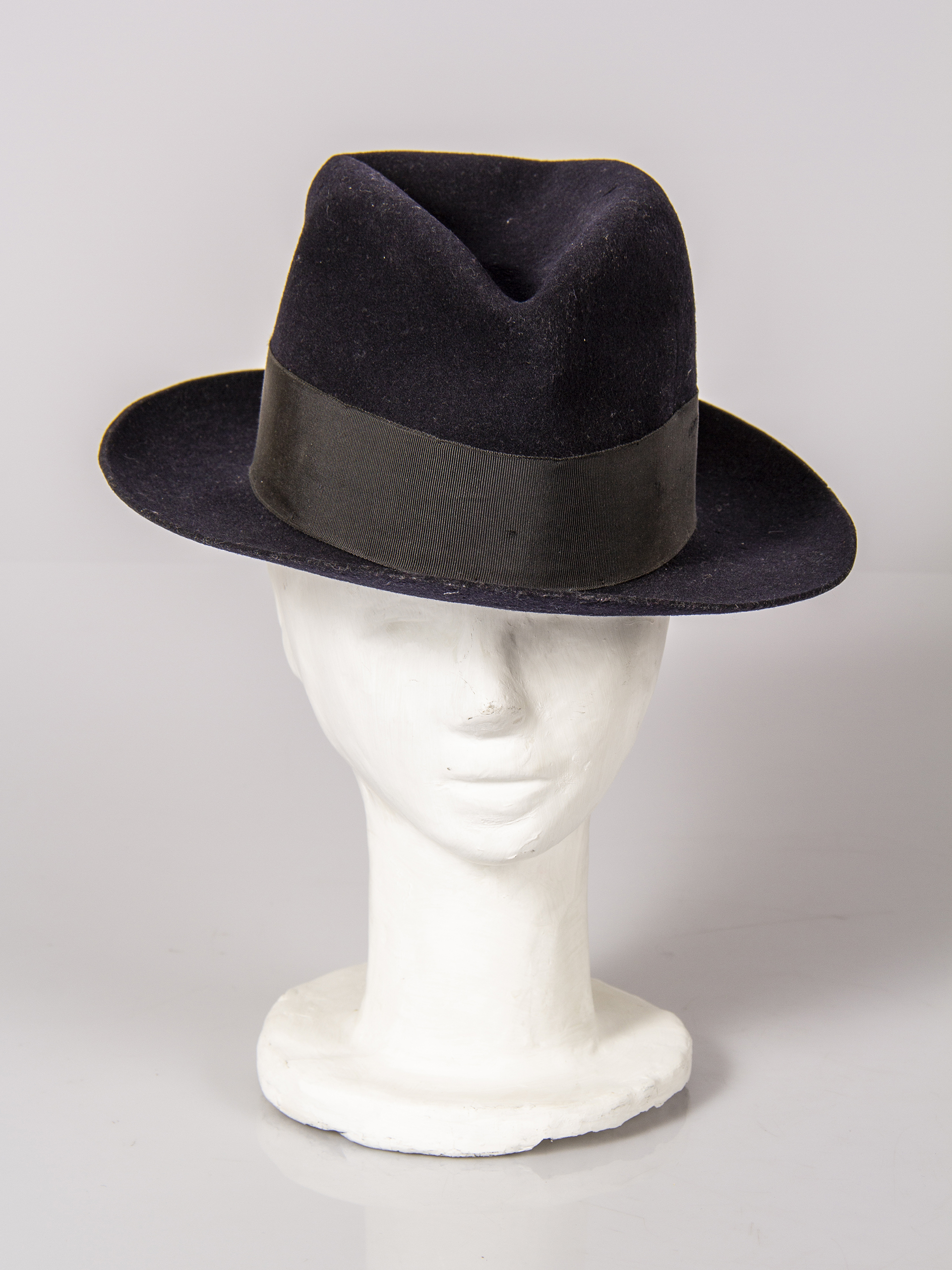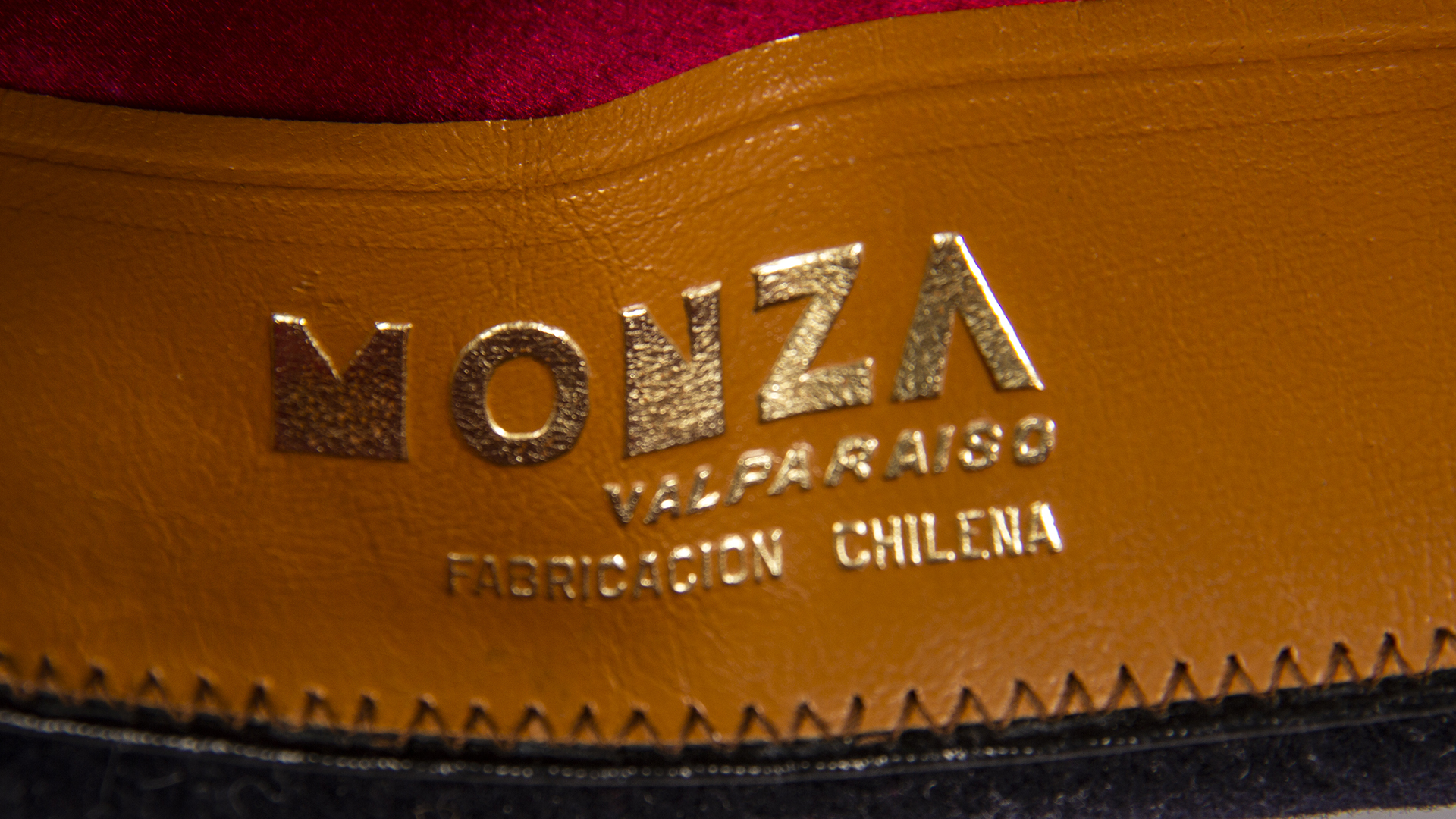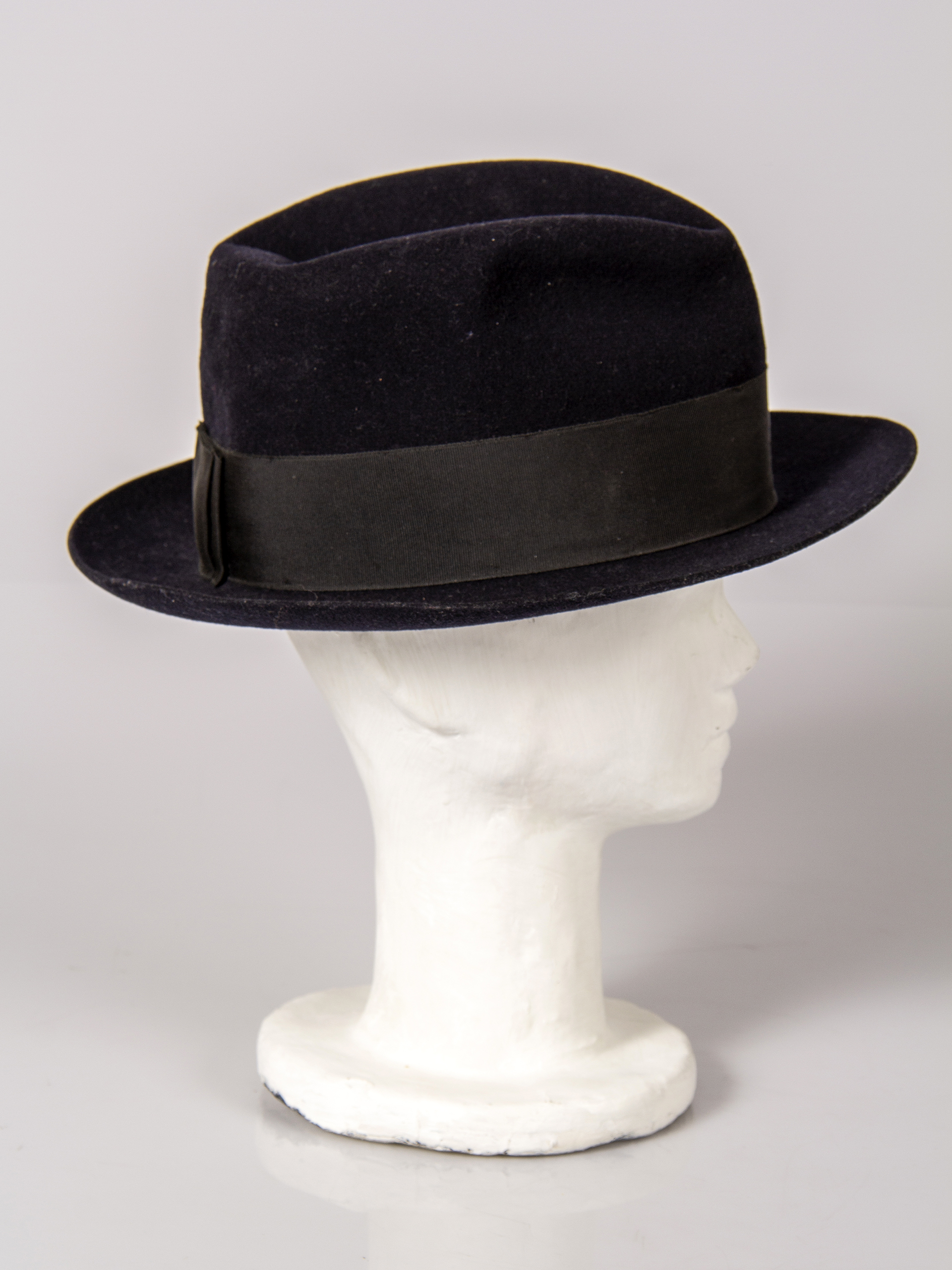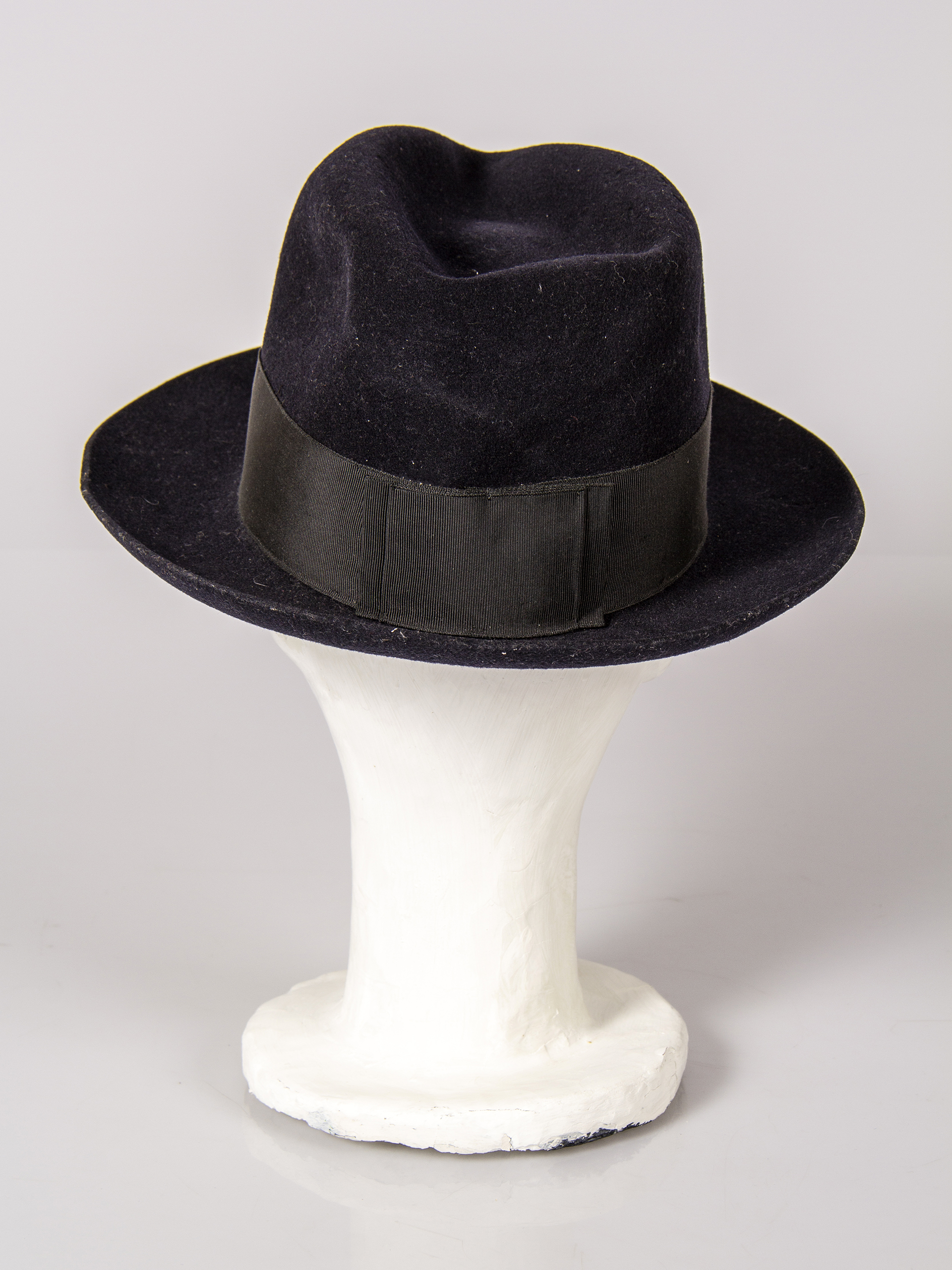 Sombrero de hombre de fieltro negro, con ala corta redonda, banda cinta negra ancha, marca MONZA, fábrica chilena que se ubicaba en Valparaíso en calle Serrano. Interior raso rojo, con borde cuero café en la que tiene impresa marca en dorado, y unas iniciales perforadas 'RHC'.