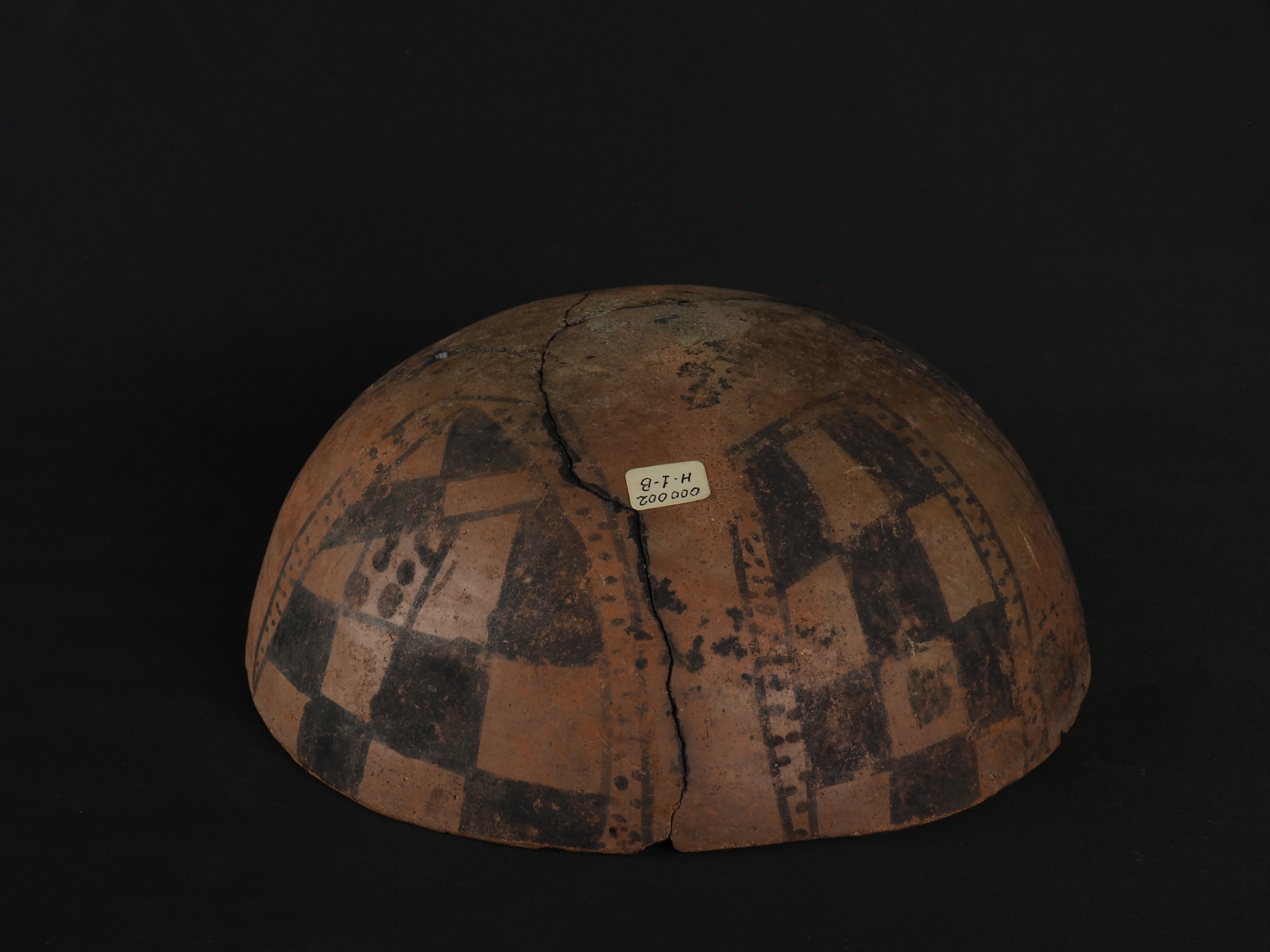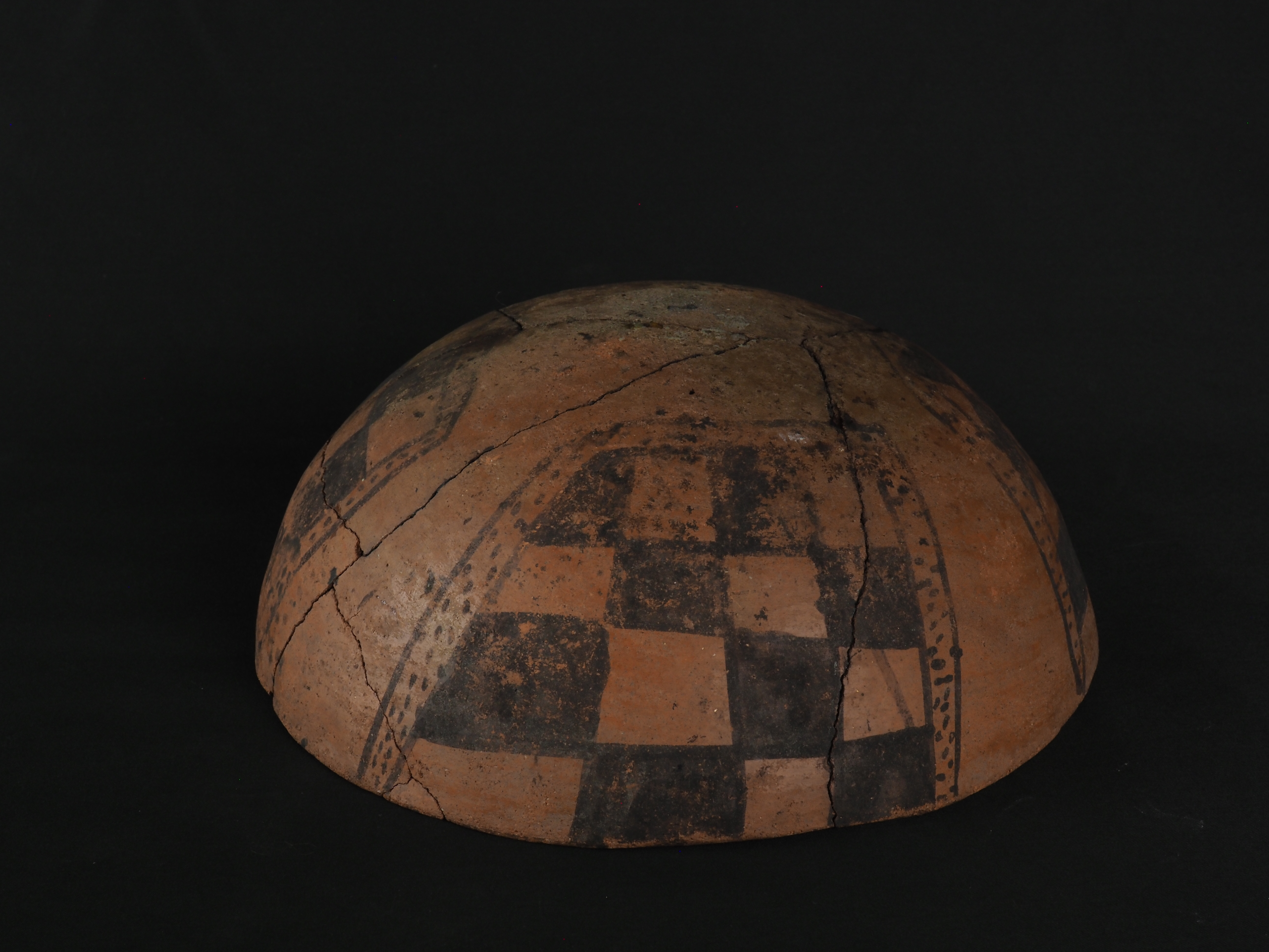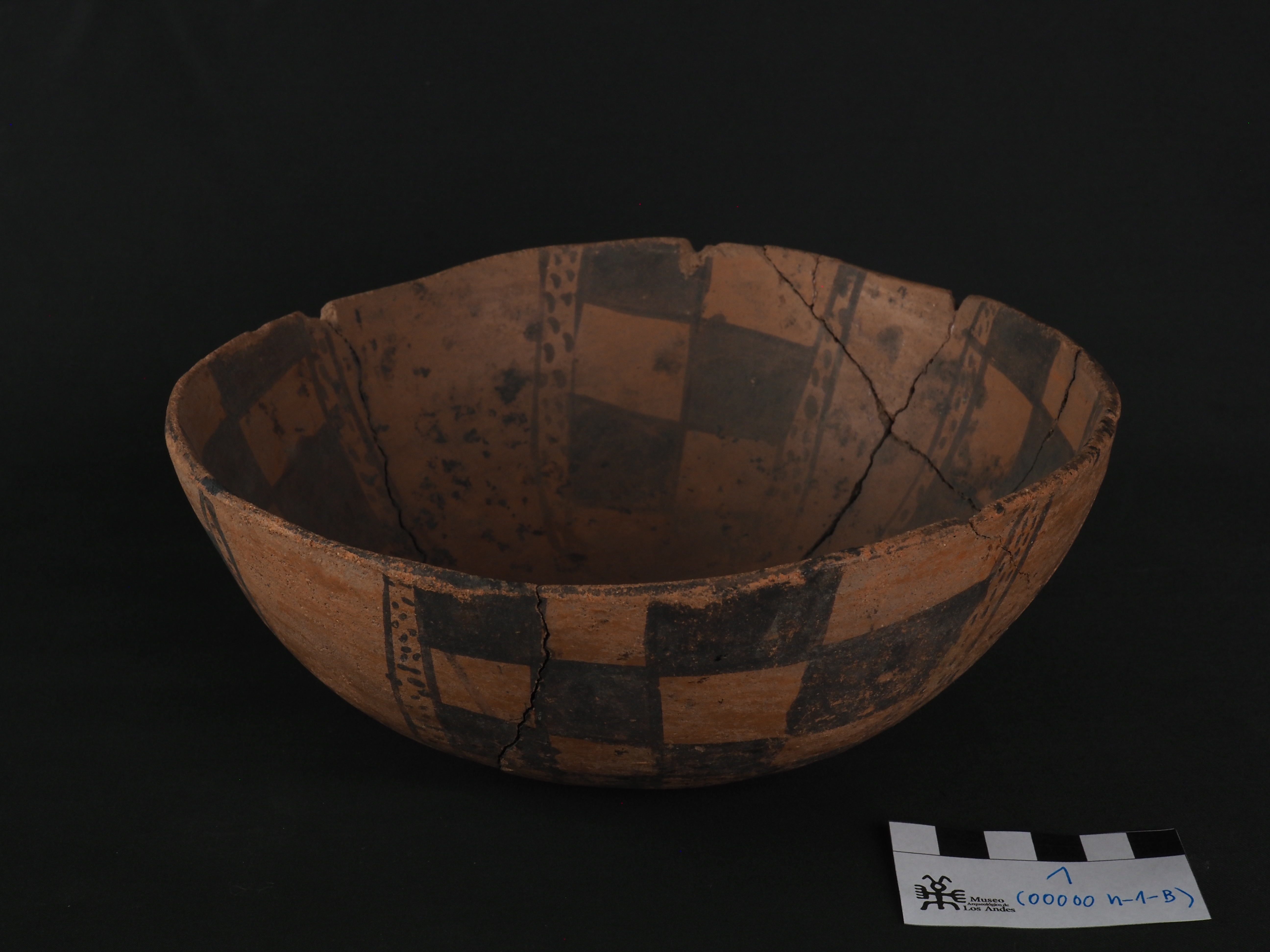 Contenedor abierto de perfil simple, se presenta en fragmentos unidos en su totalidad. Evidencia diseño de múltiples escaques en técnica decorativa “negro sobre salmón” tanto en su interior como en el exterior. Arcilla modelada, alisada y pulida. Técnica: cerámica pintada, decorada con iconografía geométrica en color negro.