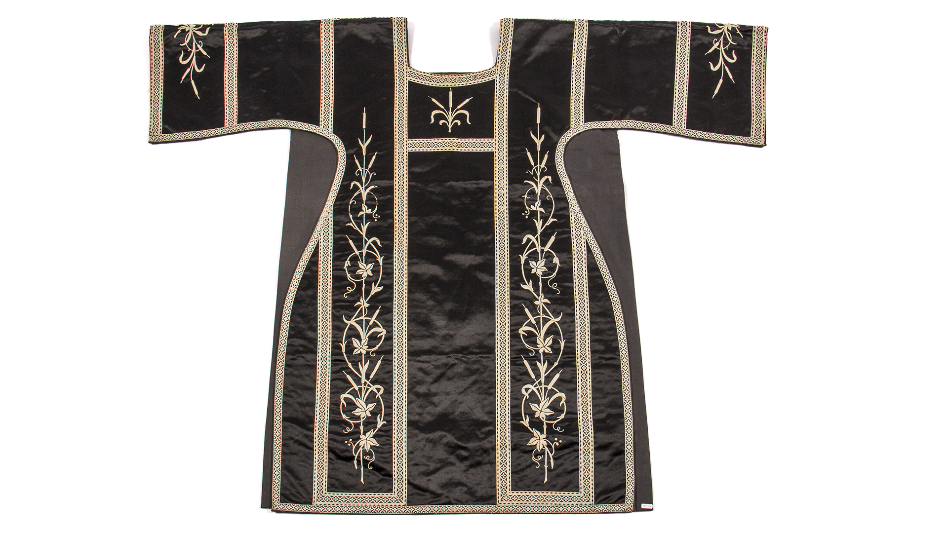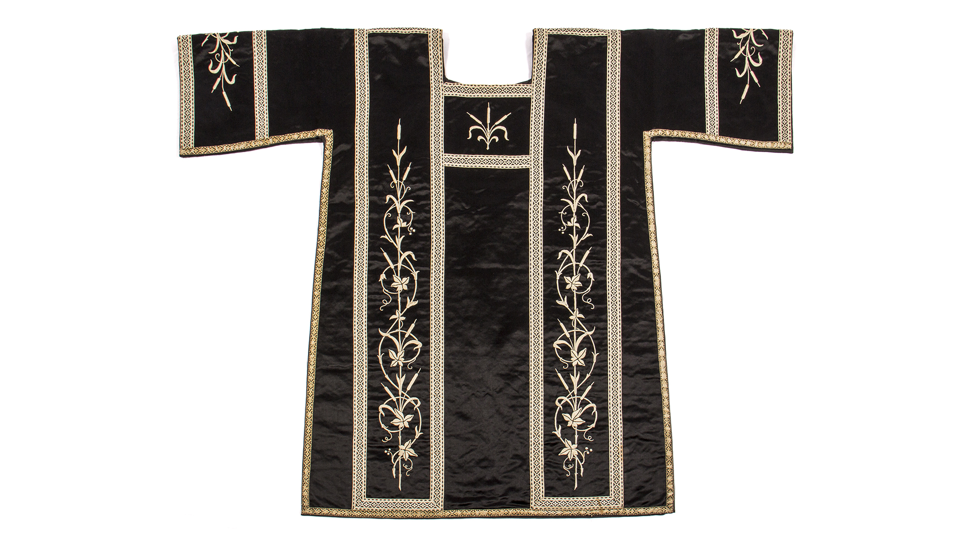 Black satin with embroidered metallic silver grape leaves, edges adorned with silver braids.