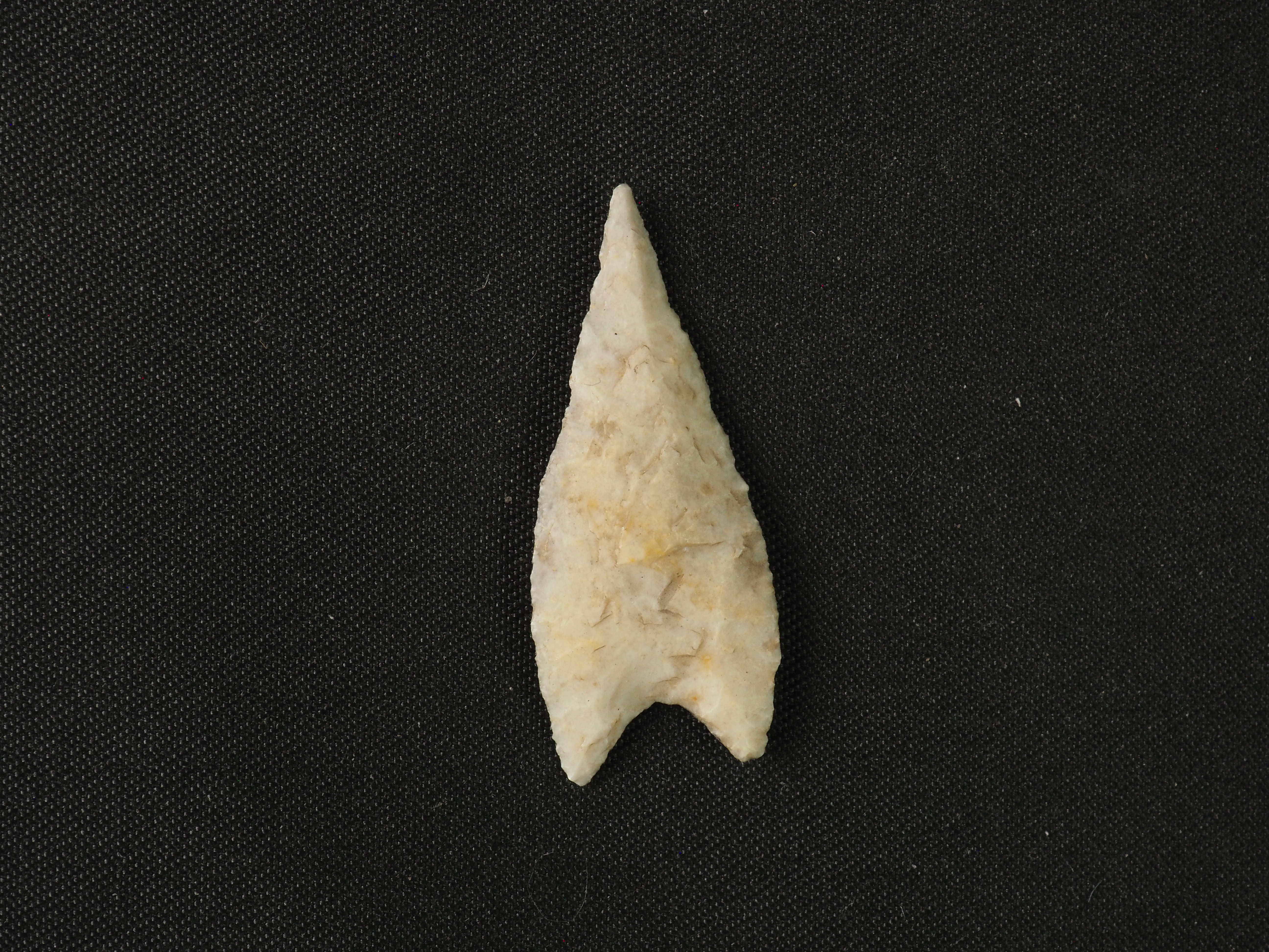 Instrumento de piedra tallada, monócromo de color blanco debido a la cualidad intrínseca de su materia prima mineral. Probable uso como elemento de caza de macrofauna. Técnica: Tallado. Morfología: Objeto lítico con limbo de forma lanceolada apedunculada. Posee dos aletas. Su extremo distal es terminante en punta y sección transversal biconvexa. Se encuentra erosionado.