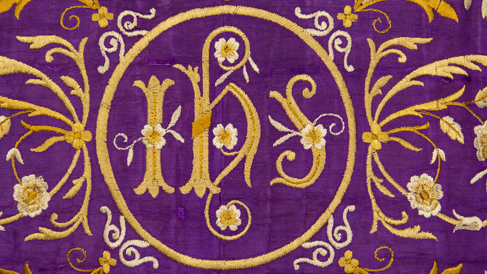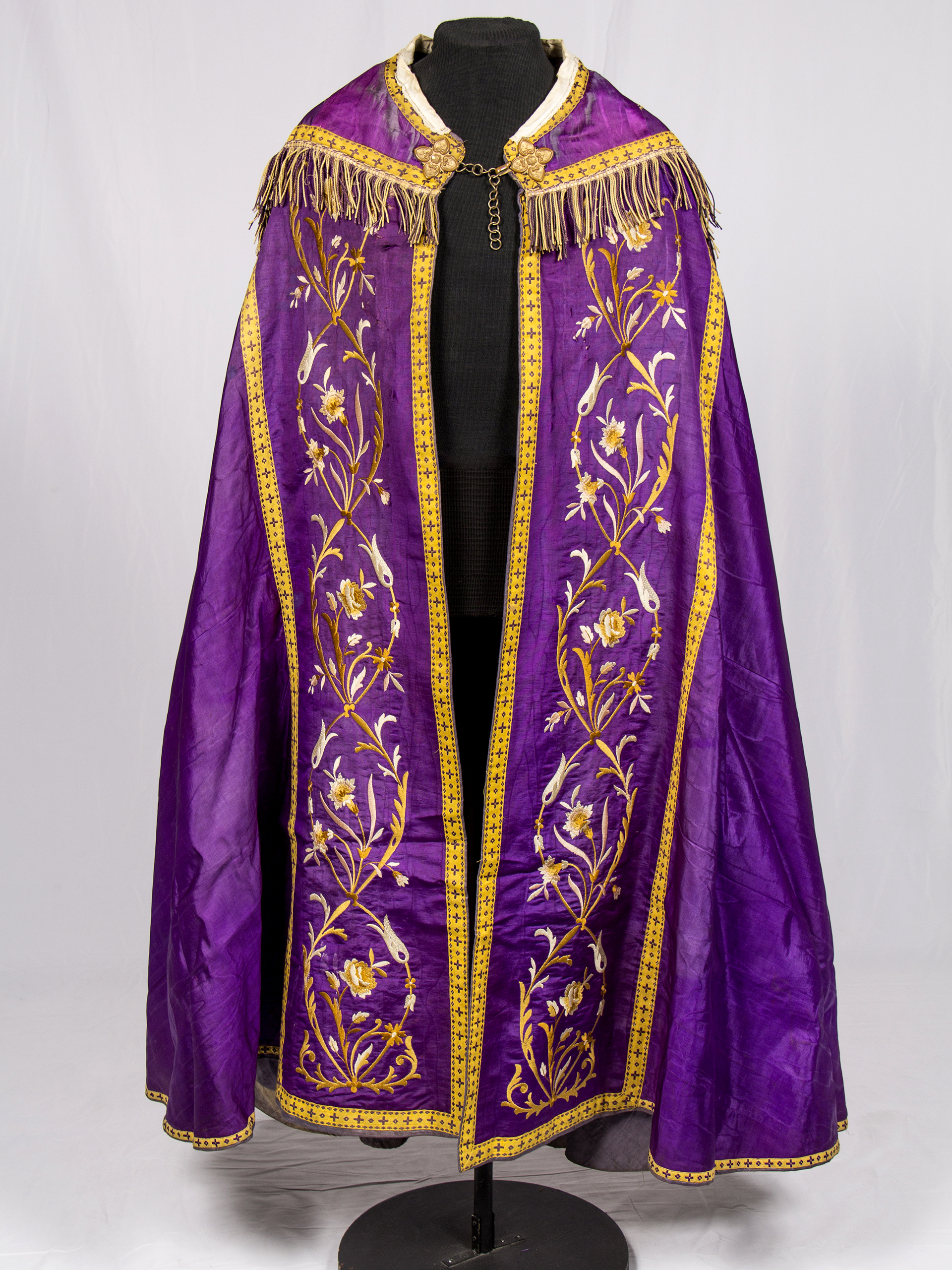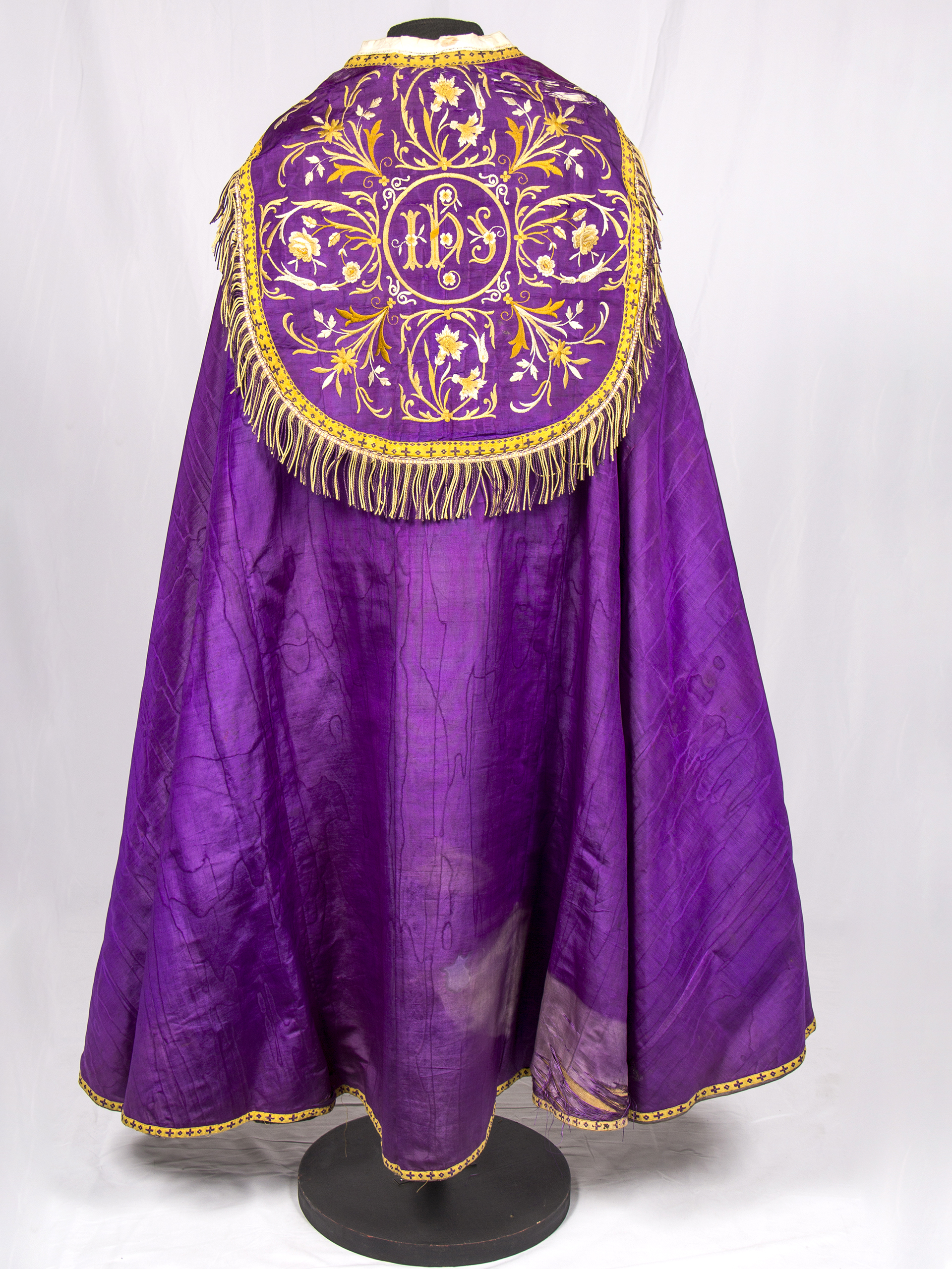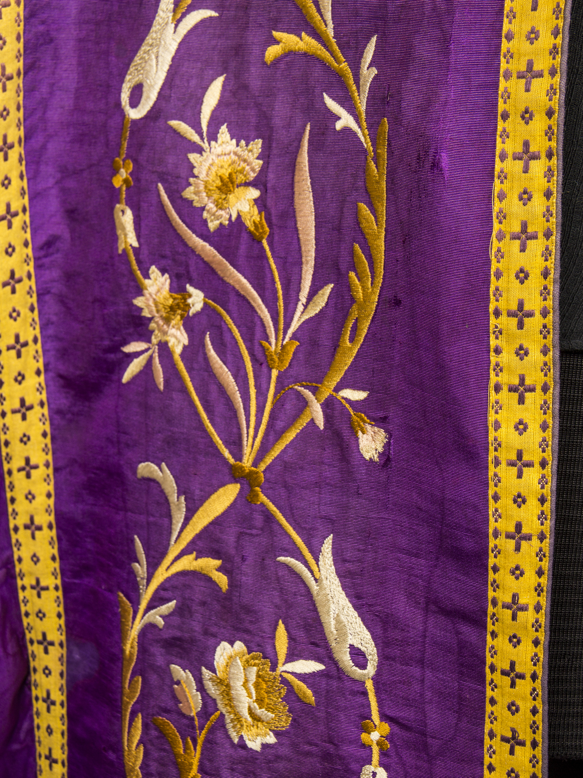 Purple stole with gold floral embroideries on the front edges and back. Golden galloon on the edges. Burn mark from iron on the lower right back.