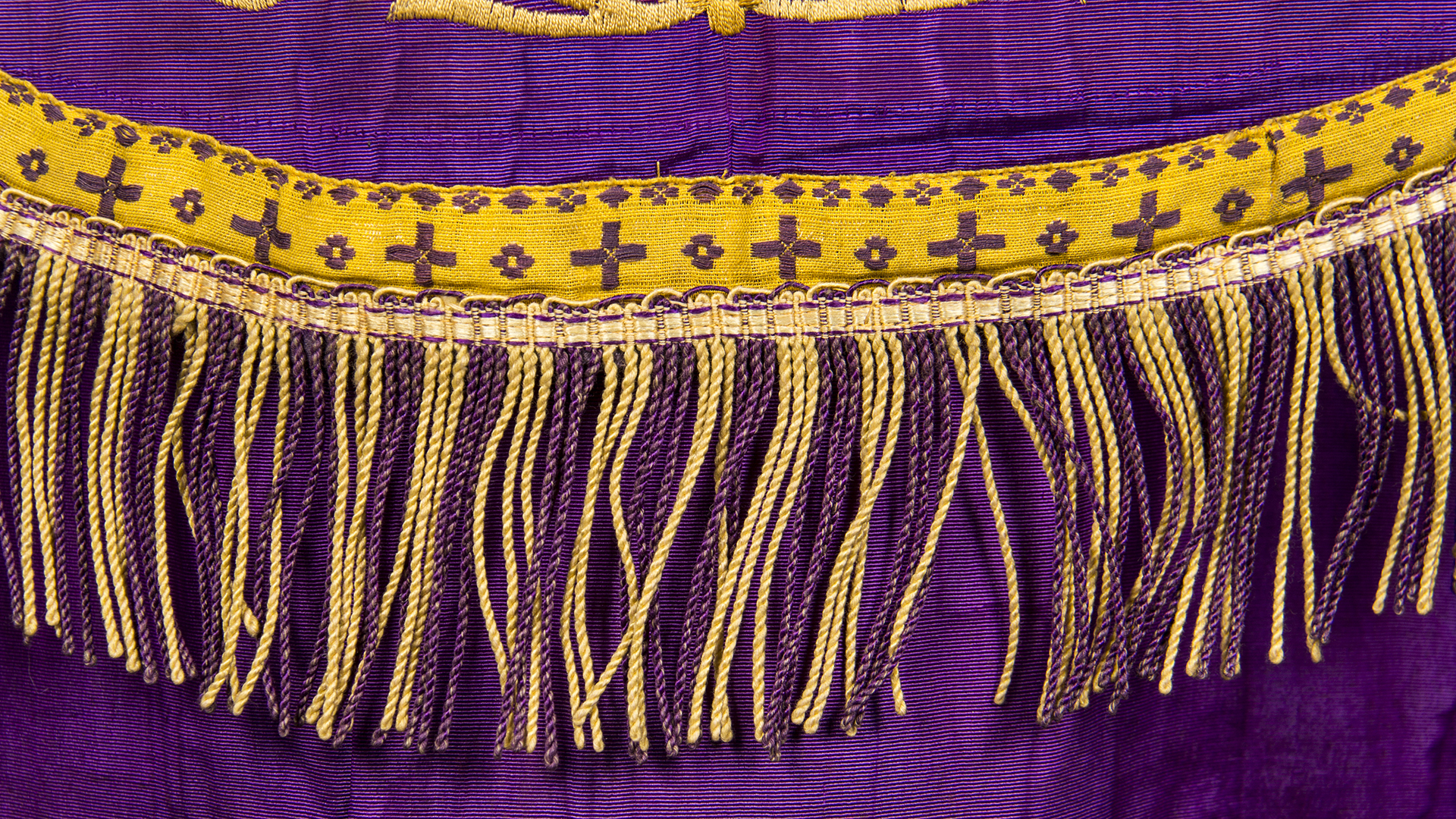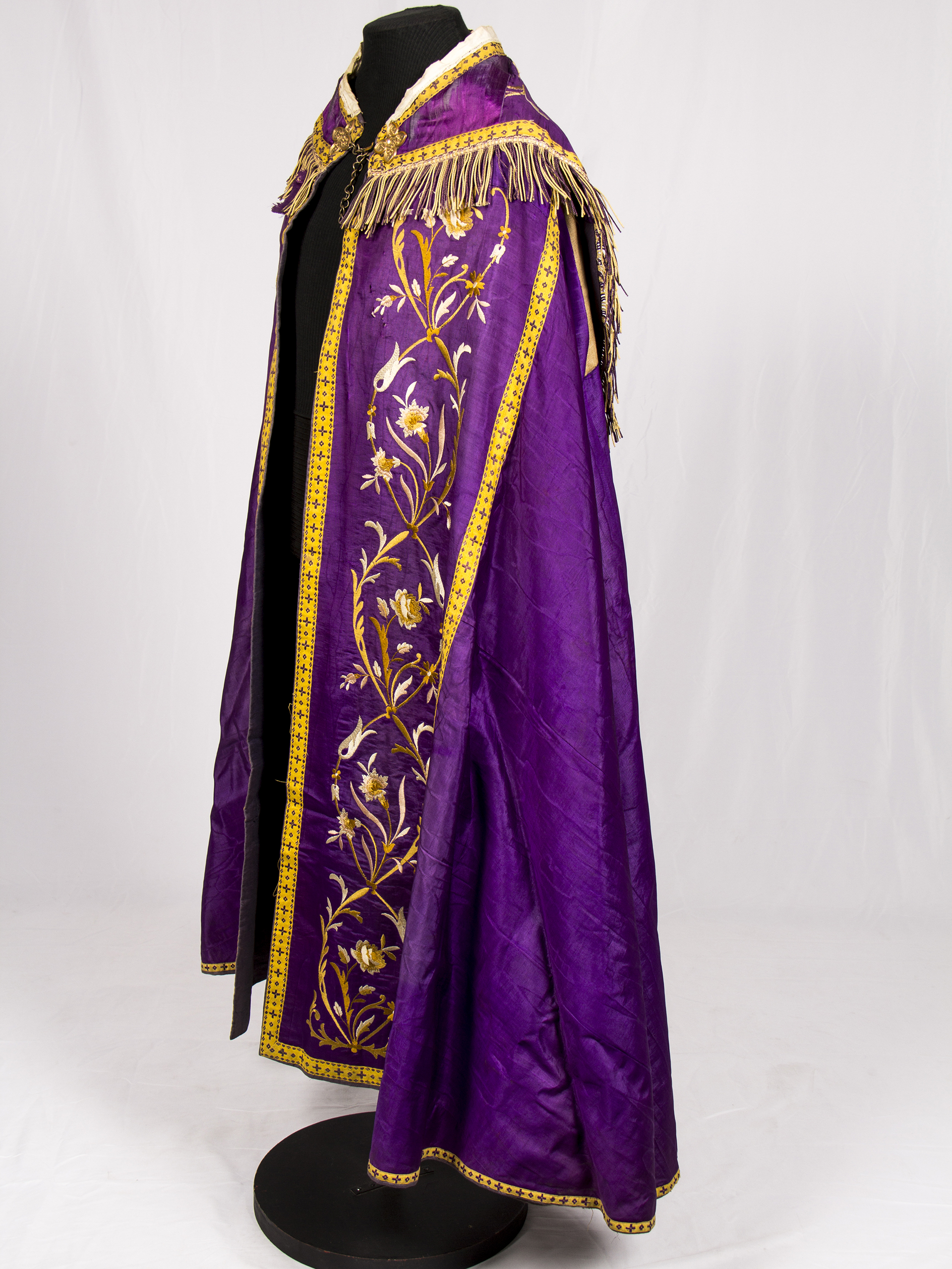 Falla morada con bordados florales dorados en bordes delanteros y espalda. Contorno con galón dorado. Marca de quemadura por plancha en espalda costado inferior derecho.