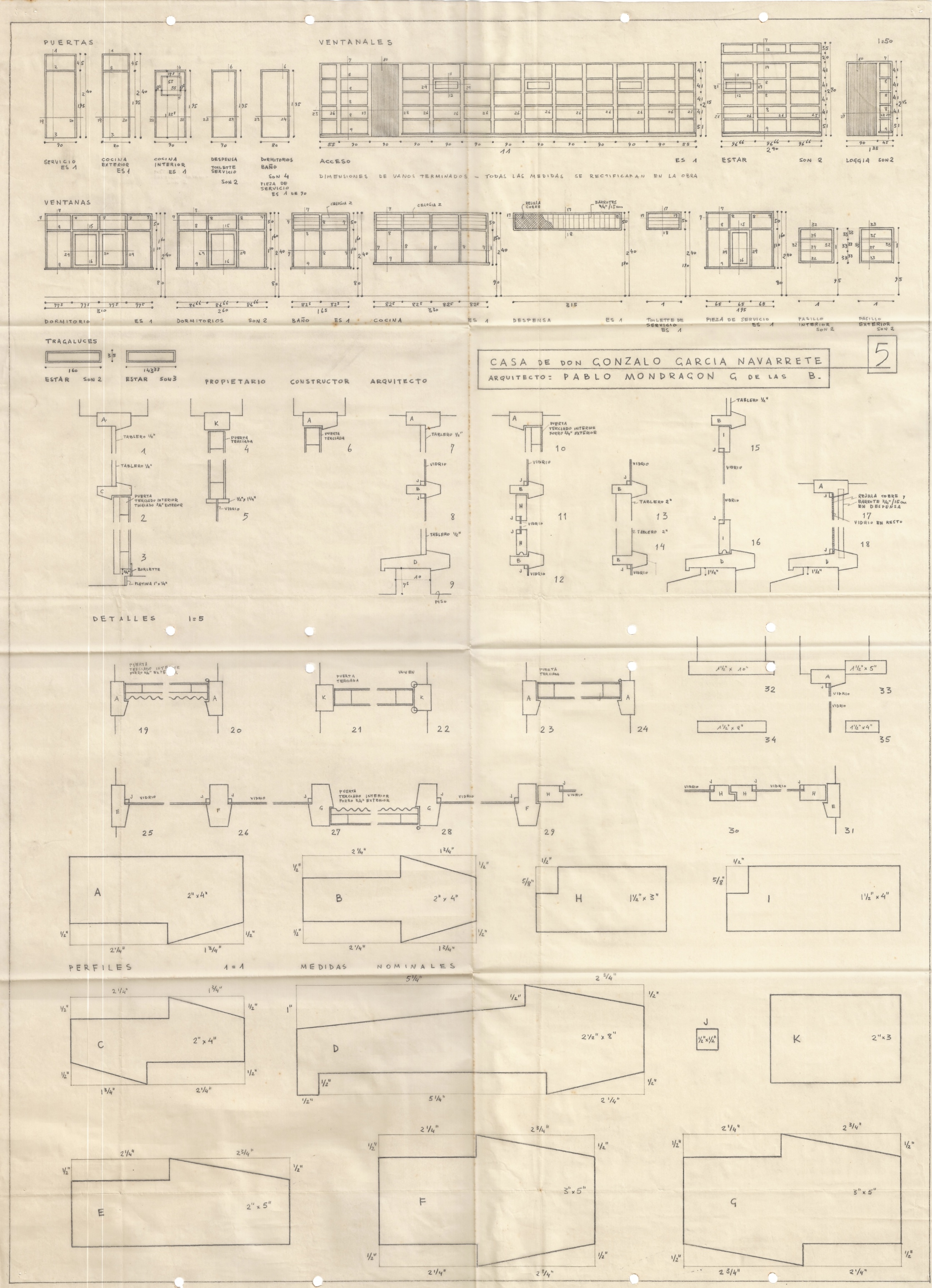 El proyecto de la Casa de Don Gonzalo García Navarrete está conformado por un conjunto de planos arquitectónicos. Incluye un plano con los detalles de planta en escala 1:50 y la ubicación general en escala 1:5000. Se incorpora también el plano de fachadas poniente, oriente, norte y sur, desarrollado en escala 1:50. El conjunto se completa con el corte en escala 1:50 y los detalles de cimientos en escala 1:15, además de un plano con detalles constructivos en escala 1:20, el cual incluye un resumen de los cálculos de hormigón armado. Finalmente, se integran los planos con los detalles de ventanales y tragaluces en escala 1:15, y los detalles de chimenea y muebles, con lo cual se documenta íntegramente la solución arquitectónica y estructural de la vivienda.