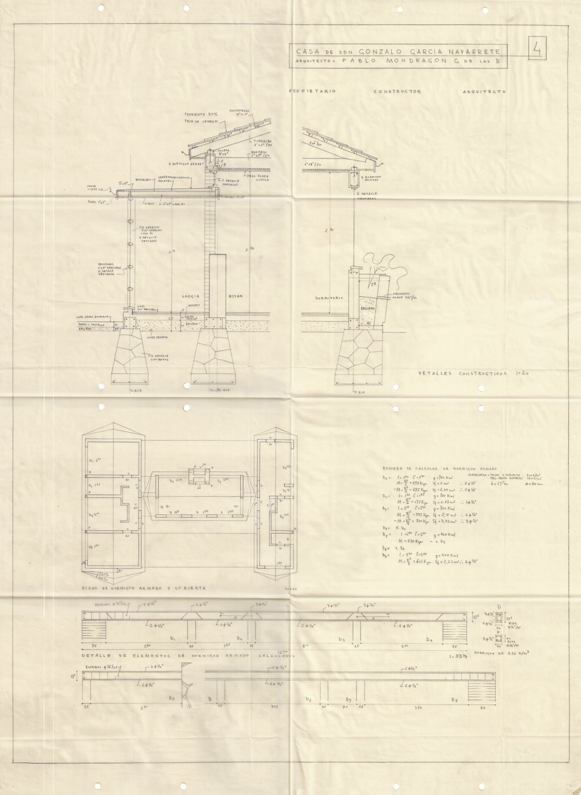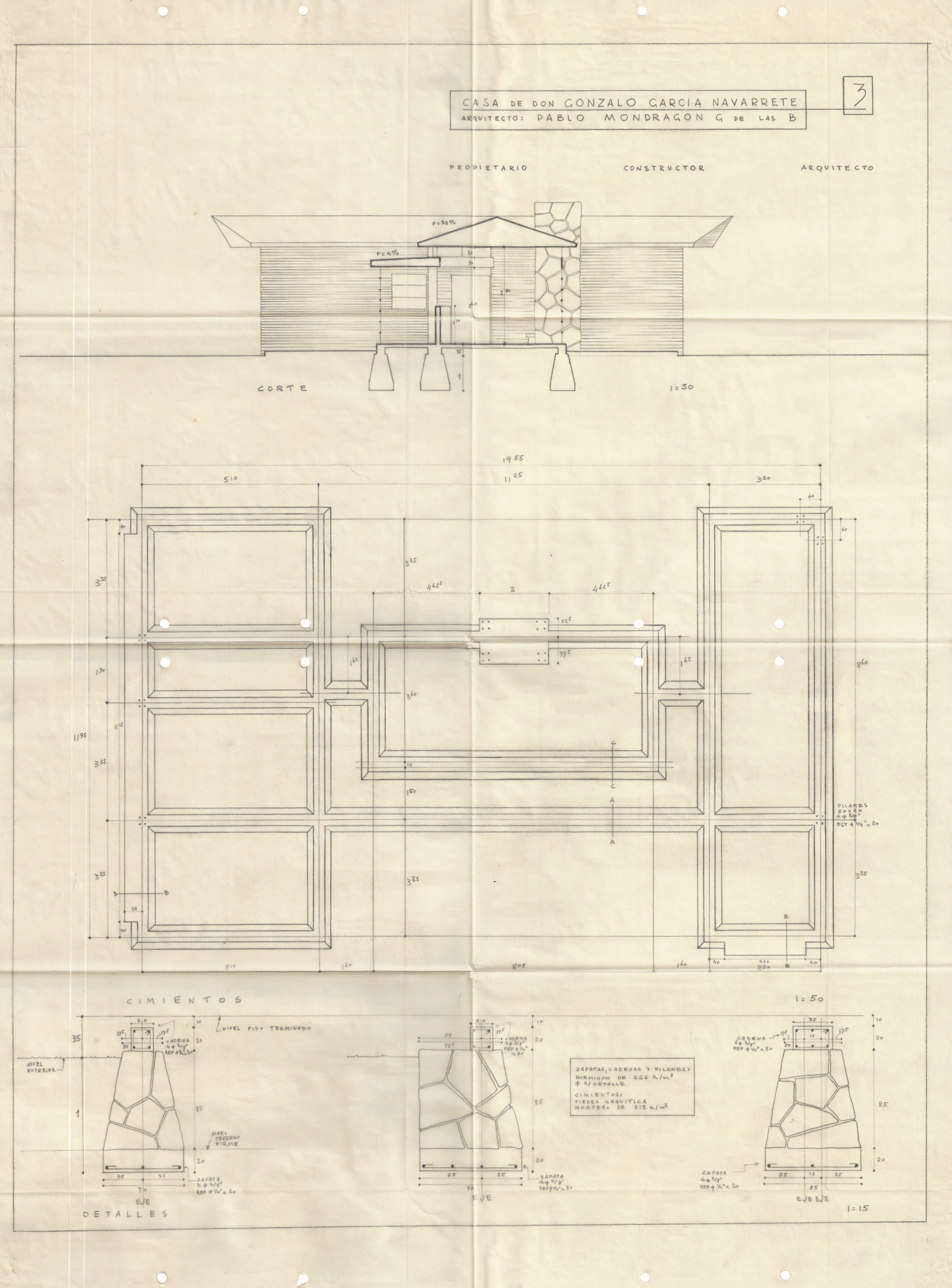 dc.description.abstract | dc.description.abstract | El proyecto de la Casa de Don Gonzalo García Navarrete está conformado por un conjunto de planos arquitectónicos. Incluye un plano con los detalles de planta en escala 1:50 y la ubicación general en escala 1:5000. Se incorpora también el plano de fachadas poniente, oriente, norte y sur, desarrollado en escala 1:50. El conjunto se completa con el corte en escala 1:50 y los detalles de cimientos en escala 1:15, además de un plano con detalles constructivos en escala 1:20, el cual incluye un resumen de los cálculos de hormigón armado. Finalmente, se integran los planos con los detalles de ventanales y tragaluces en escala 1:15, y los detalles de chimenea y muebles, con lo cual se documenta íntegramente la solución arquitectónica y estructural de la vivienda. | |