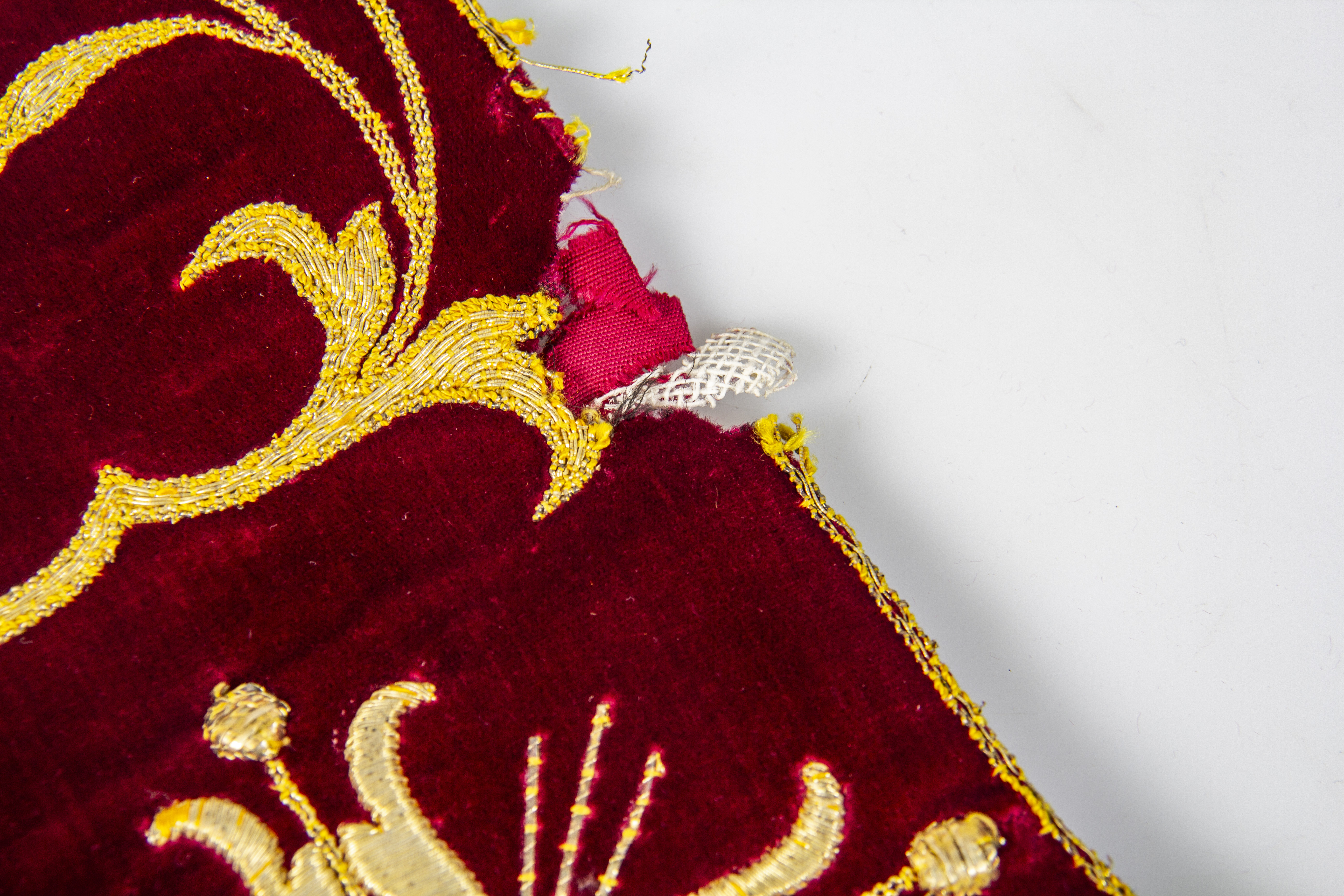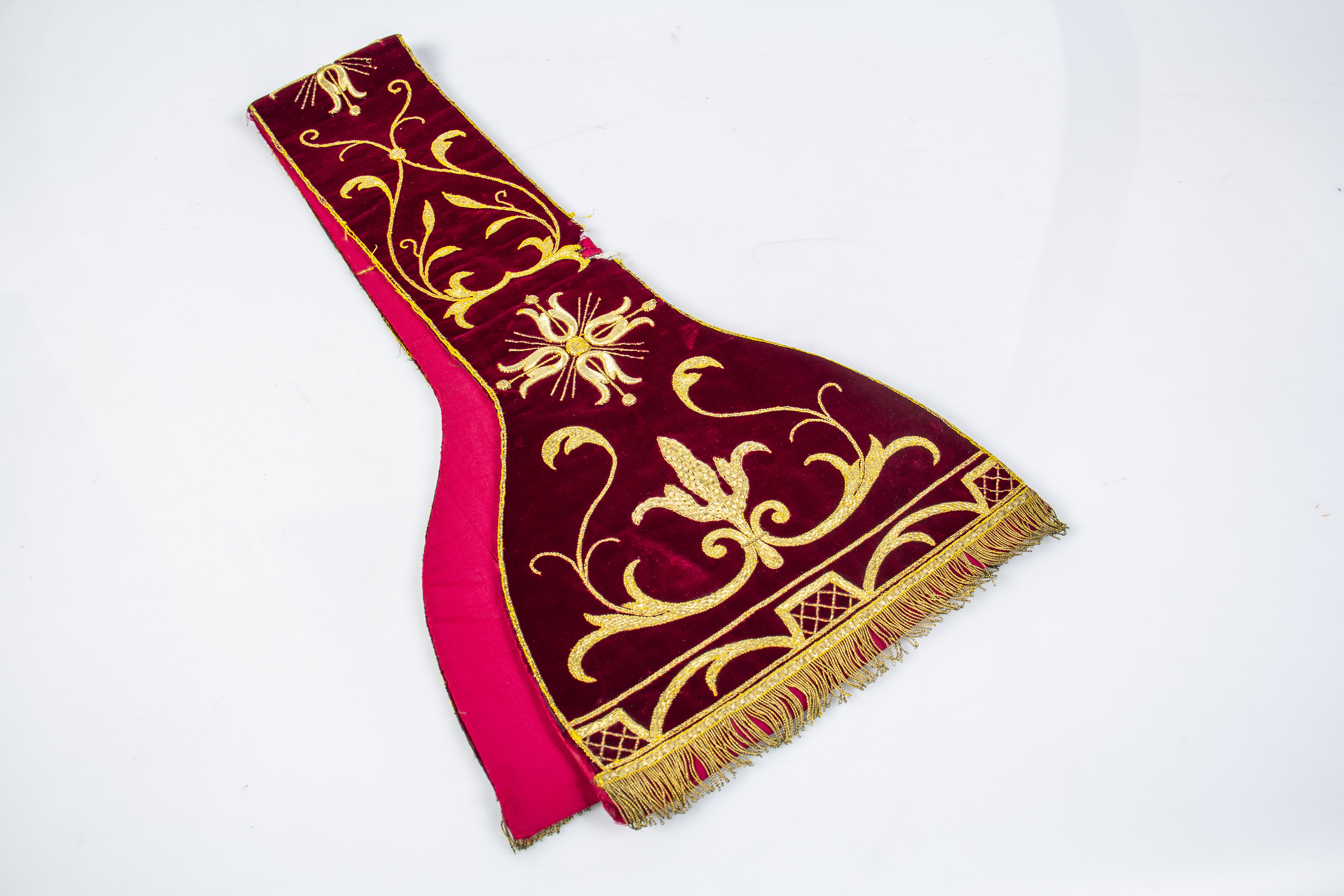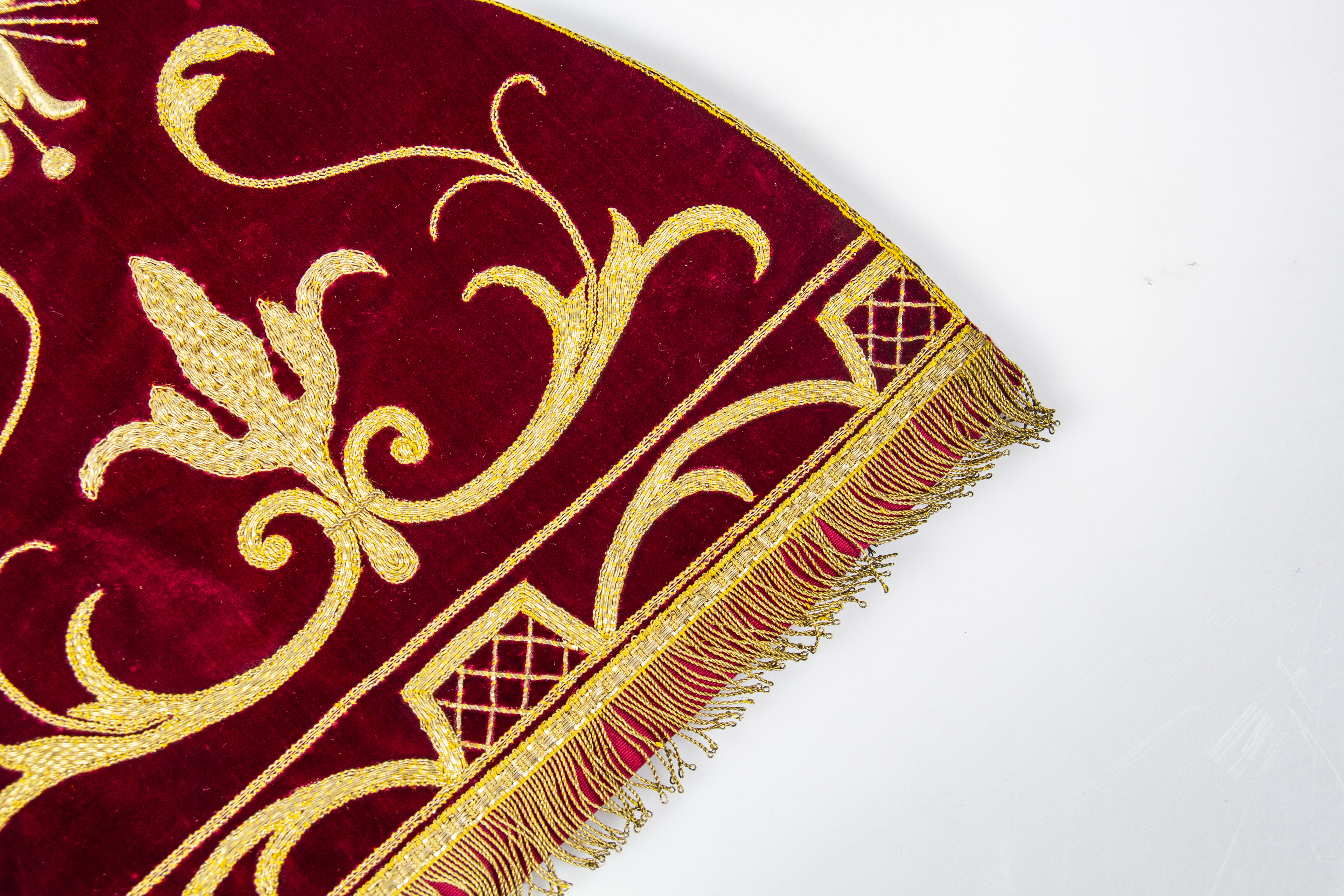 Dark red plush with golden ornamental embroidery, short golden fringes at the ends.