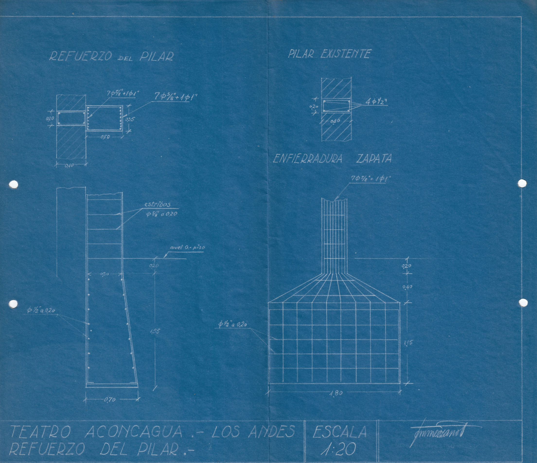 dc.description.abstract | dc.description.abstract | Conjunto de planos estructurales del Teatro Aconcagua de Los Andes, que incluyen: el Plano 1, que muestra detalles del muro de la sala, incluyendo colocación de pizarreño (escala 1:50), refuerzos de platino (escala 1:20) y elevación abatida (escala 1:200); el Plano 2, que presenta el refuerzo del pilar en escala 1:20; el Plano 3, que contiene las dimensiones de la cercha y la distancia entre cerchas de 3 metros en escala 1:50; el Plano 4, que representa las tensiones debidas a cargas verticales, viento y tensiones máximas en escala 1 cm = 0,2 T; el Plano 5, que muestra modificaciones del edificio y el estado actual de la bodega de Don Gregorio de la Fuente en escala 1:100; y el Plano 6, que incluye la fachada longitudinal del teatro y un corte longitudinal en escala 1:50; el Plano 7, que presenta las plantas del edificio en escala 1:50; y el Plano 8, que contiene detalles constructivos en escala 1:10. | |