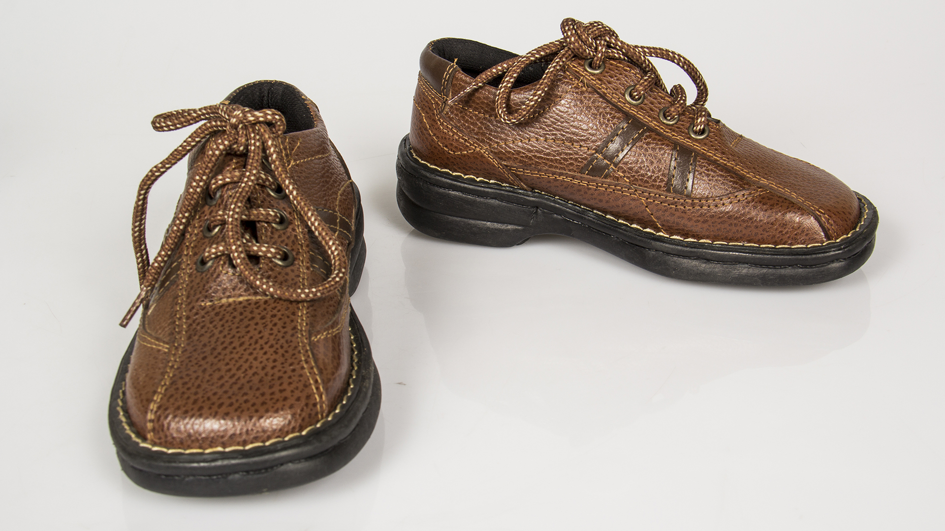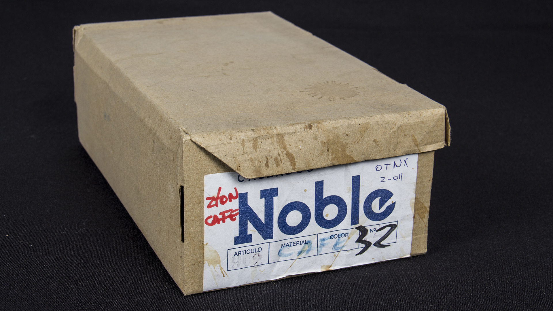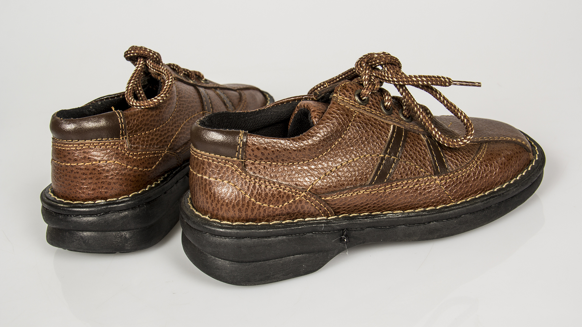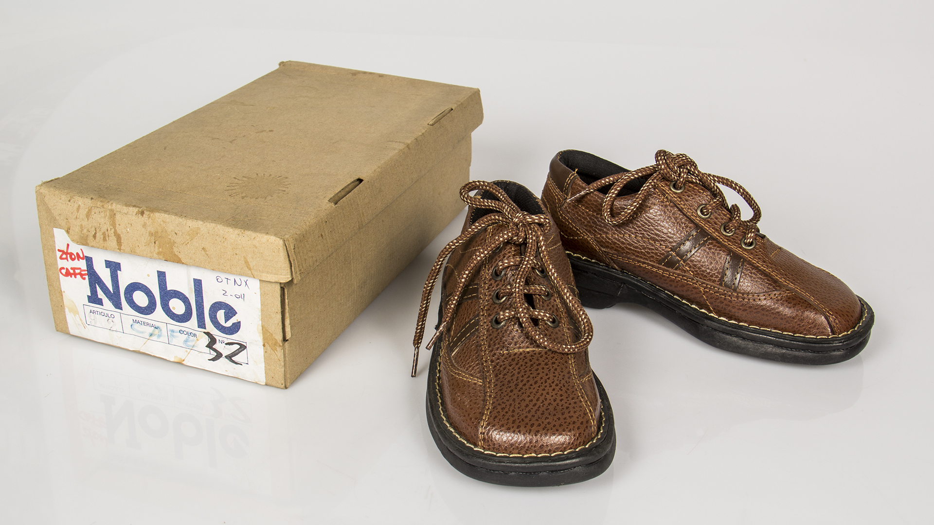 Zapatos de niño de cuero café con cordones y suela de PVC negro, costuras ornamentales en tono más claro. Talla 32, línea "Wall Street", marca Noble, fabricado por Juan González Muñoz, fábrica ubicada en Cerro Las Delicias Valparaíso, fundada por el padre y continuada por su hijo. Viene con caja original.