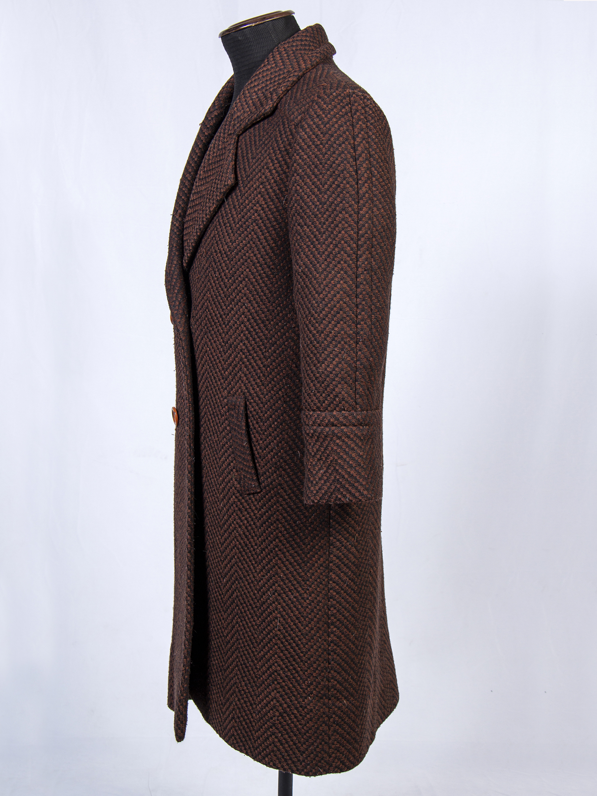 Woman's coat, brown and black in color, with 4 front buttons. Herringbone effect fabric, Softweed wool-polyester from Bellavista Oveja Tomé. Manufactured by 'La Strada.' Made in Chile.