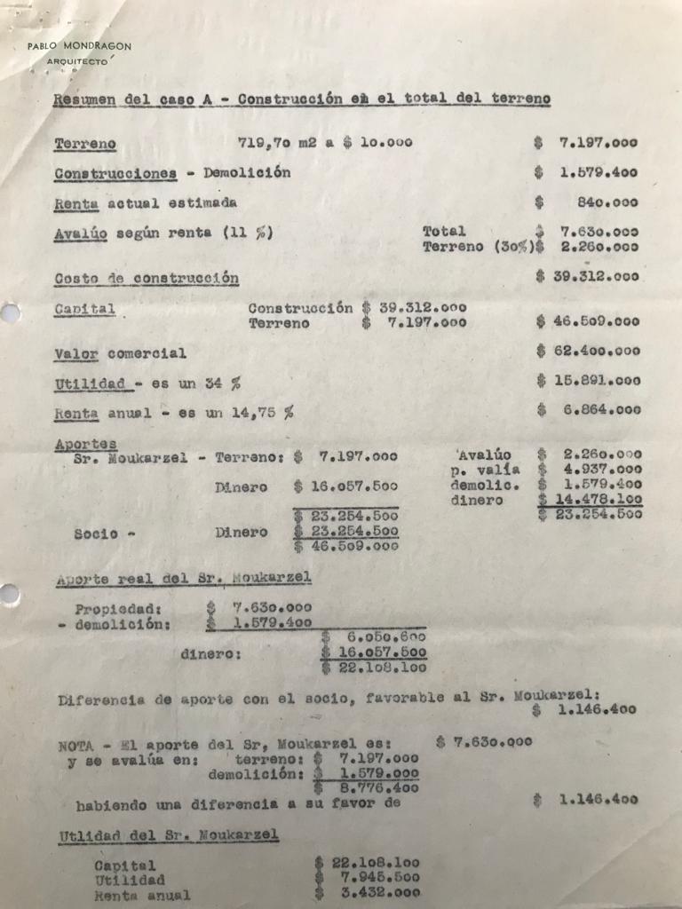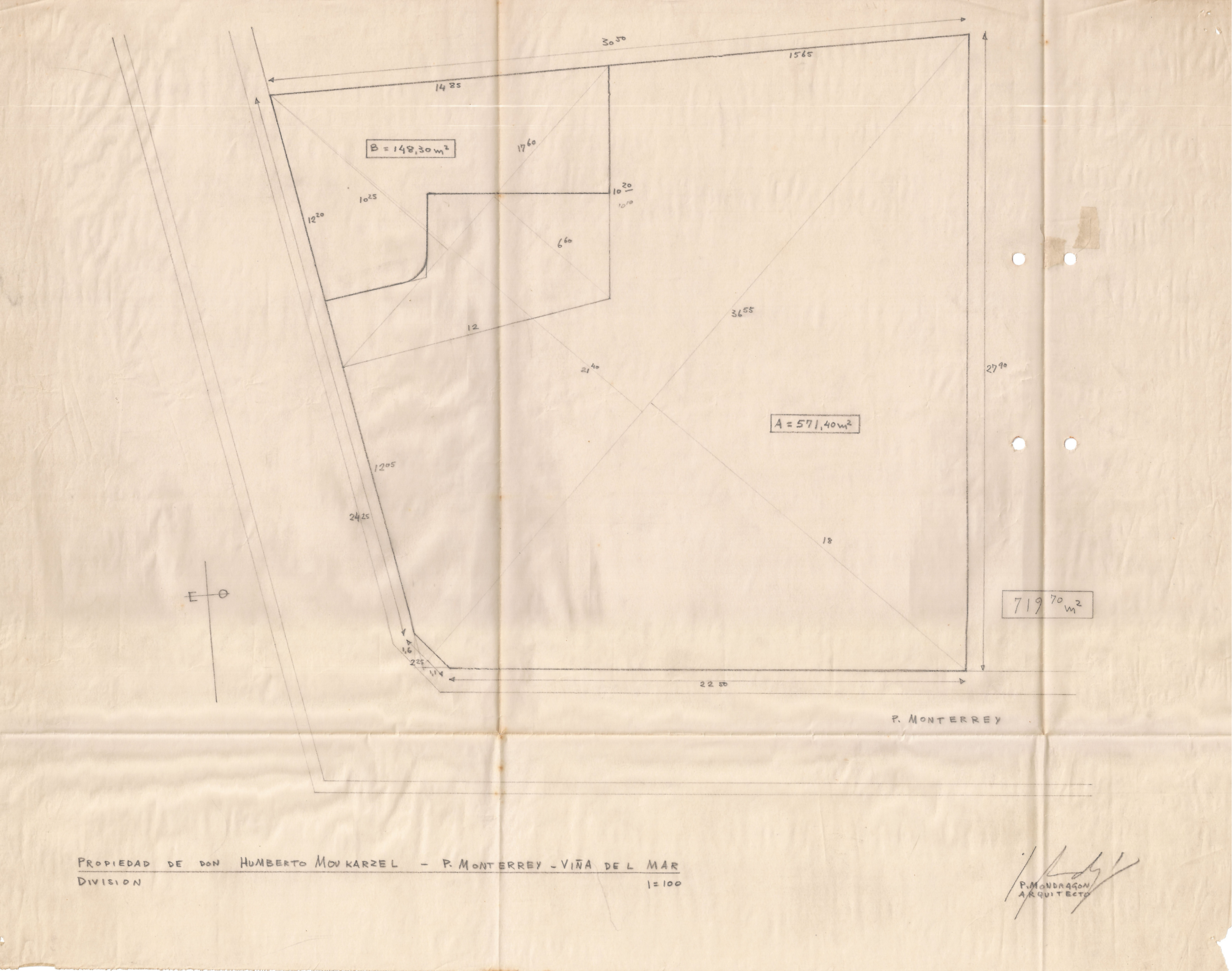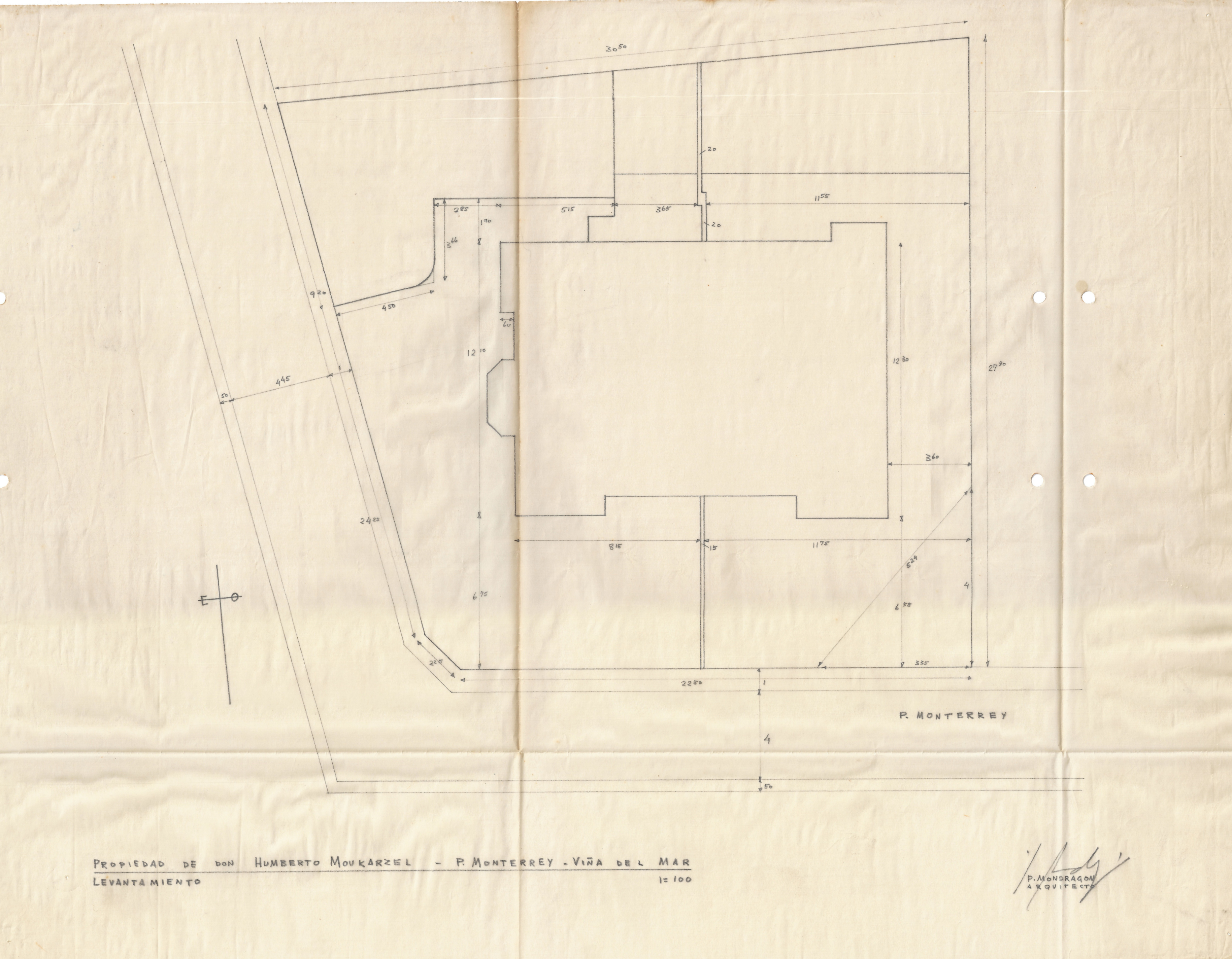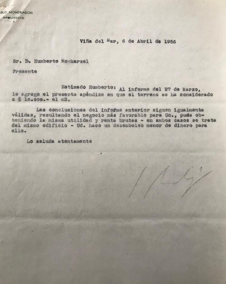 El proyecto Edificio Monterrey reúne documentación técnica asociada a la propiedad de Don Humberto Mourkarzel en Pasaje Monterrey, Viña del Mar, e incluye dos cartas: la “Carta a Don Humberto”, fechada el 15 de junio de 1956, que presenta el avalúo de la propiedad; y la “Carta a Sr. D. Humberto Mourkarzel”, fechada el 6 de abril de 1956, en la que se comunica una modificación del valor por metro cuadrado y se adjuntan presupuestos diferenciados para dos alternativas de proyecto. Se incorporan además los siguientes planos: plano de levantamiento y plano de división de la propiedad en escala 1:100; plano de ubicación del edificio Monterrey en escala 1:100; anteproyecto correspondiente a la planta del primer piso en escala 1:50; plano definitivo de la planta del primer piso en escala 1:50; plano detallado de superficies del segundo piso en escala 1:50; y un croquis de la fachada del anteproyecto asociado a la misma propiedad.