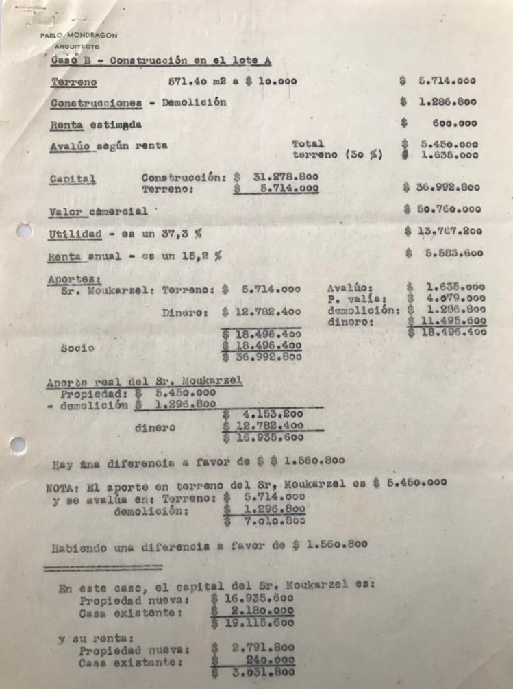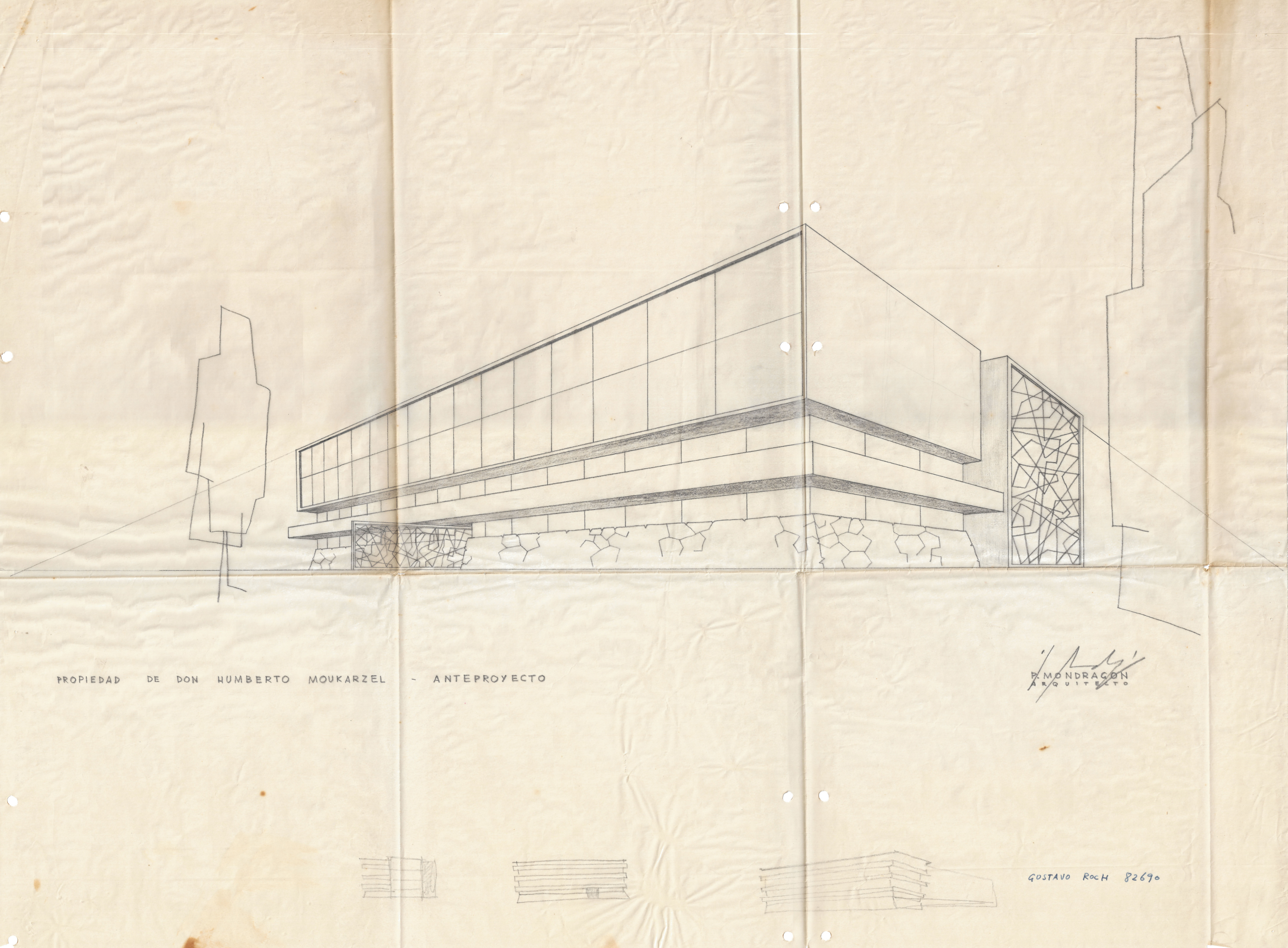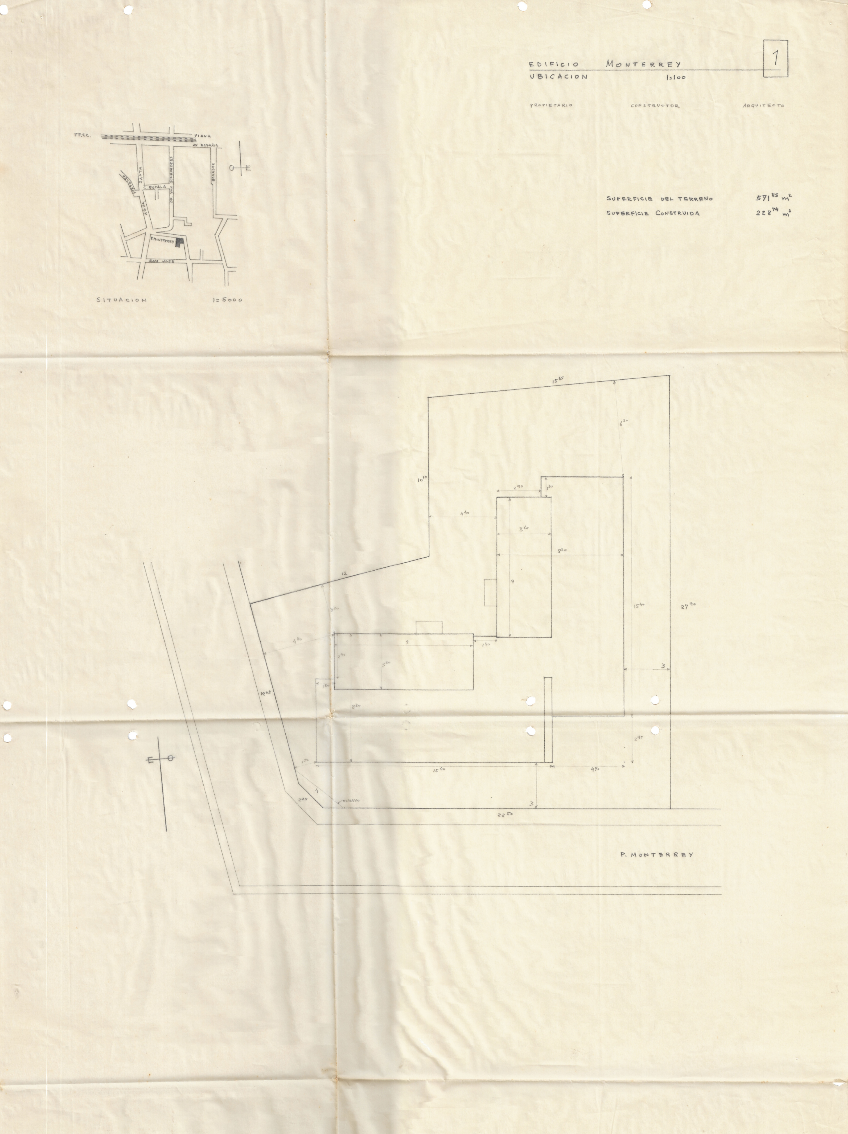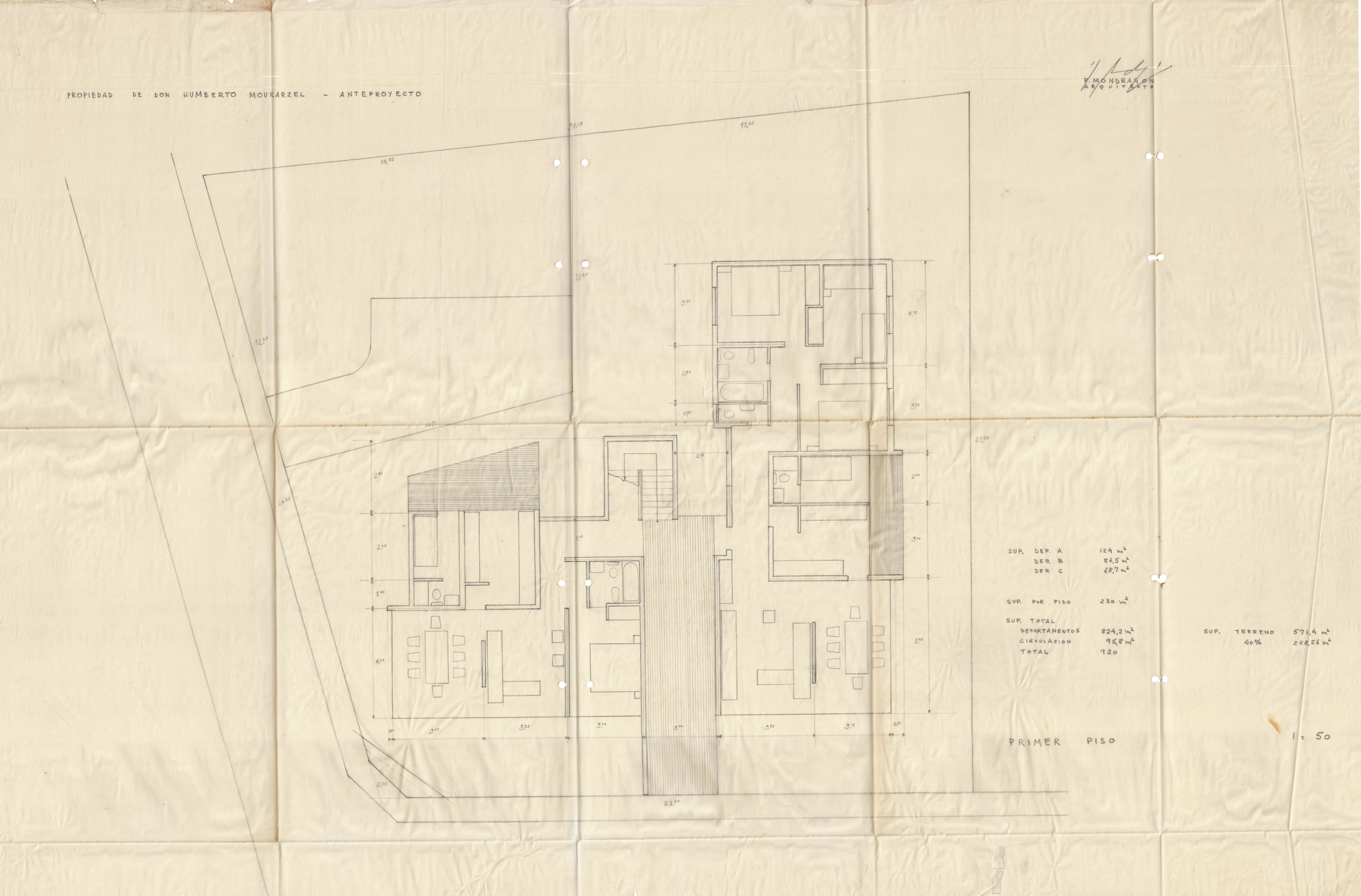 El proyecto Edificio Monterrey reúne documentación técnica asociada a la propiedad de Don Humberto Mourkarzel en Pasaje Monterrey, Viña del Mar, e incluye dos cartas: la “Carta a Don Humberto”, fechada el 15 de junio de 1956, que presenta el avalúo de la propiedad; y la “Carta a Sr. D. Humberto Mourkarzel”, fechada el 6 de abril de 1956, en la que se comunica una modificación del valor por metro cuadrado y se adjuntan presupuestos diferenciados para dos alternativas de proyecto. Se incorporan además los siguientes planos: plano de levantamiento y plano de división de la propiedad en escala 1:100; plano de ubicación del edificio Monterrey en escala 1:100; anteproyecto correspondiente a la planta del primer piso en escala 1:50; plano definitivo de la planta del primer piso en escala 1:50; plano detallado de superficies del segundo piso en escala 1:50; y un croquis de la fachada del anteproyecto asociado a la misma propiedad.