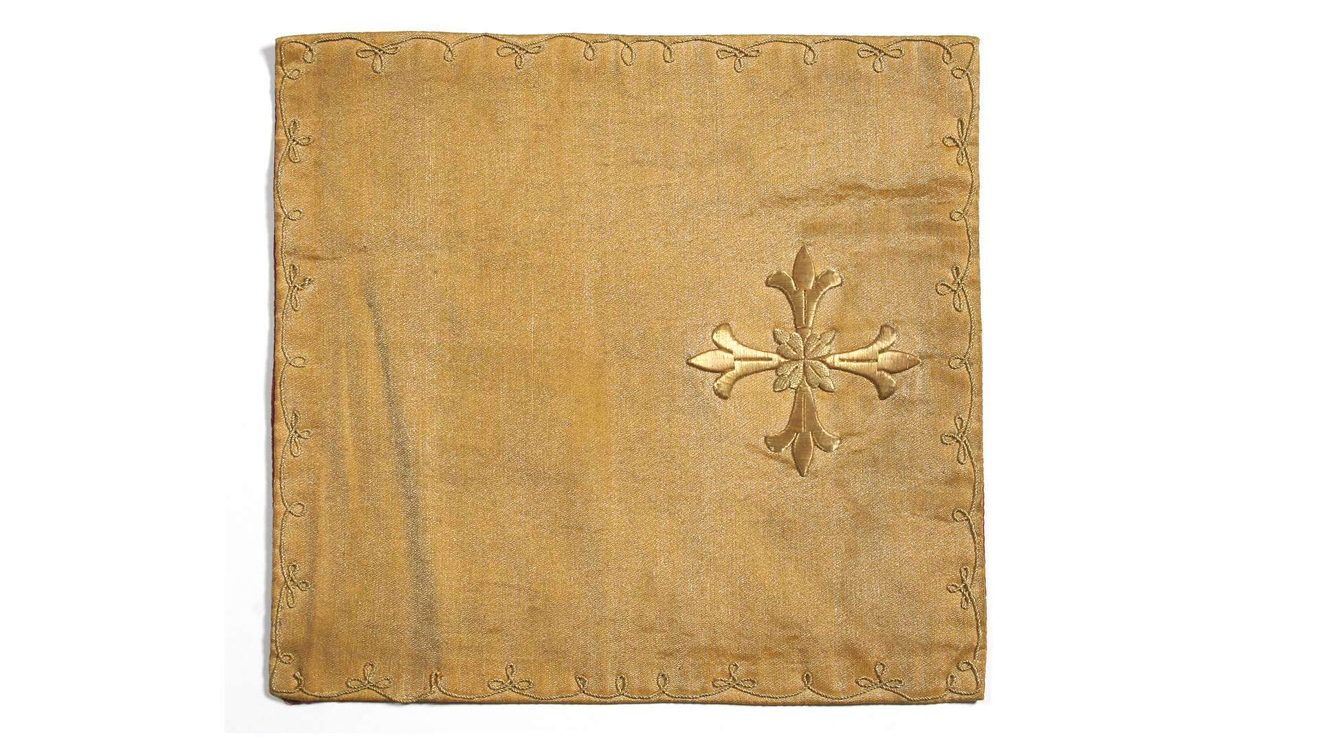Tela metálica amarilla con cruz de Alcántara bordada en relieve y orlas en contornos con hilos dorados.
