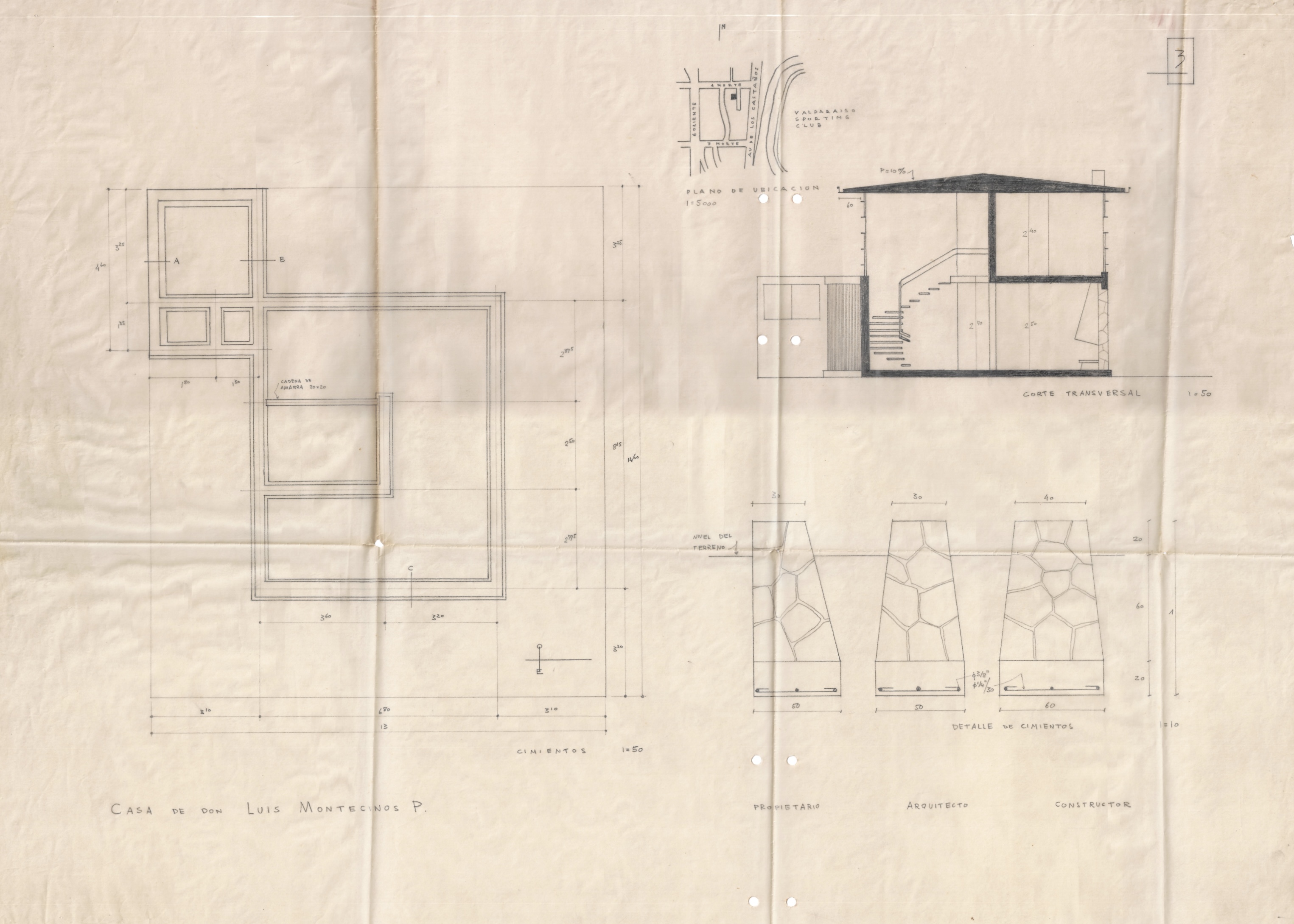 El proyecto de la Casa de Don Luis Montecinos P. está conformado por tres planos que documentan su configuración arquitectónica y estructural. El primero presenta los detalles de las escaleras y las plantas en hormigón armado, desarrollados en escala 1:20. El segundo corresponde a las fachadas oriente, poniente, norte y sur, representadas en escala 1:50. Finalmente, el tercer plano incluye la ubicación general del proyecto en escala 1:5000, junto con los detalles de cimientos en escala 1:50, completando así el registro técnico fundamental de la vivienda.