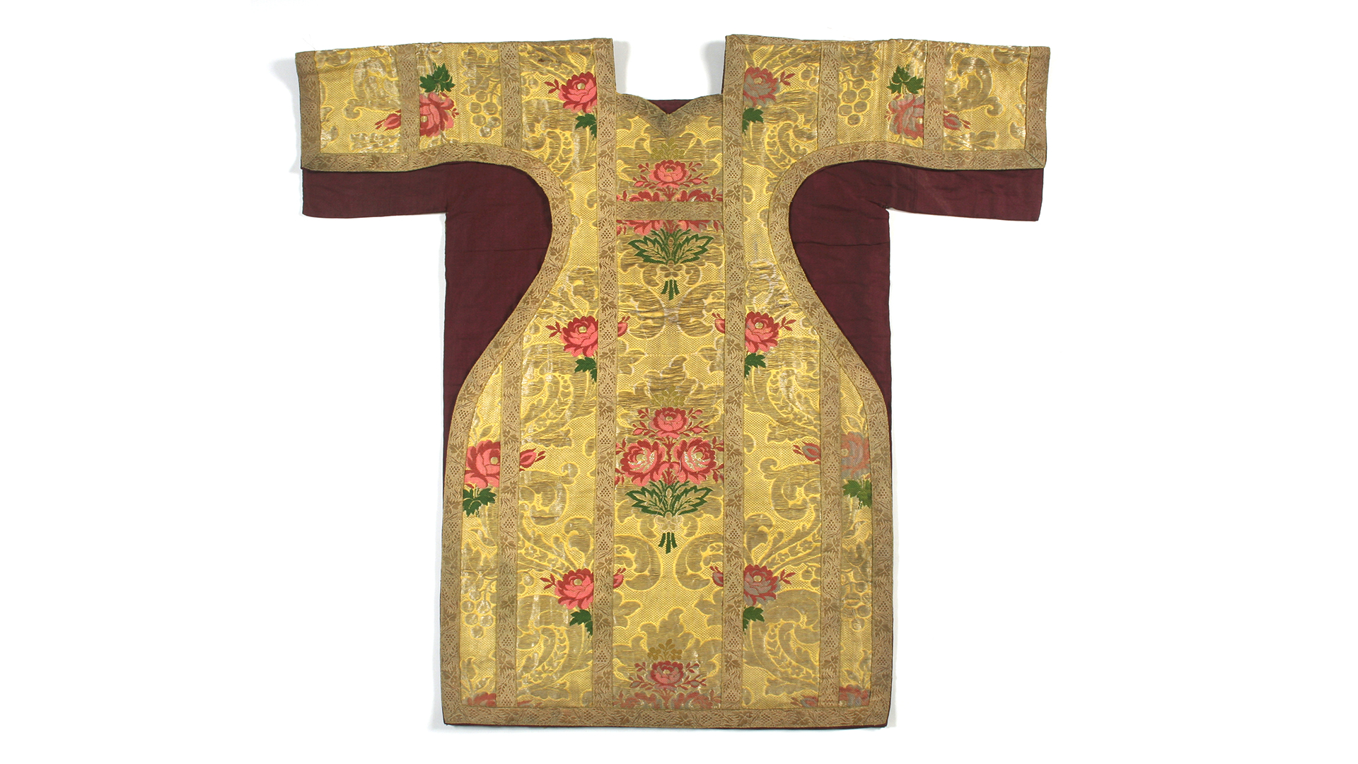 Brocato amarillo con flores rojas y doradas, bordes con galón dorado. Forro rojo.