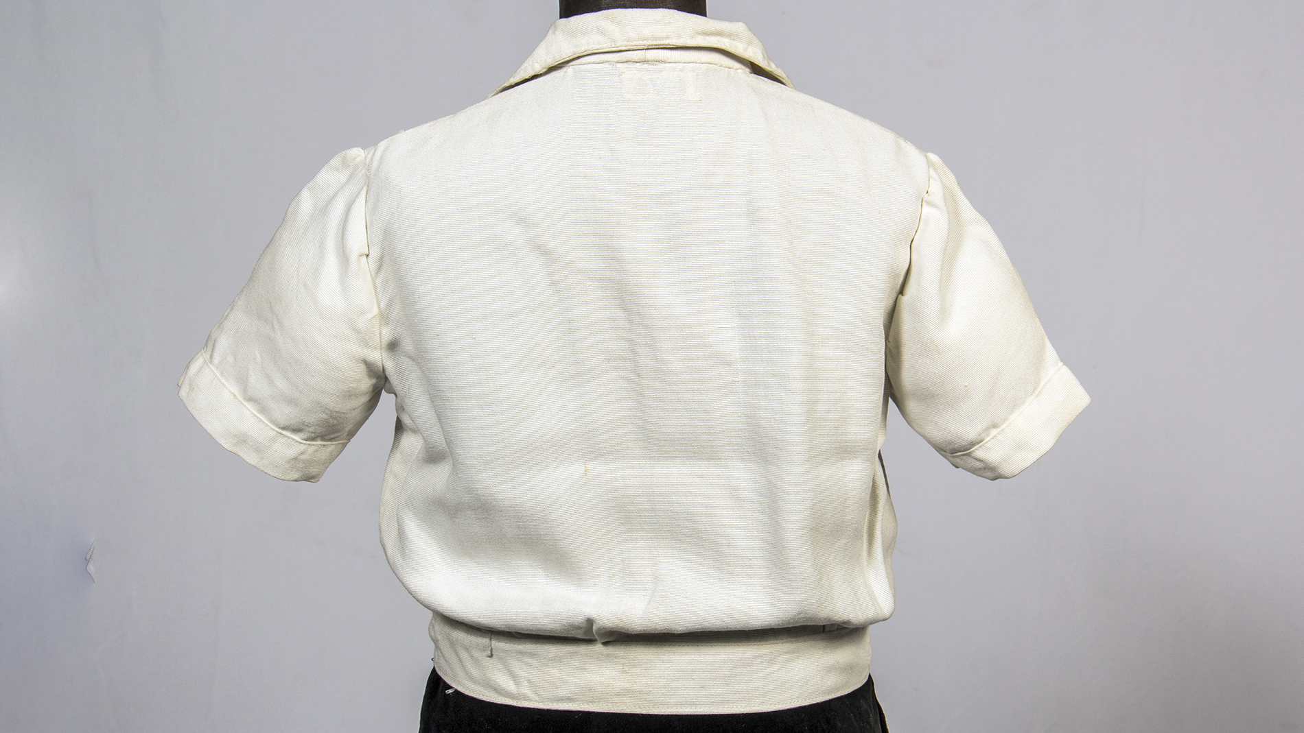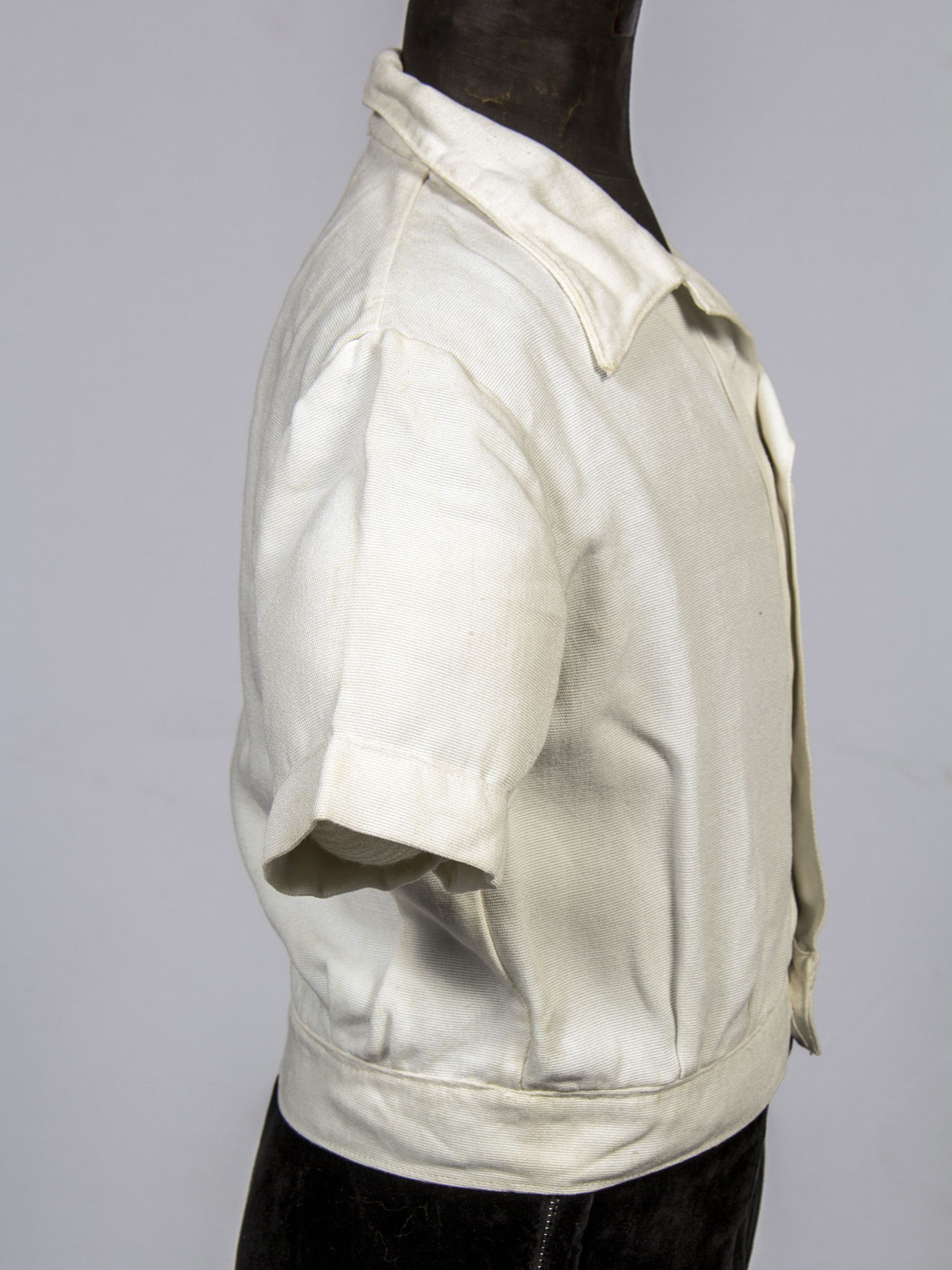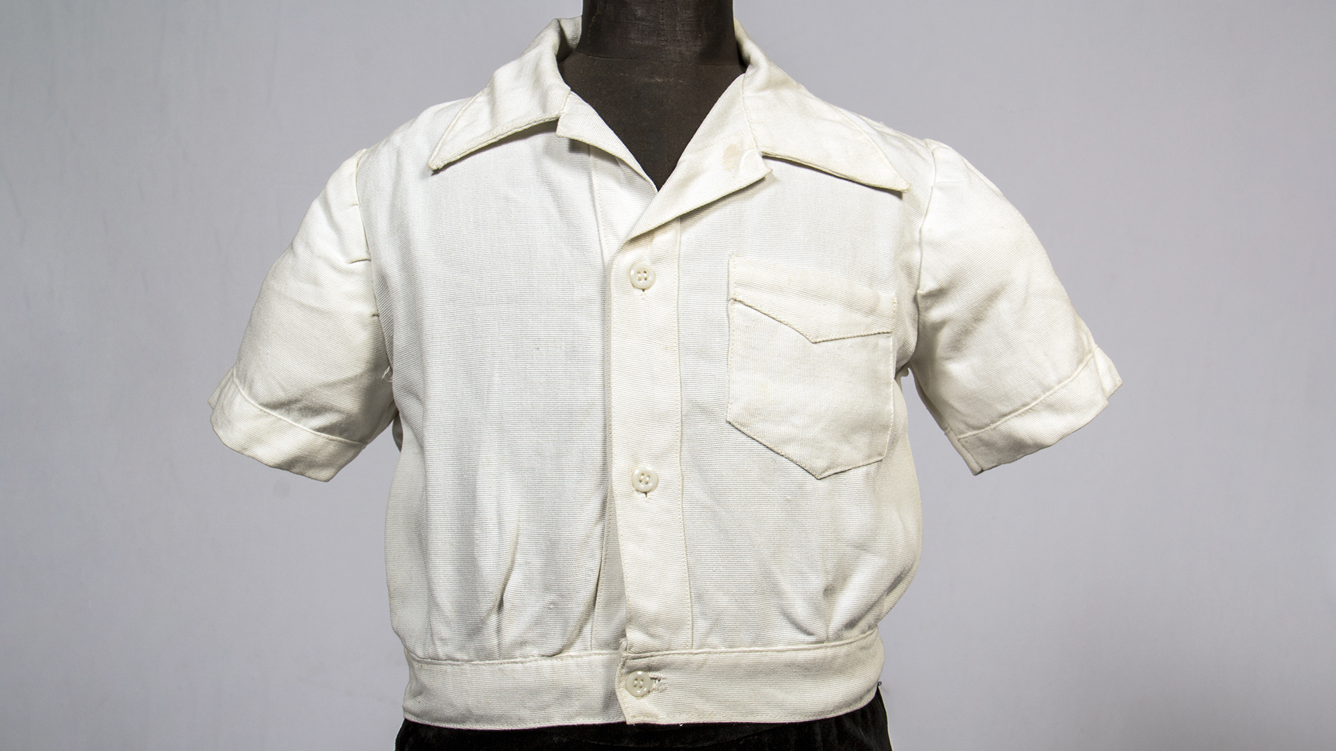 First Communion boy's suit, consisting of 4 pieces: Buttoned white short-sleeved shirt with a left pocket, 'Casa Ventura' brand, Condell 1390 Valparaíso. Black velvet pants with a button and metal closure on one side. Short black velvet jacket with beige lining, pointed back. White semi-translucent fabric little bag with lace trim.