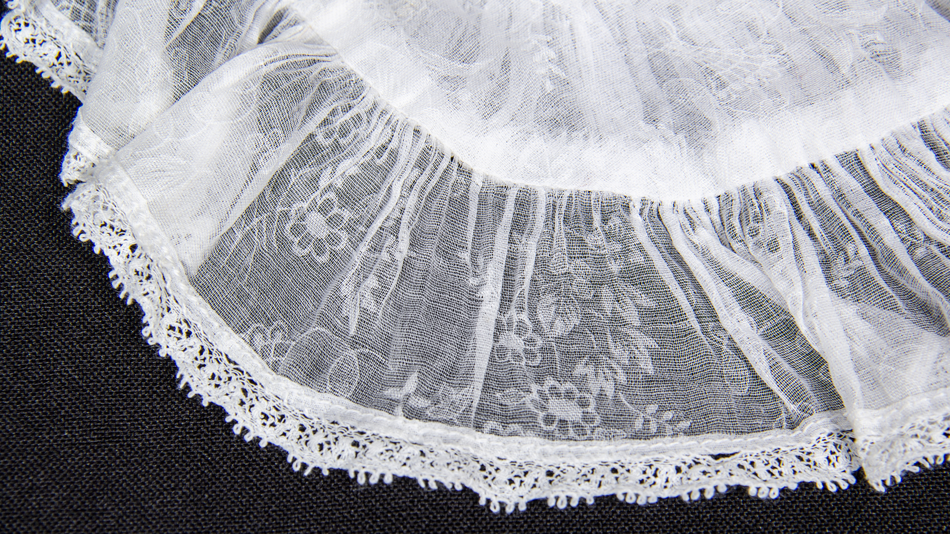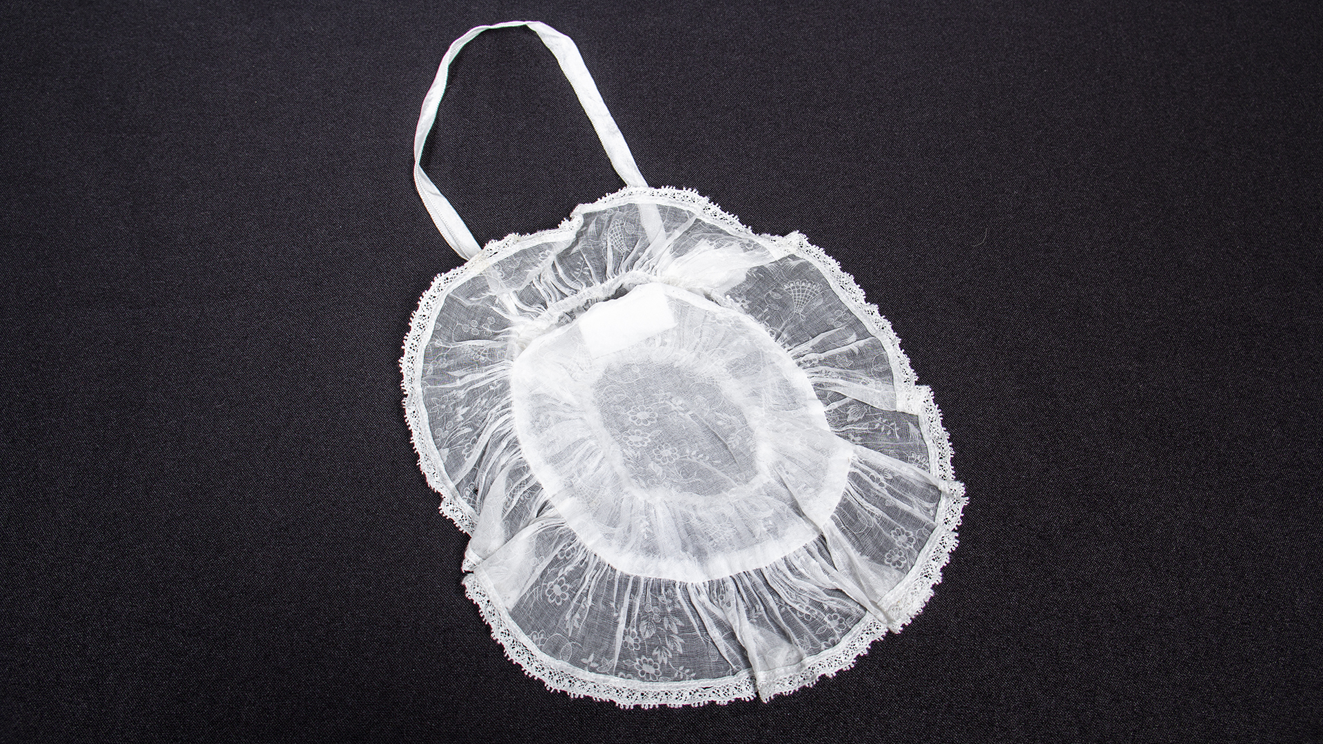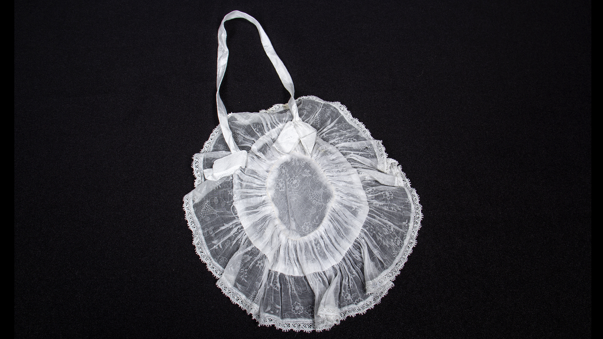First Communion boy's suit, consisting of 4 pieces: Buttoned white short-sleeved shirt with a left pocket, 'Casa Ventura' brand, Condell 1390 Valparaíso. Black velvet pants with a button and metal closure on one side. Short black velvet jacket with beige lining, pointed back. White semi-translucent fabric little bag with lace trim.