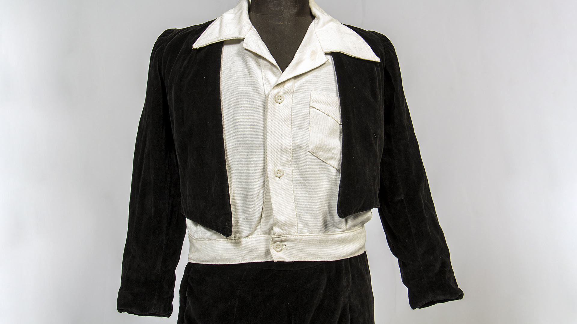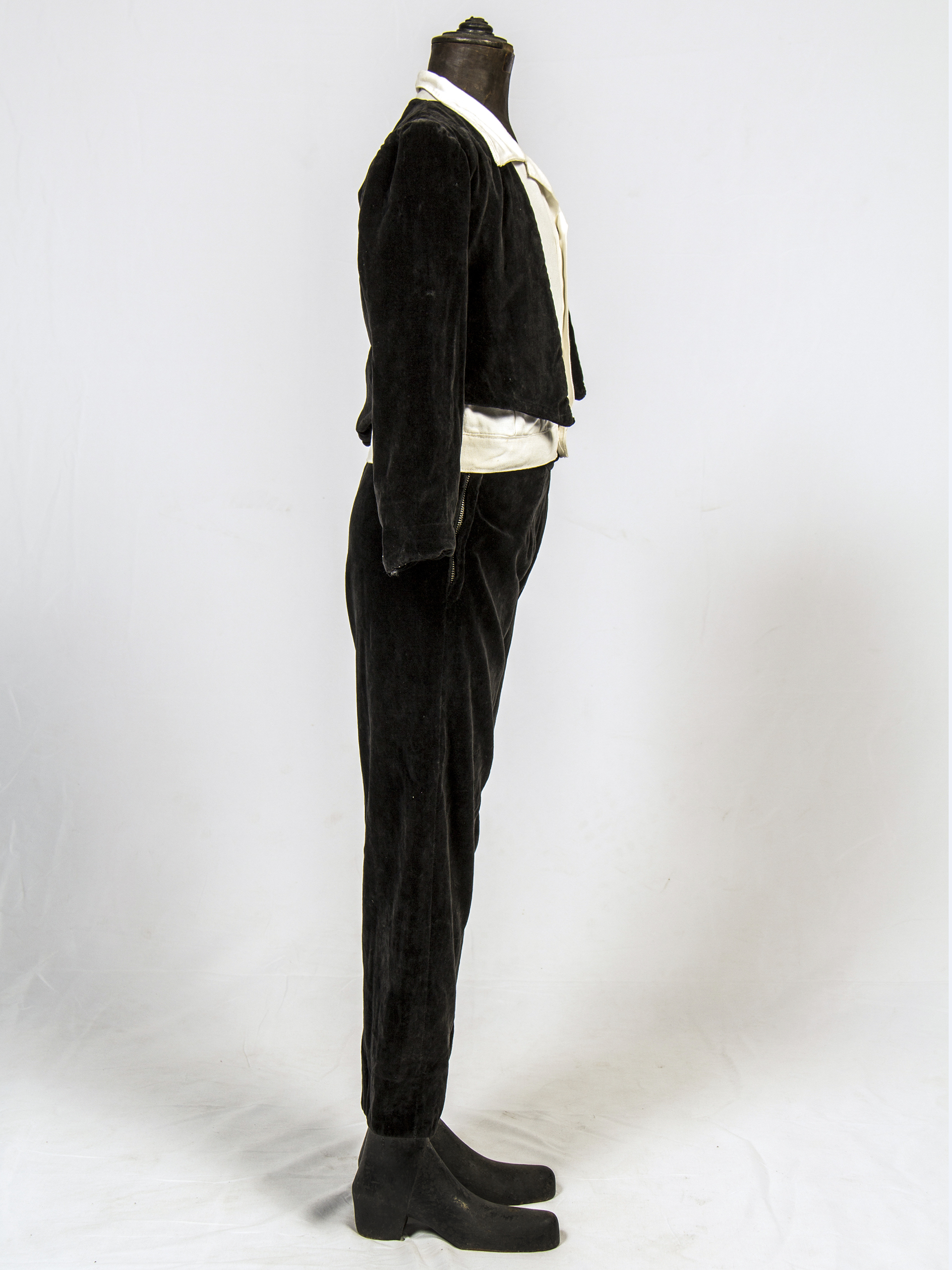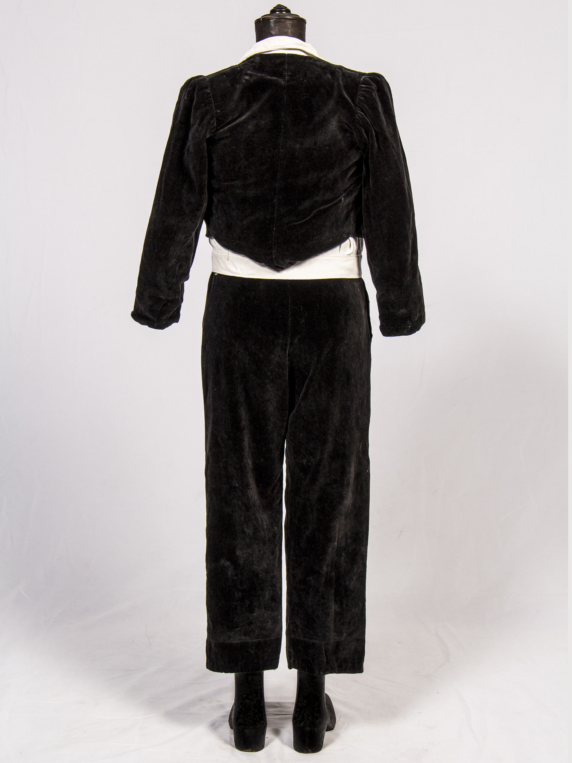 Traje de niño para Primera Comunión, consta de 4 piezas: Camisa abotonada en delantero, manga corta, color blanco, con bolsillo a la izquierda, marca 'Casa Ventura', Condell 1390 Valparaíso. Pantalón terciopelo negro con botón y cierre metálico a un costado. Chaqueta corta terciopelo negro, forro beige, espalda terminada en punta. Bolsito color blanco de tela semi translúcida, con blondas en contorno.