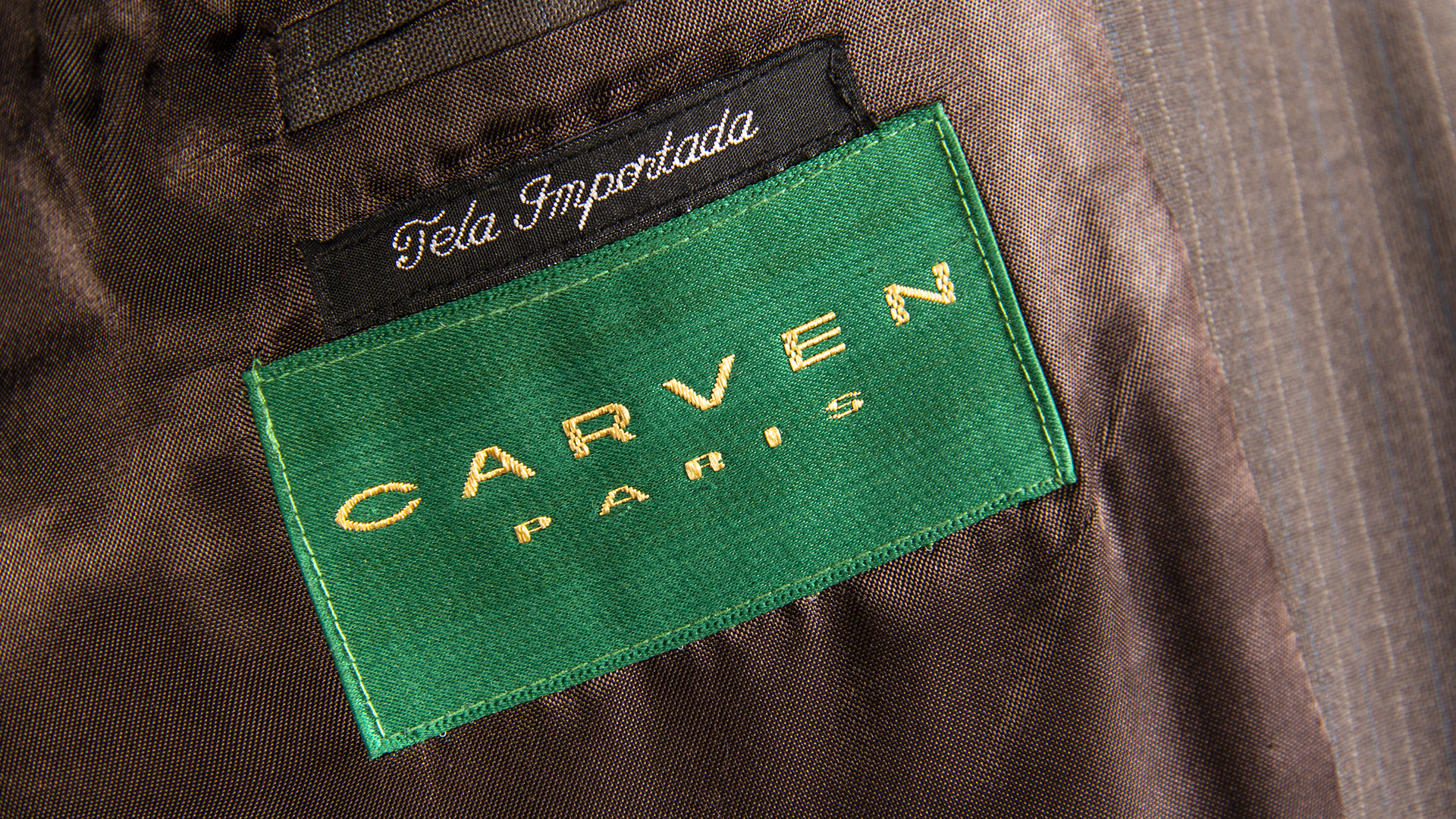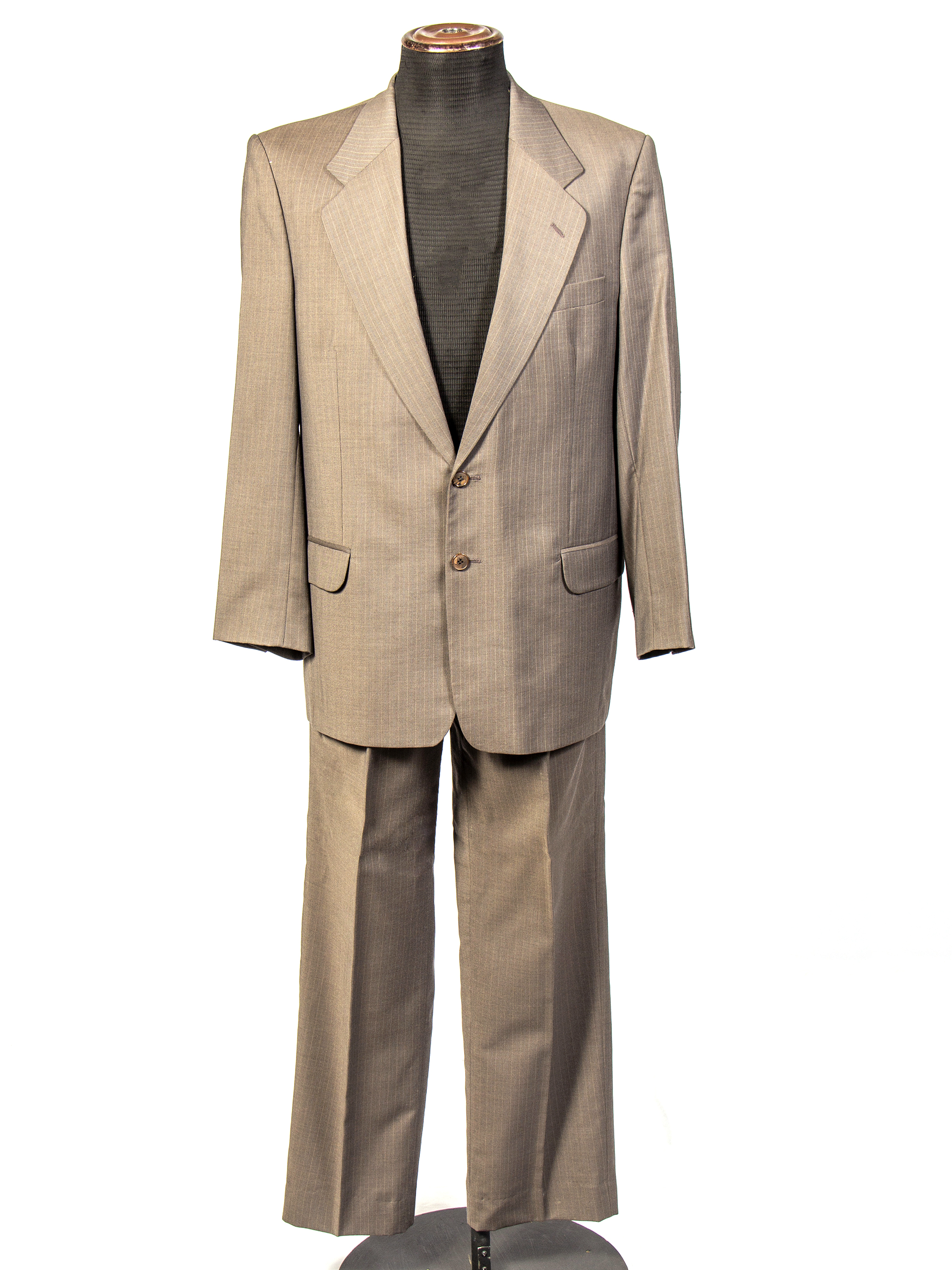 Two-piece men's suit in grayish-brown color with white and blue lines. The pants have two front pockets and two back pockets, one of them button-closed. It closes with a clasp, button, and invisible zipper. The jacket has two front buttons, two flap pockets, and one chest pocket with an eyelet. Three buttons on the cuffs, satin brown internal lining, and four pockets. Labels: 'Carven,' 'Xuga,' and 'Imported Fabric.' Made in Chile.