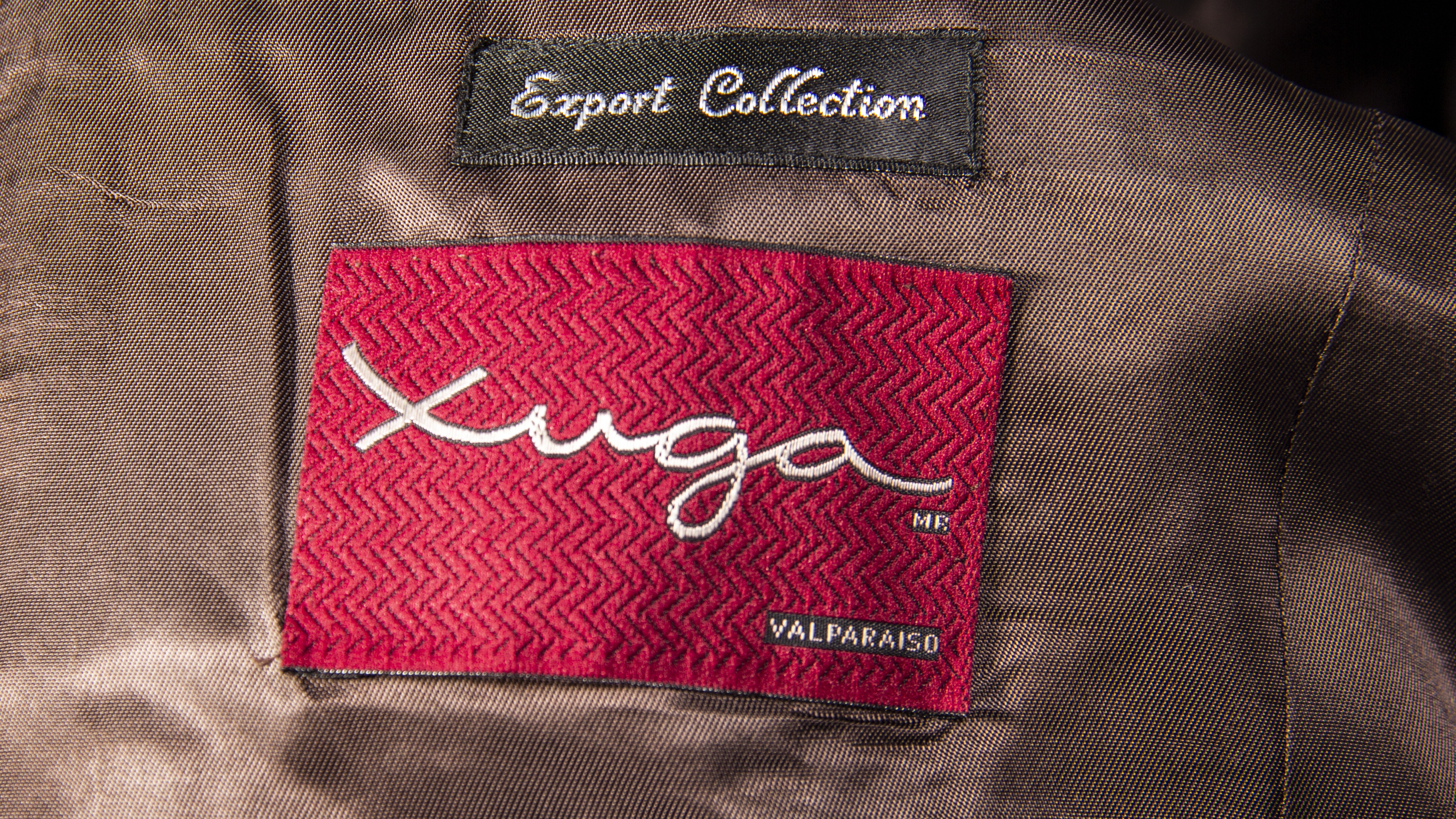 Traje de hombre de dos piezas de color café grisáseo con lineas blancas y azules. El pantalón tiene dos bolsillos delanteros y dos bolsillos traseros, uno de ellos cierra a botón. Cierra con broche, botón y cierre invisible. La chaqueta tiene dos botones delanteros, dos bolsillos con solapa y otro en pechera con ojal. Tres botones en los puños, forro intereno café satinado y cuatro bolsillos. Etiquetas 'Carven', 'Xuga' y 'Tela importada'. Fabricación chilena.