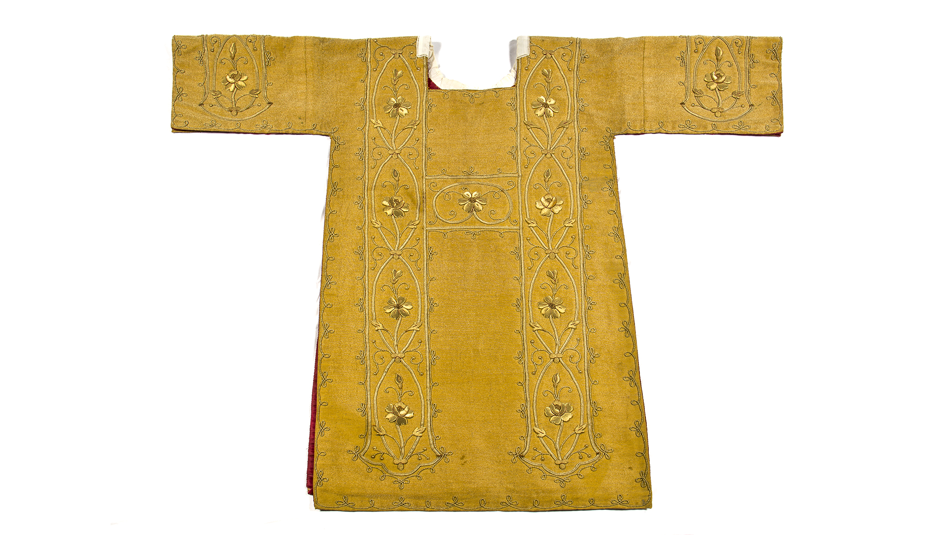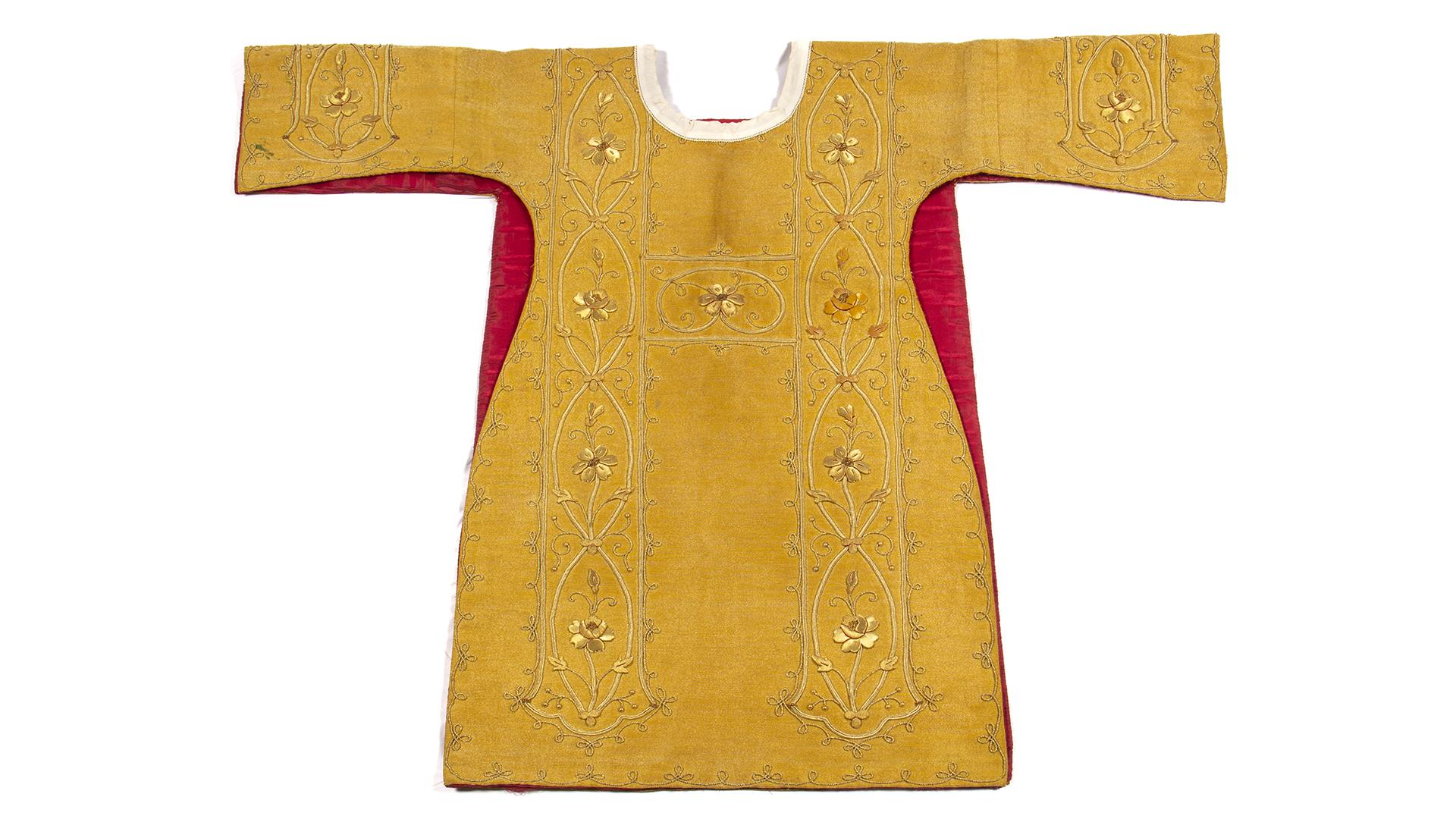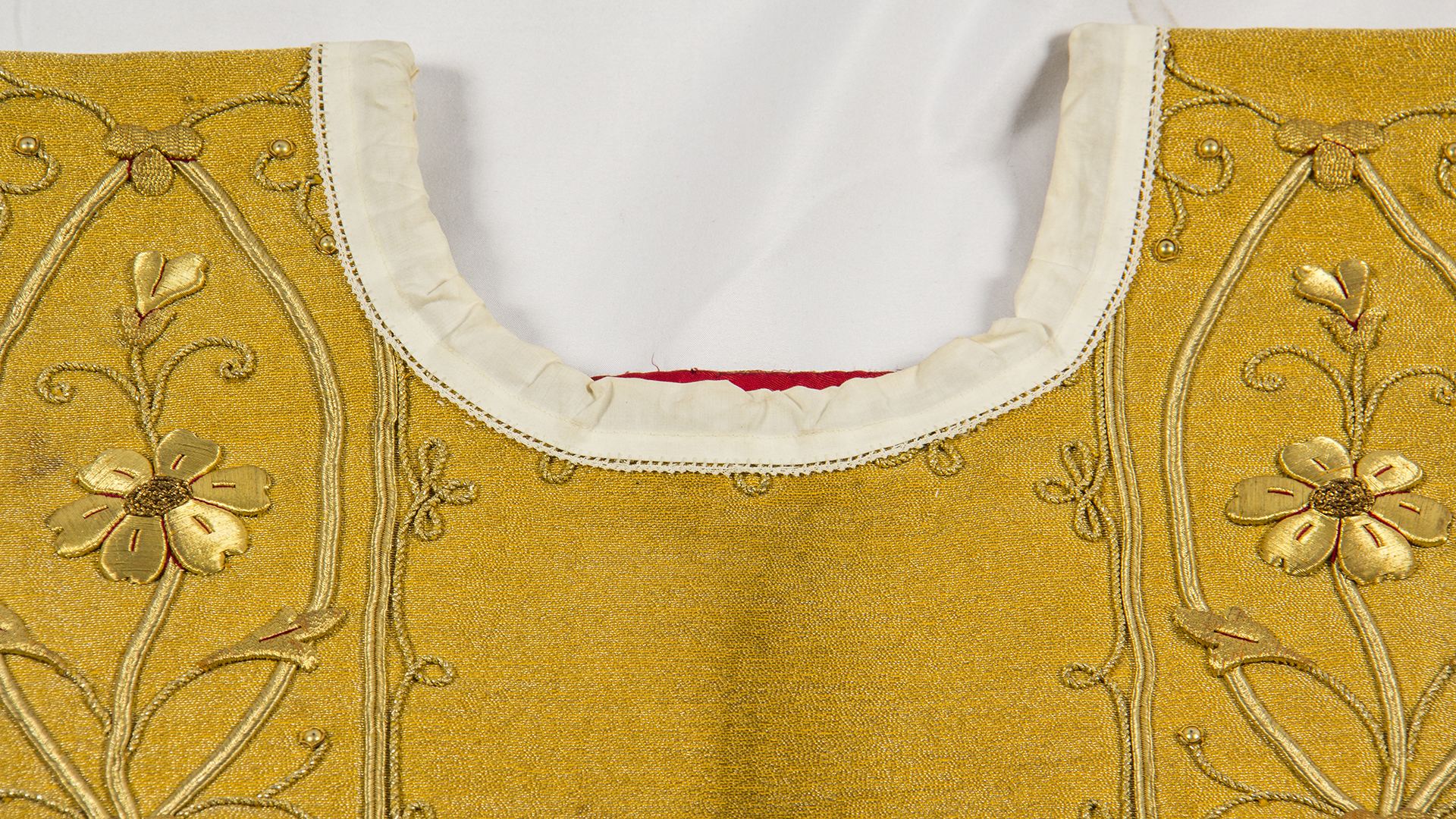 Tela metálica dorada con flores bordadas doradas metálicas, cuello redondo con blonda blanca y forro rojo. Bordados frontales en proceso de oxidación, manchas de humedad y desfibración de la tela interior