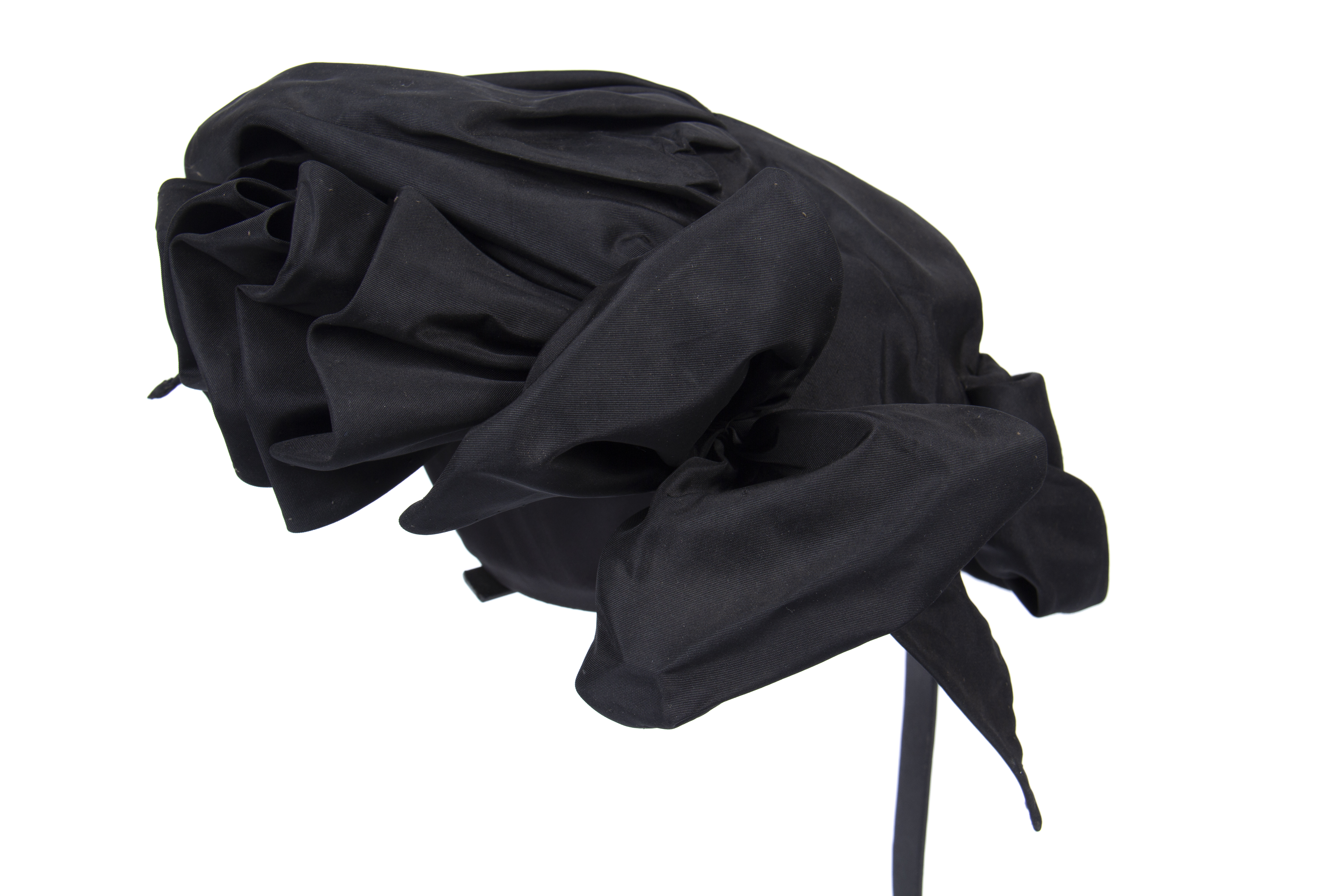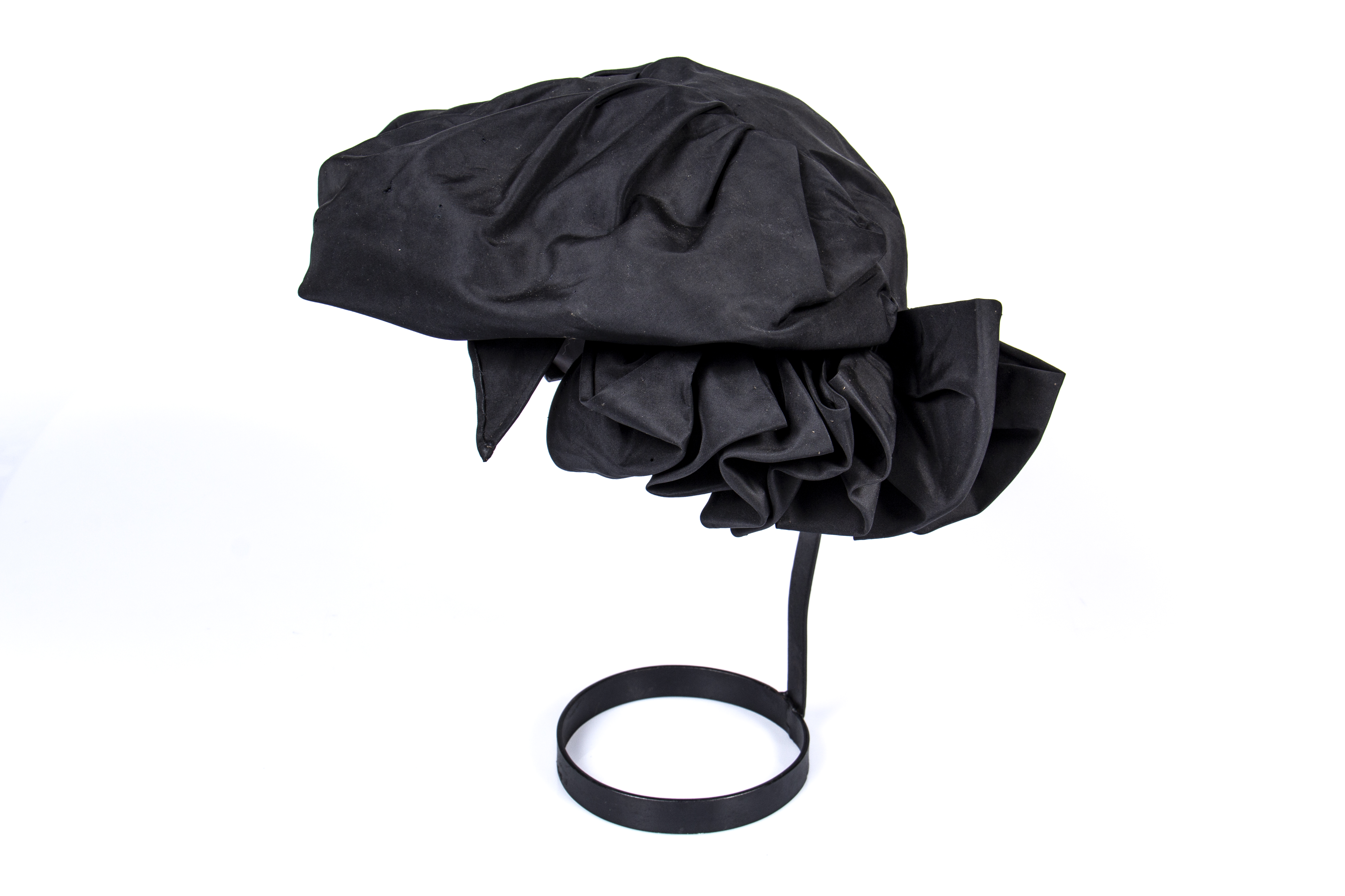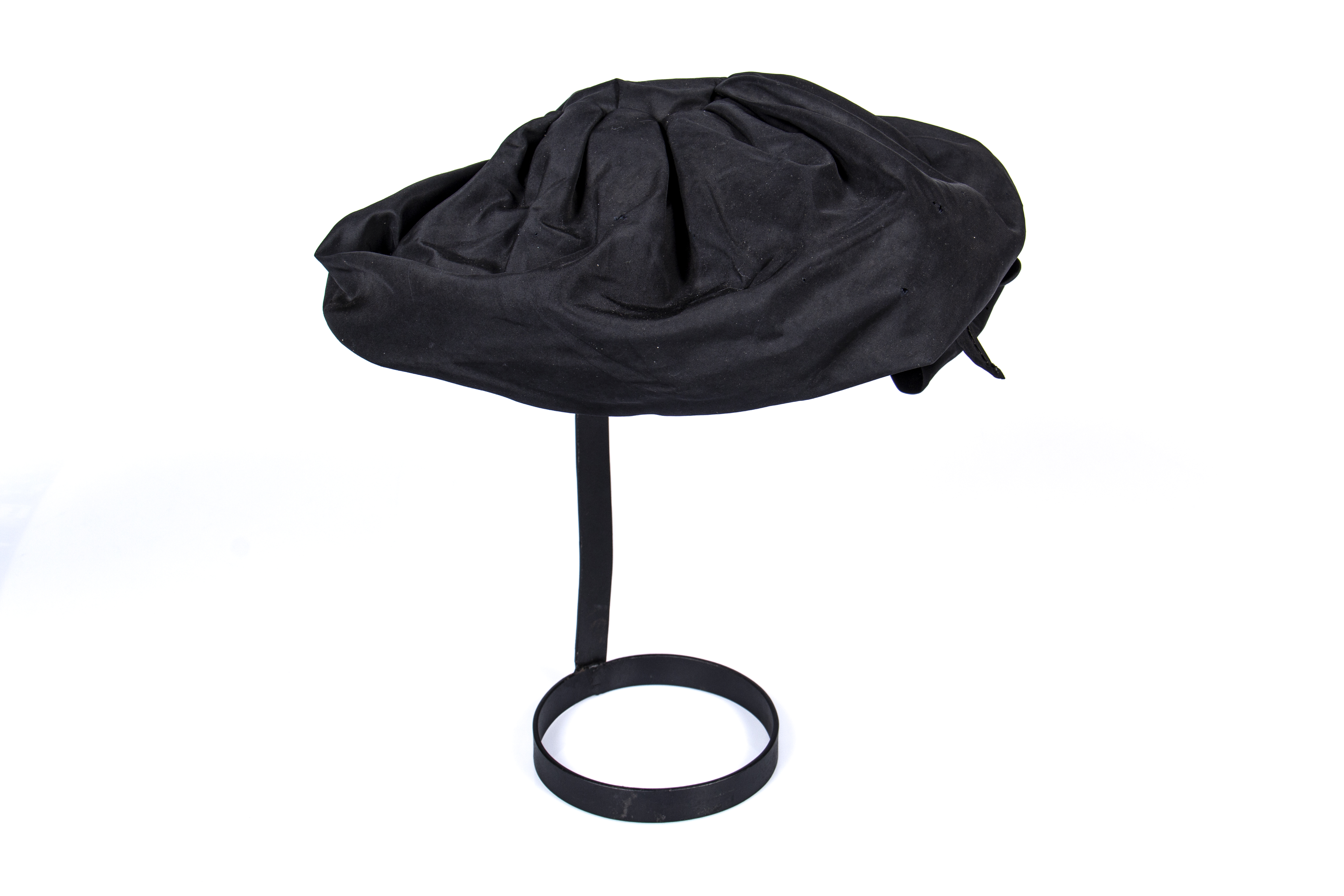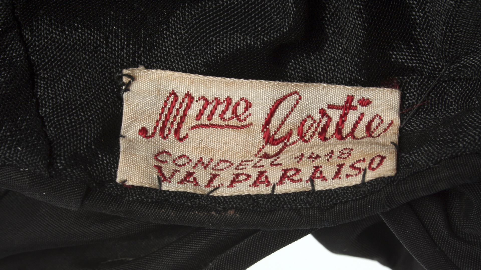 Black hat with a wool ribbon at the nape, labeled 'Mme. Gertie,' Condell 1418. Chilean manufacture.