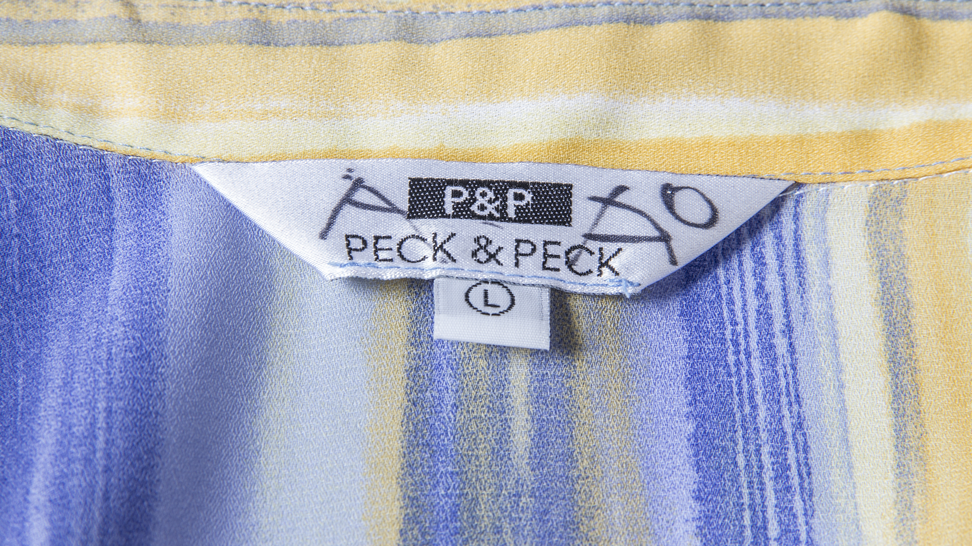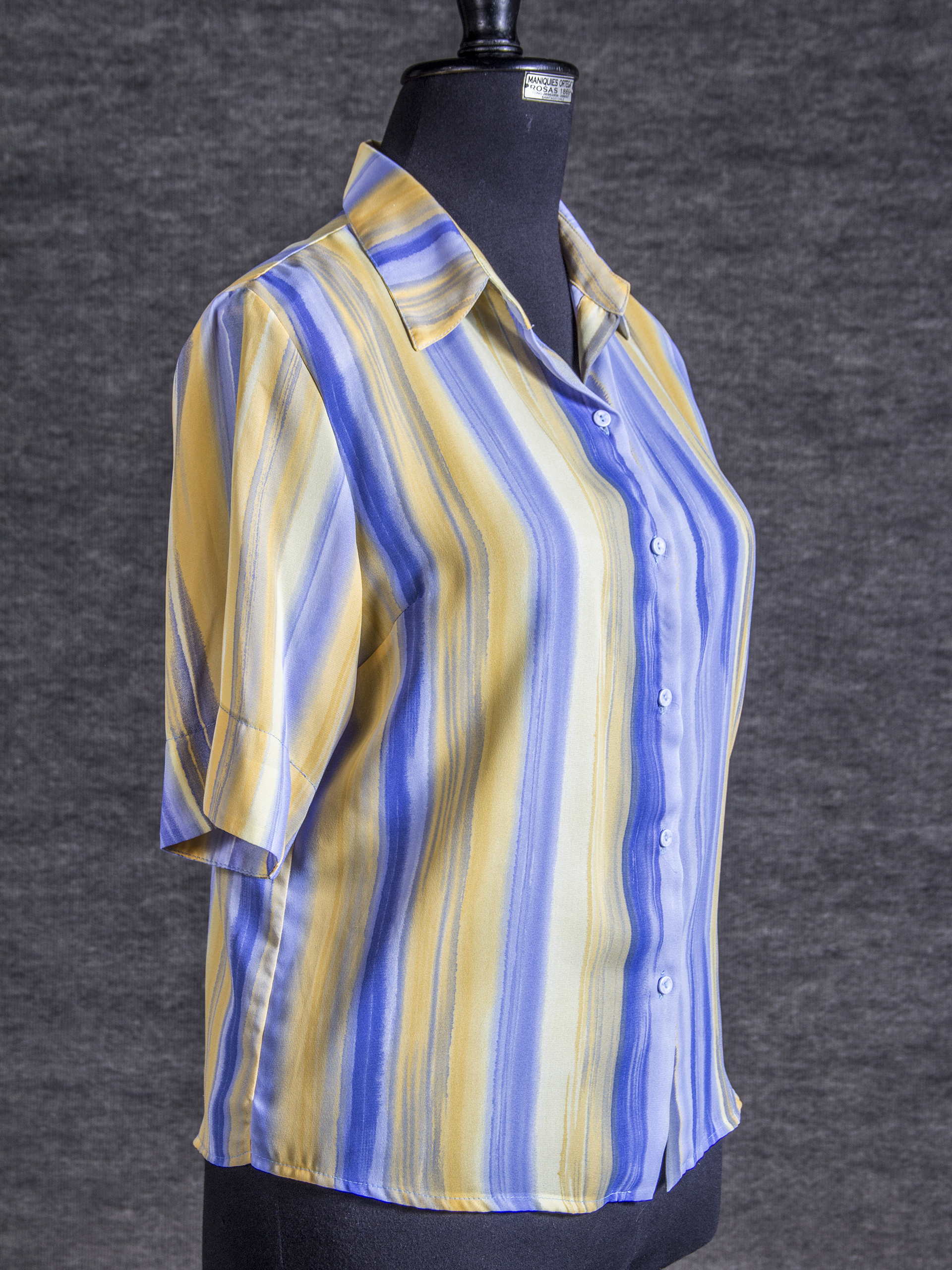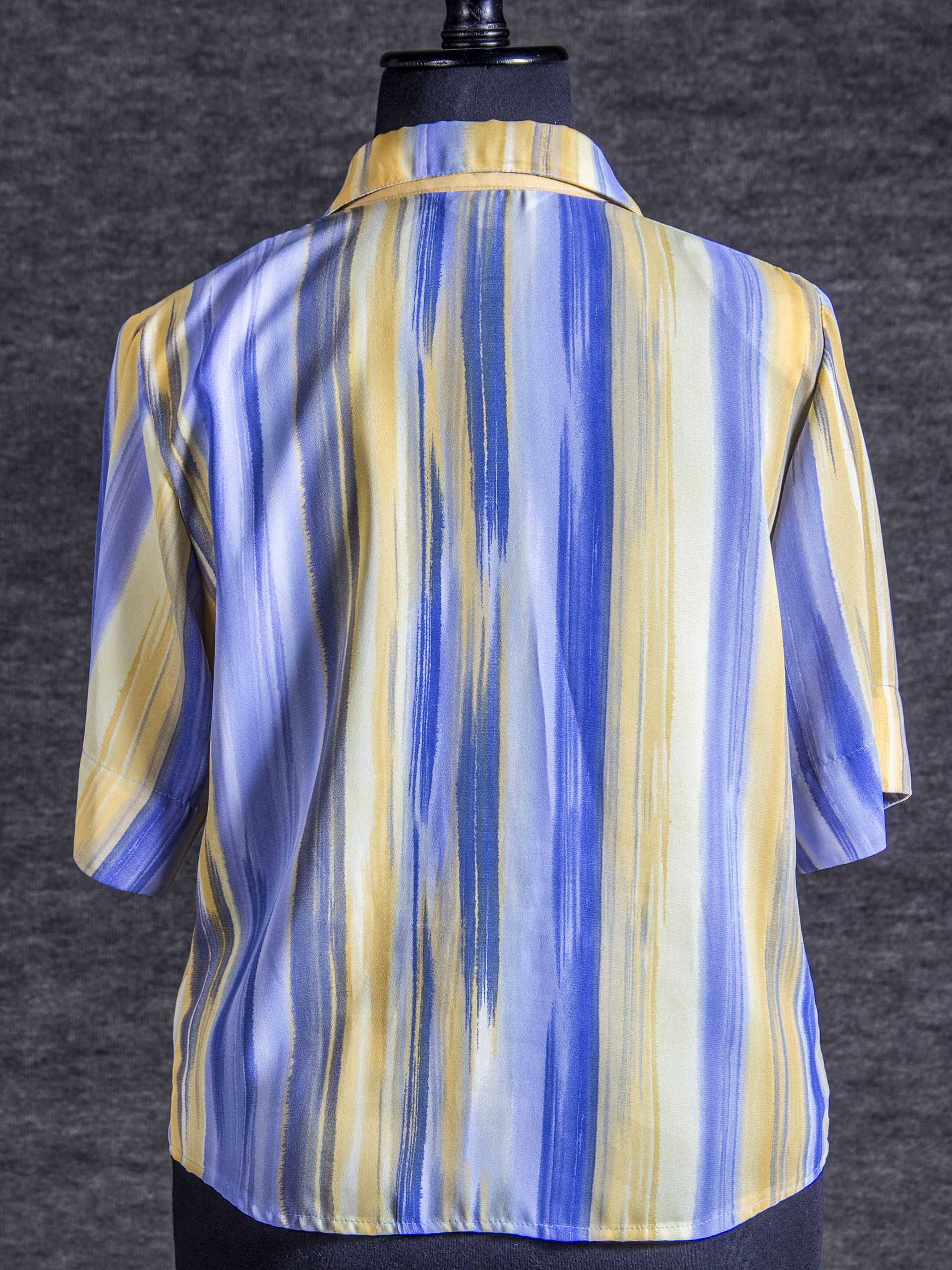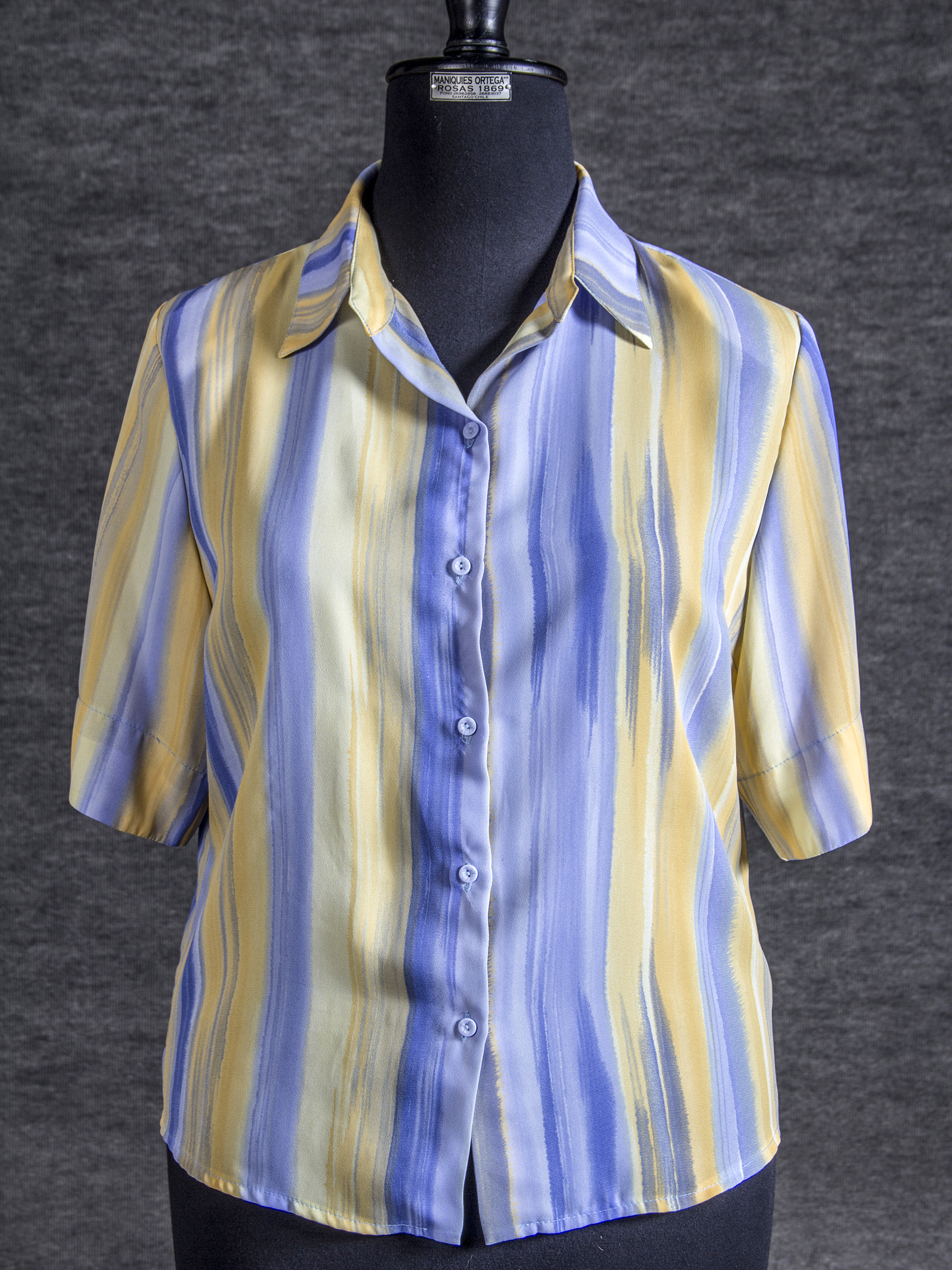 Women's blouse, short sleeves, straight lapel collar, and 6 buttons on the front, size L, Peck&Peck brand, printed fabric in yellow and light blue tones.