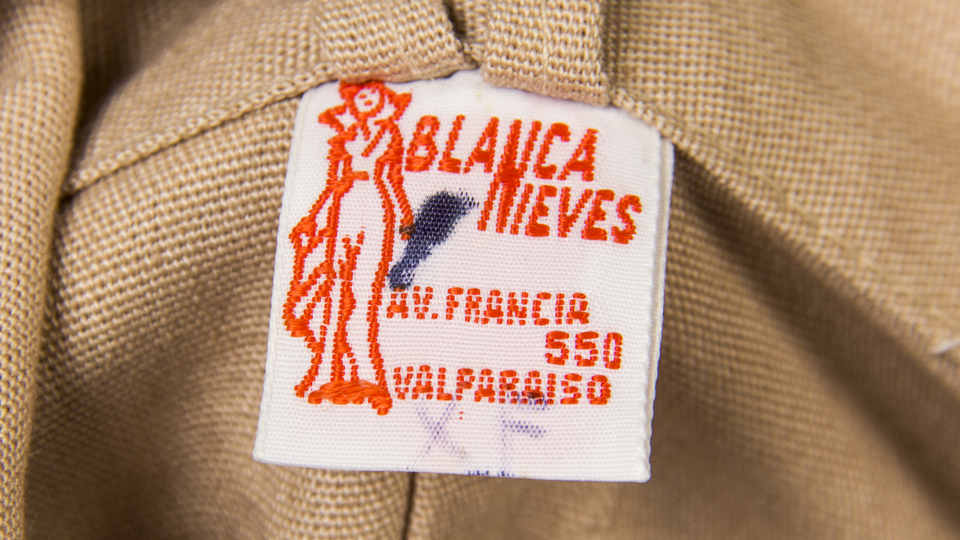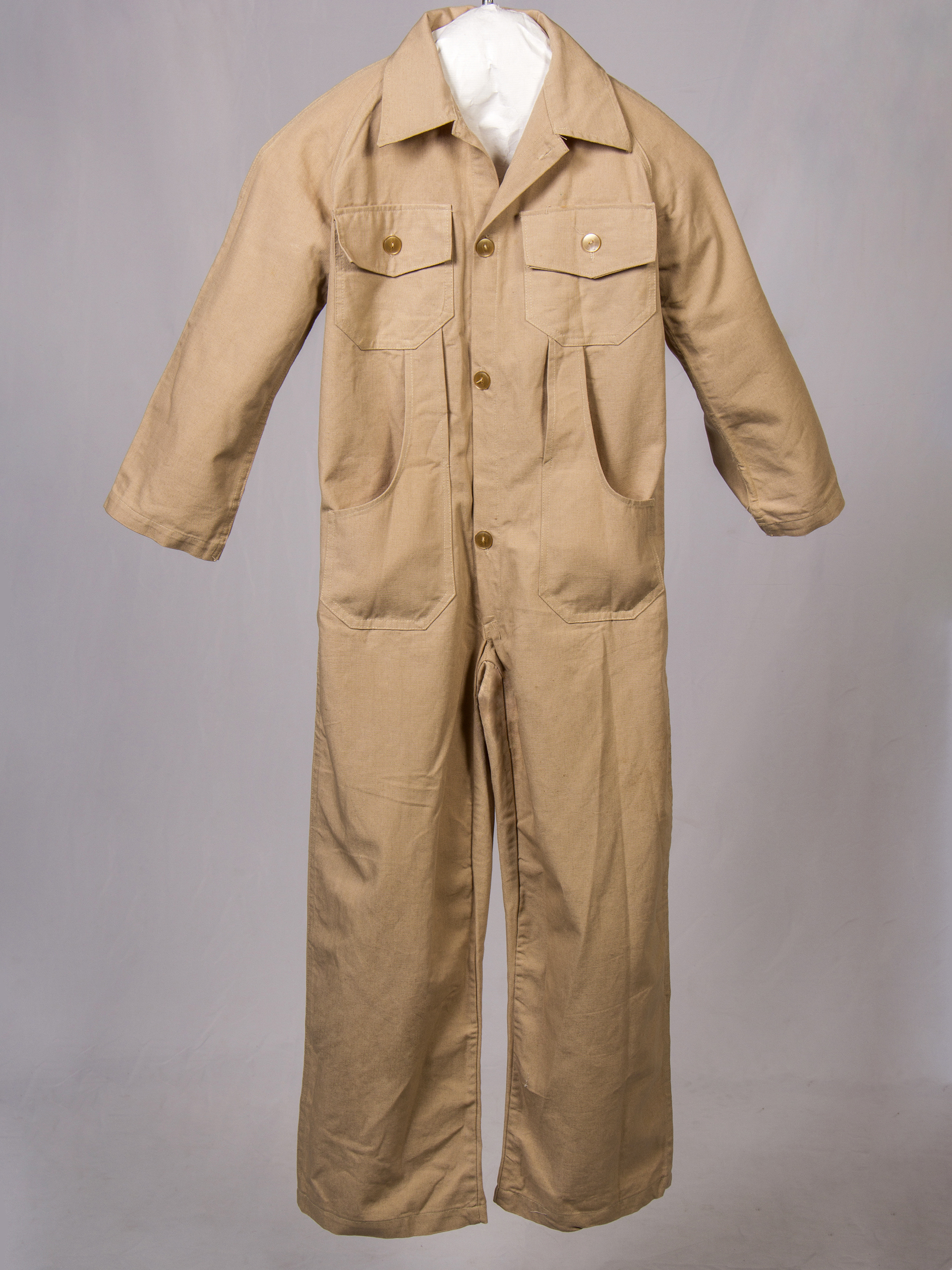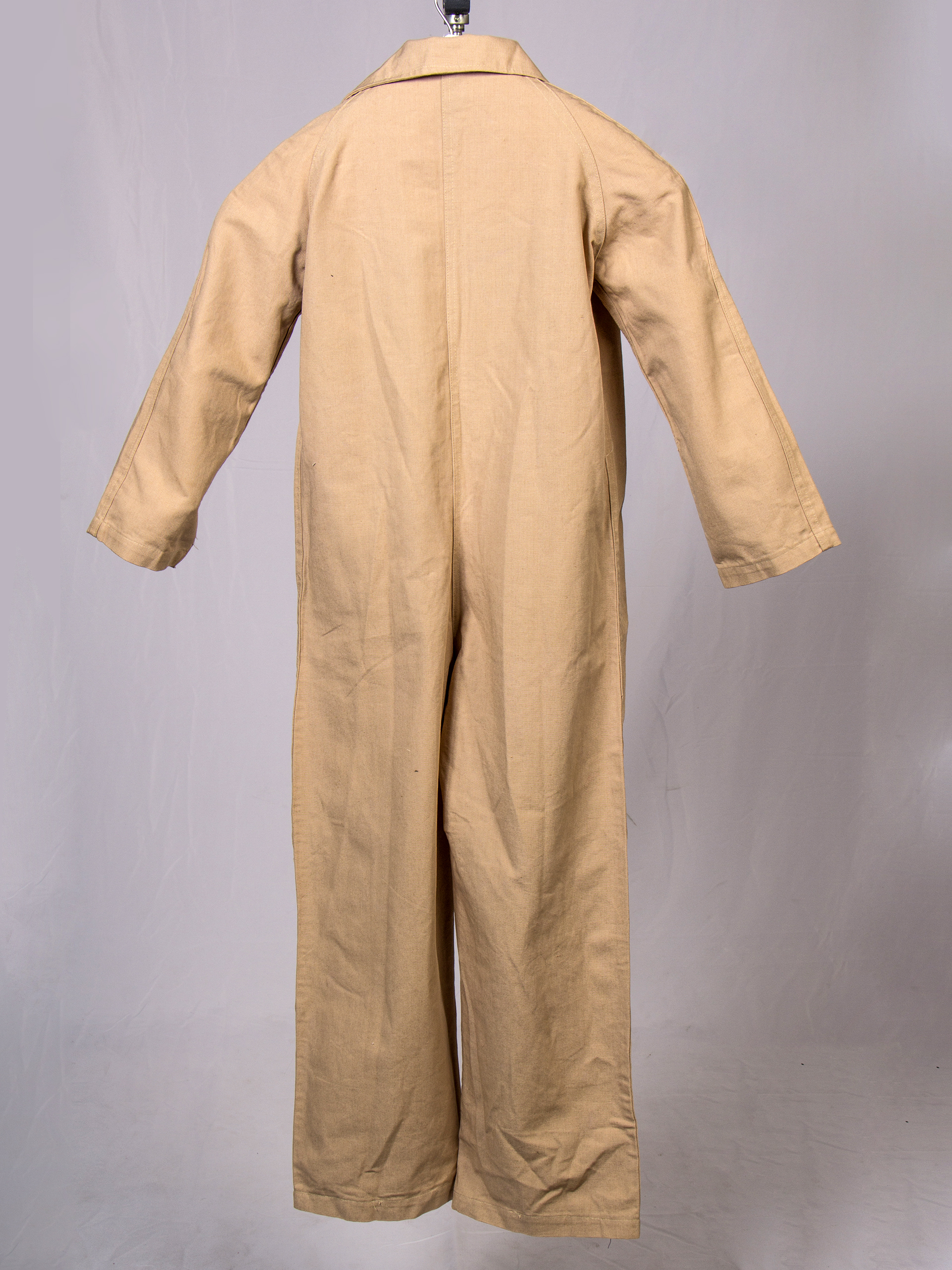 Light brown cotton school overall jumpsuit, 4 patch pockets on the front, and buttoned in the center. Used by children to protect the uniform. Made by Blanca Nieves factory, Av. France 550 Valparaíso.