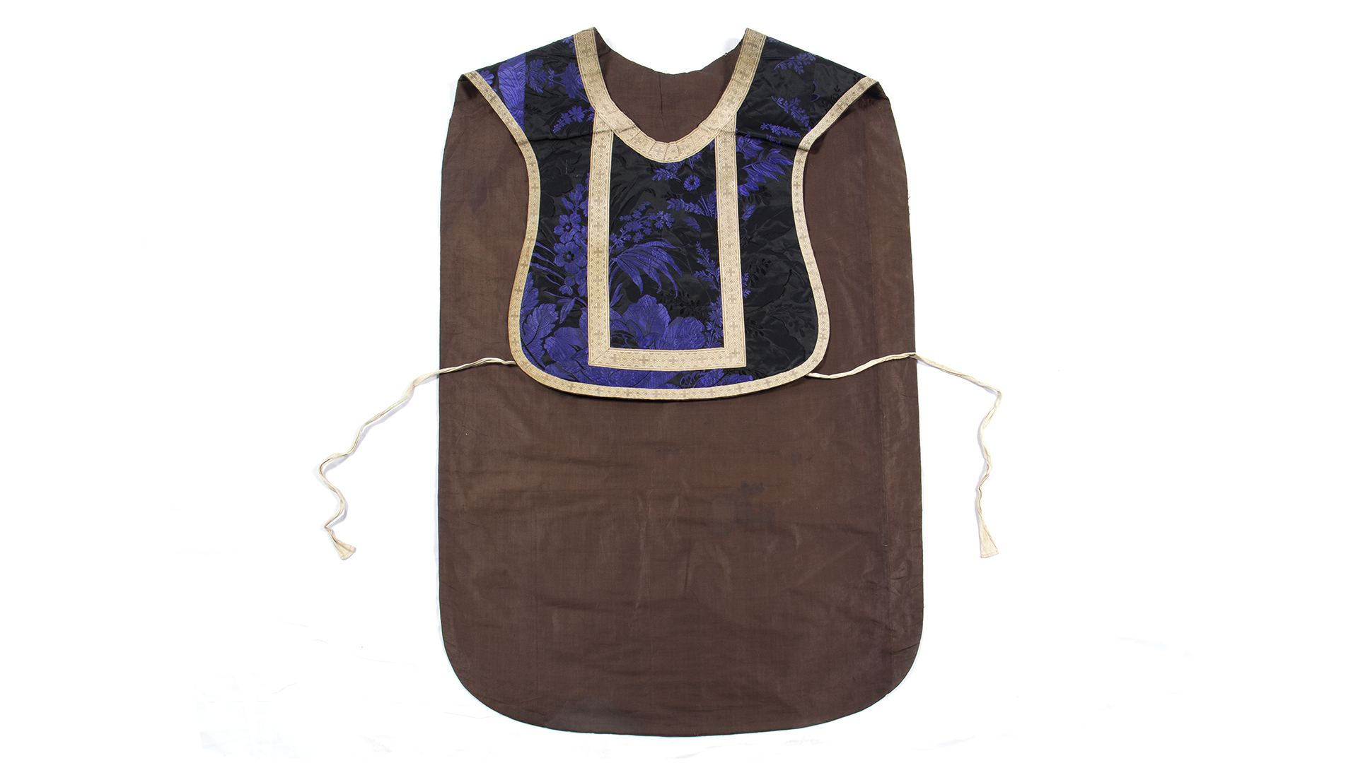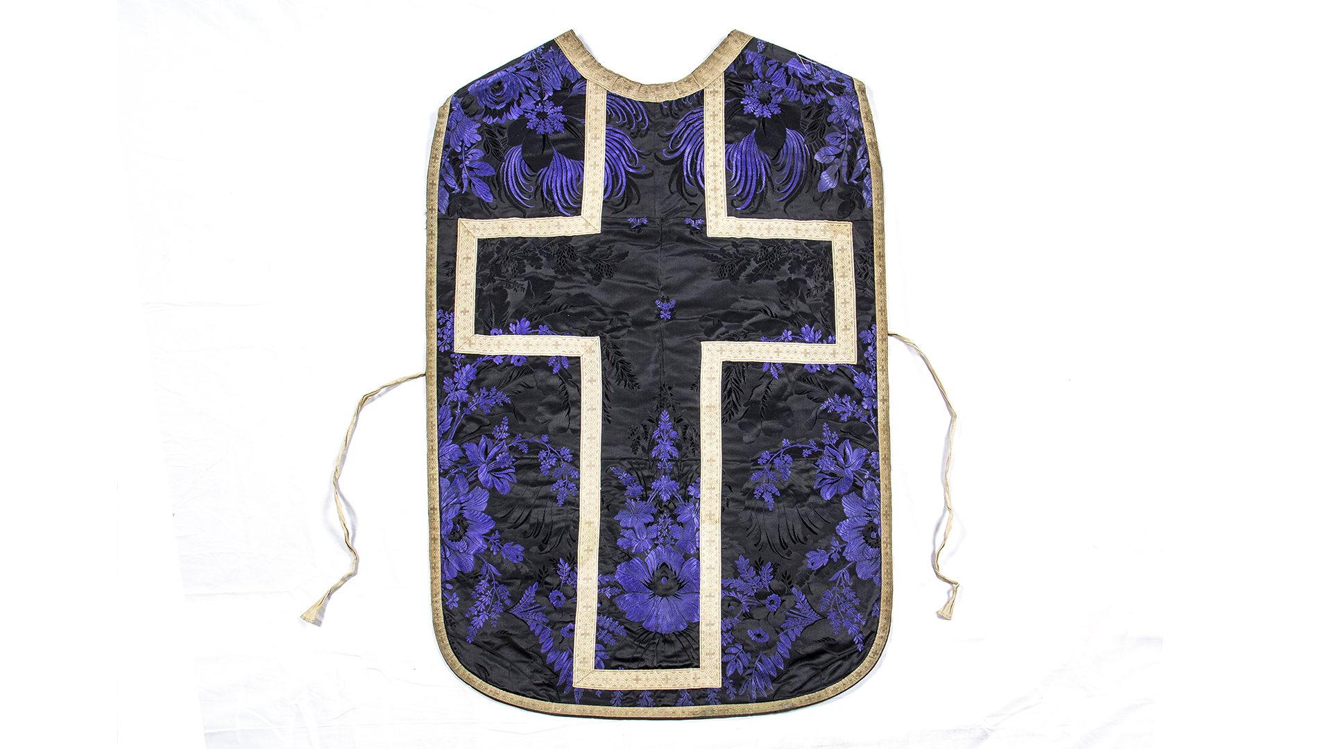 Black Chasuble with blue printed flowers and silver trim on edges. Short front with brown lining.