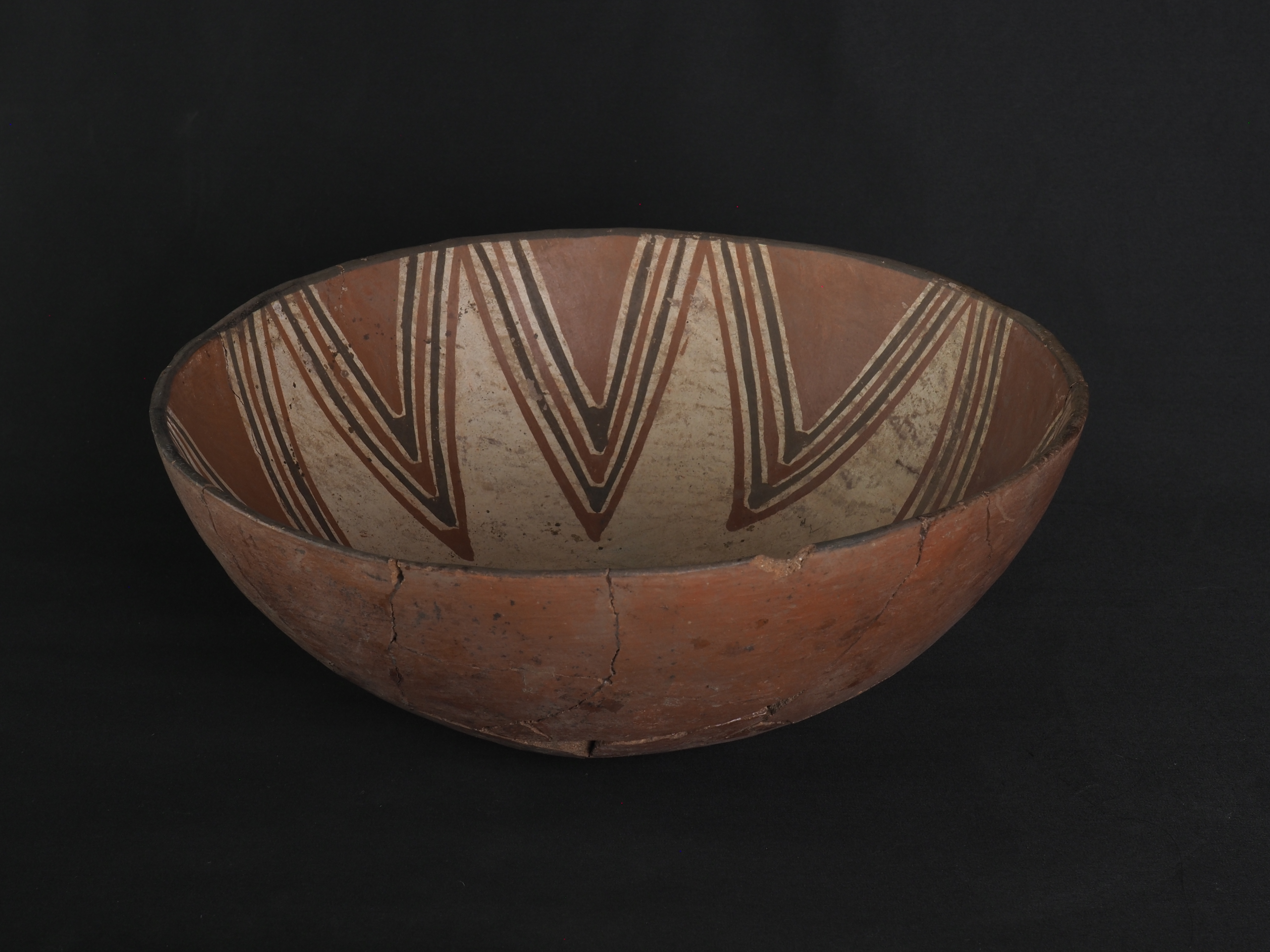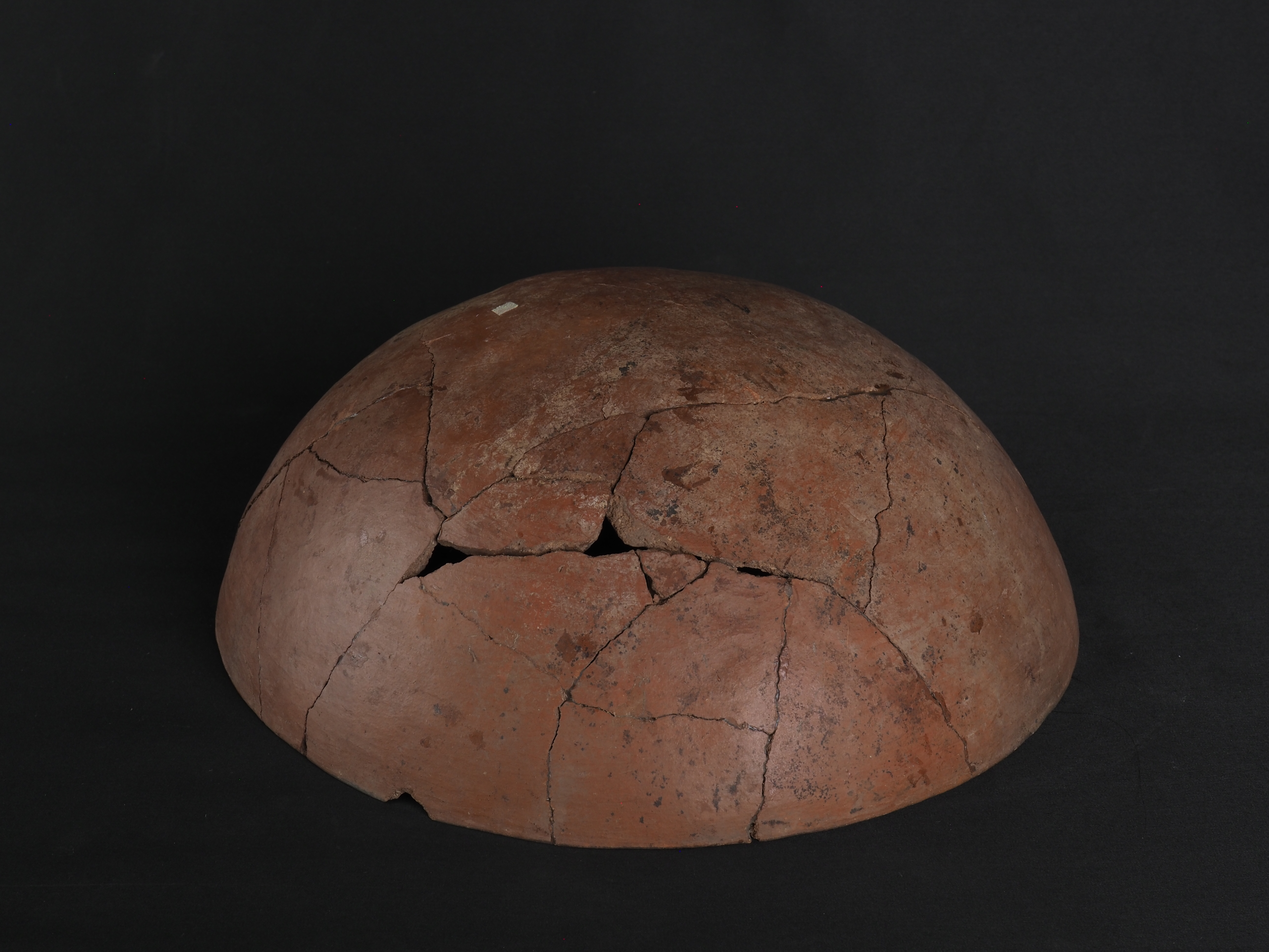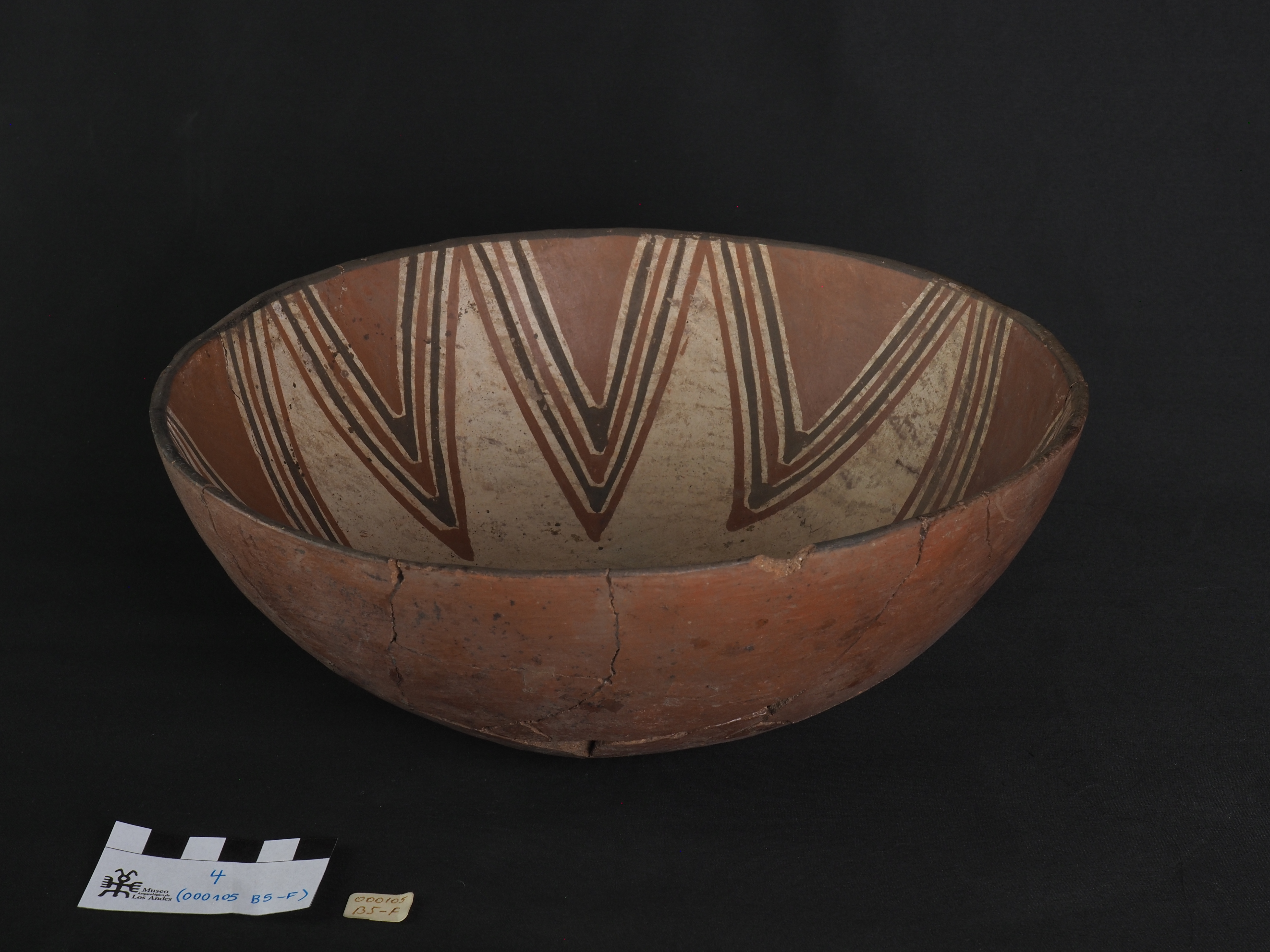 Contenedor abierto, rojo engobado en exterior y engobe blanco en interior. Decorado de forma polícroma con pigmentos negro y rojo. Técnica: Arcilla modelada, alisada y pulida. Cerámica engobada policroma. Morfología: Objeto simétrico de estructura no restringida, perfil simple, cuerpo esférico, borde invertido, labio redondeado y base curva. La unidad estructural del objeto se presenta en fragmentos unidos, con secciones faltantes en el cuerpo.