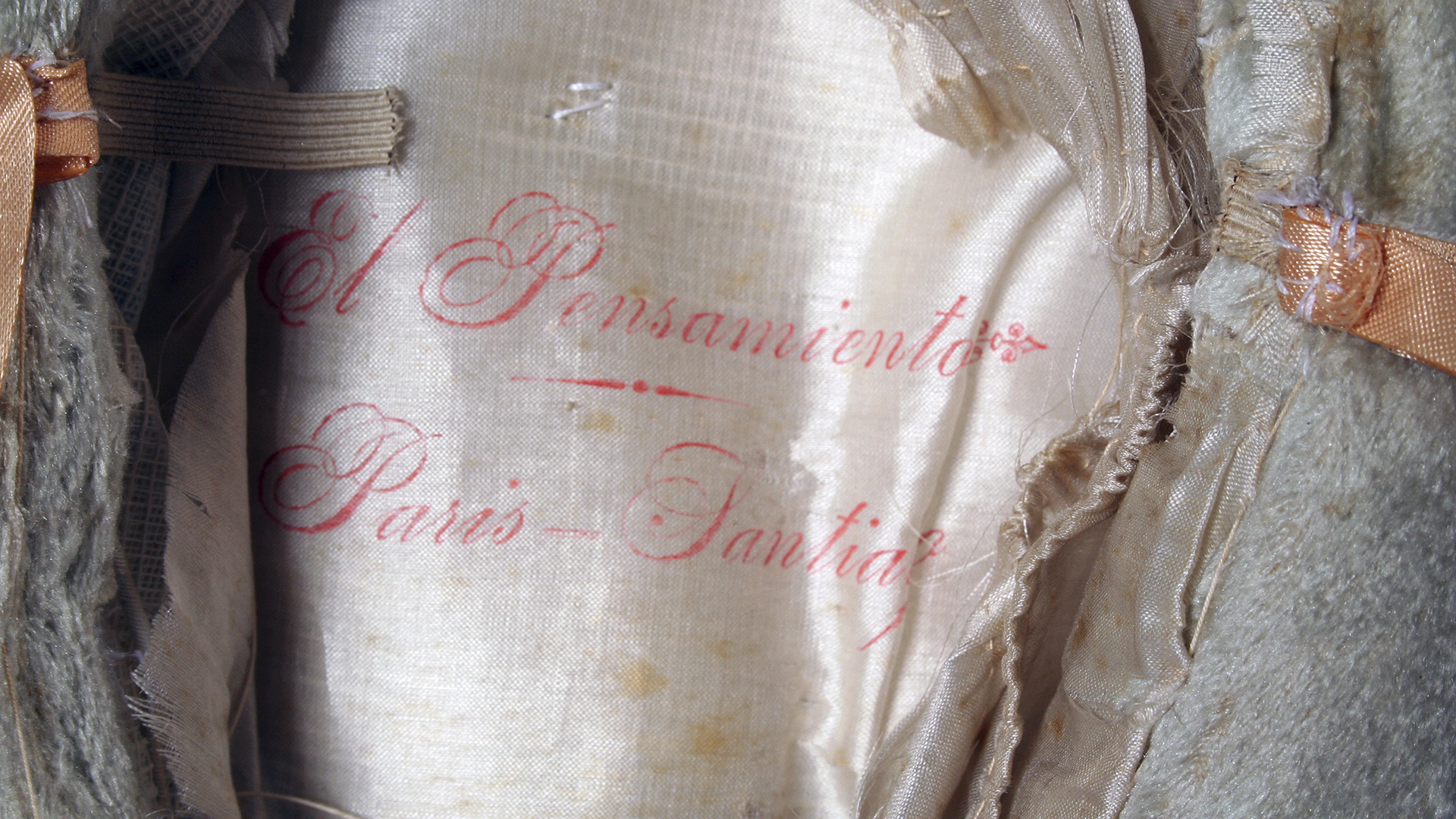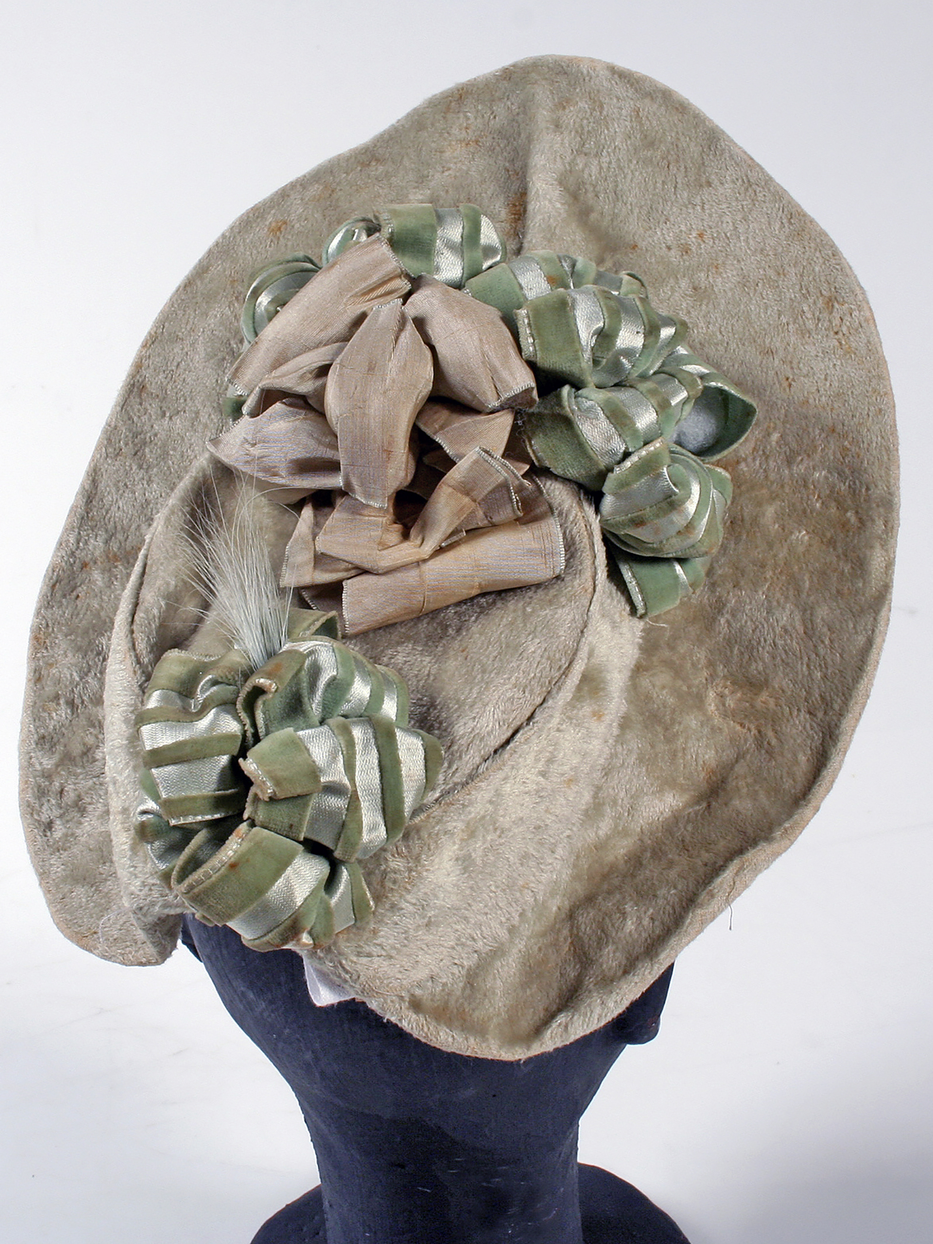 Gray fur cap with a wide front brim, adorned with green and light brown ribbons on the crown and a feather in the center. Brand 'El Pensamiento' Paris-Santiago. French manufacture.