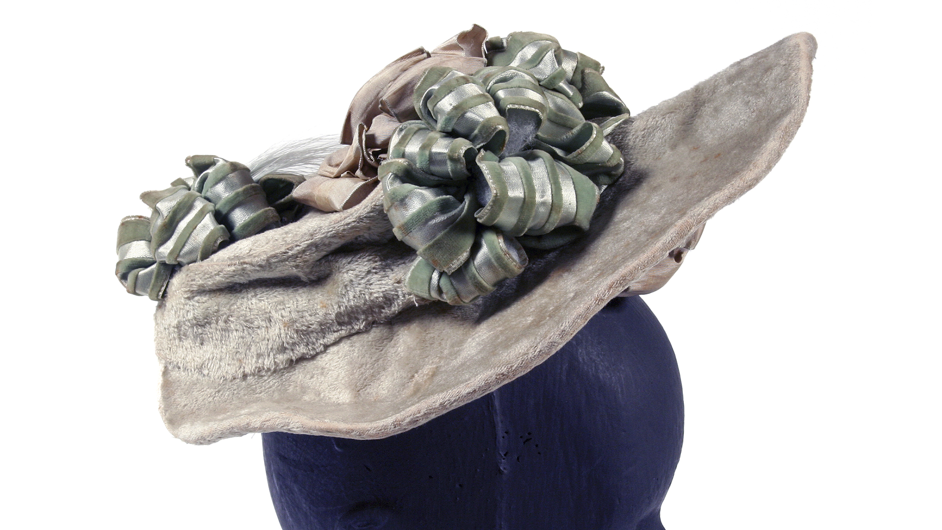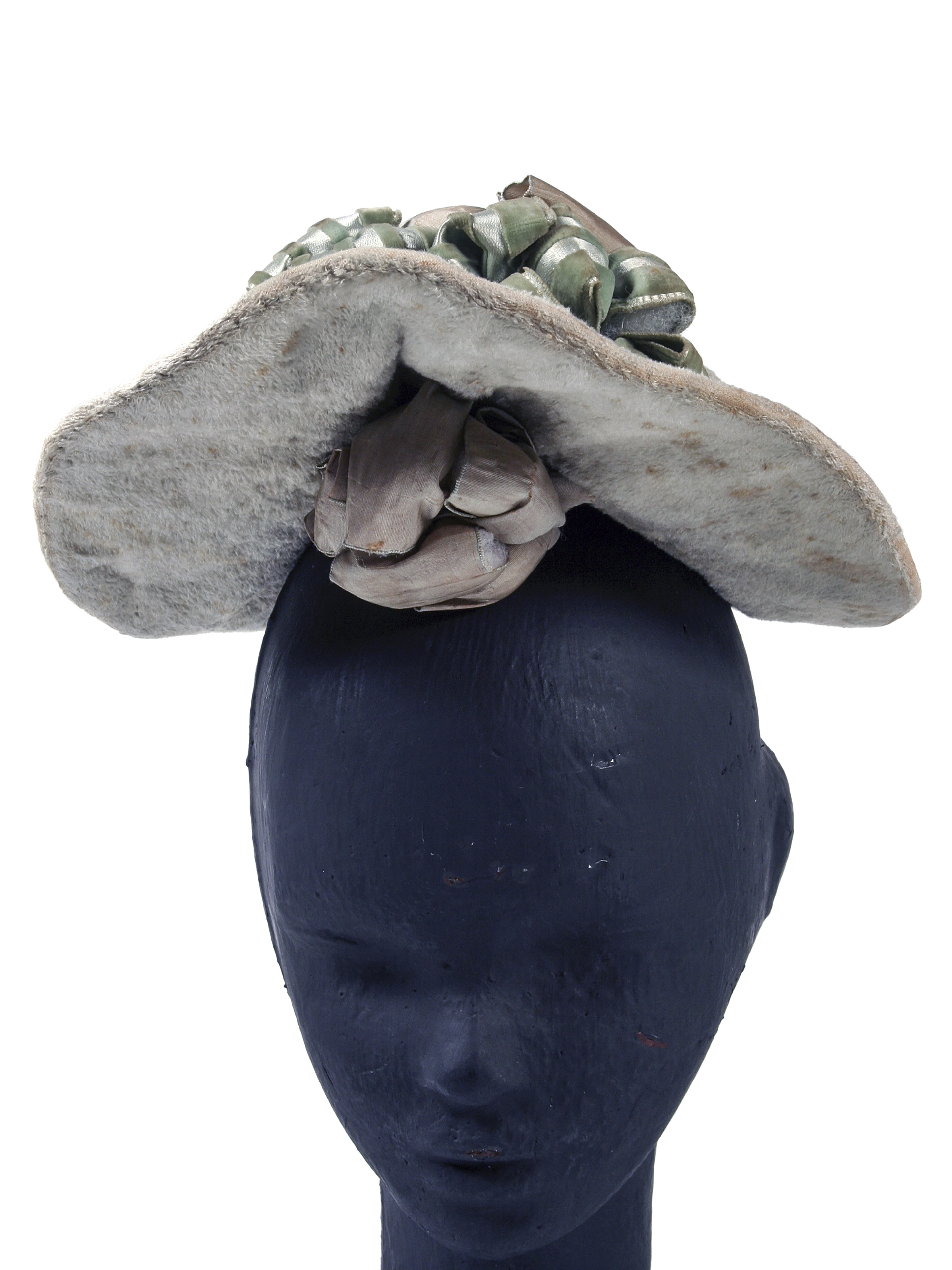 Sombrero de piel gris tipo cofia, con ala ancha en parte frontal y adornos de cintas verdes y café claro en la copa, con pluma al centro. Marca 'El Pensamiento' Paris-Santiago. Fabricación francesa.