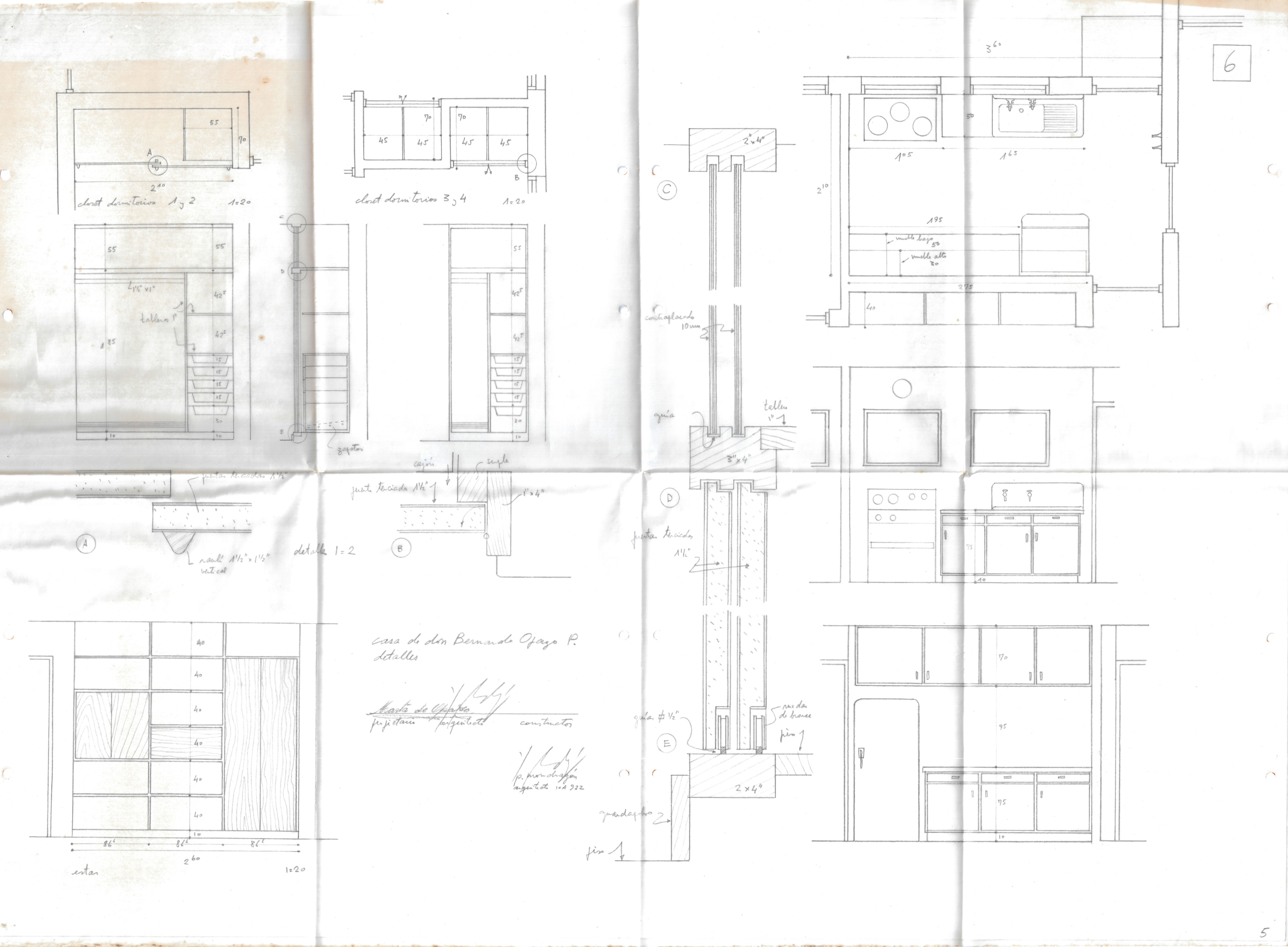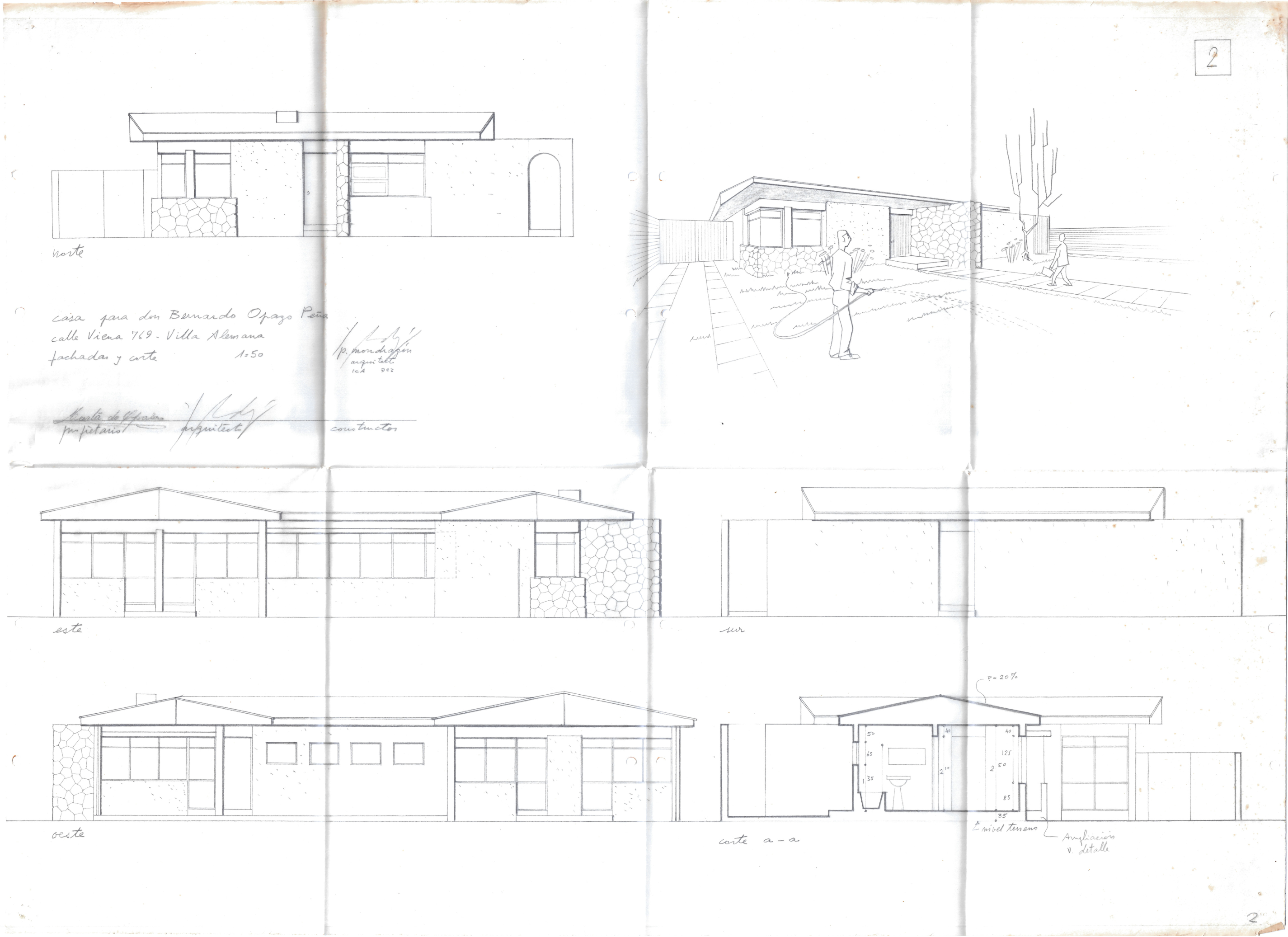 La Casa para Don Bernardo Opazo Peña, ubicada en calle Viana 769, Villa Alemana, está compuesta por un conjunto de planos arquitectónicos que detallan su diseño y características constructivas. El primer plano corresponde a los planos generales en escala 1:50, acompañados de la situación y ubicación en escala 1:5000. Este conjunto incluye dos copias, una elaborada en lápiz grafito y otra con estampilla.