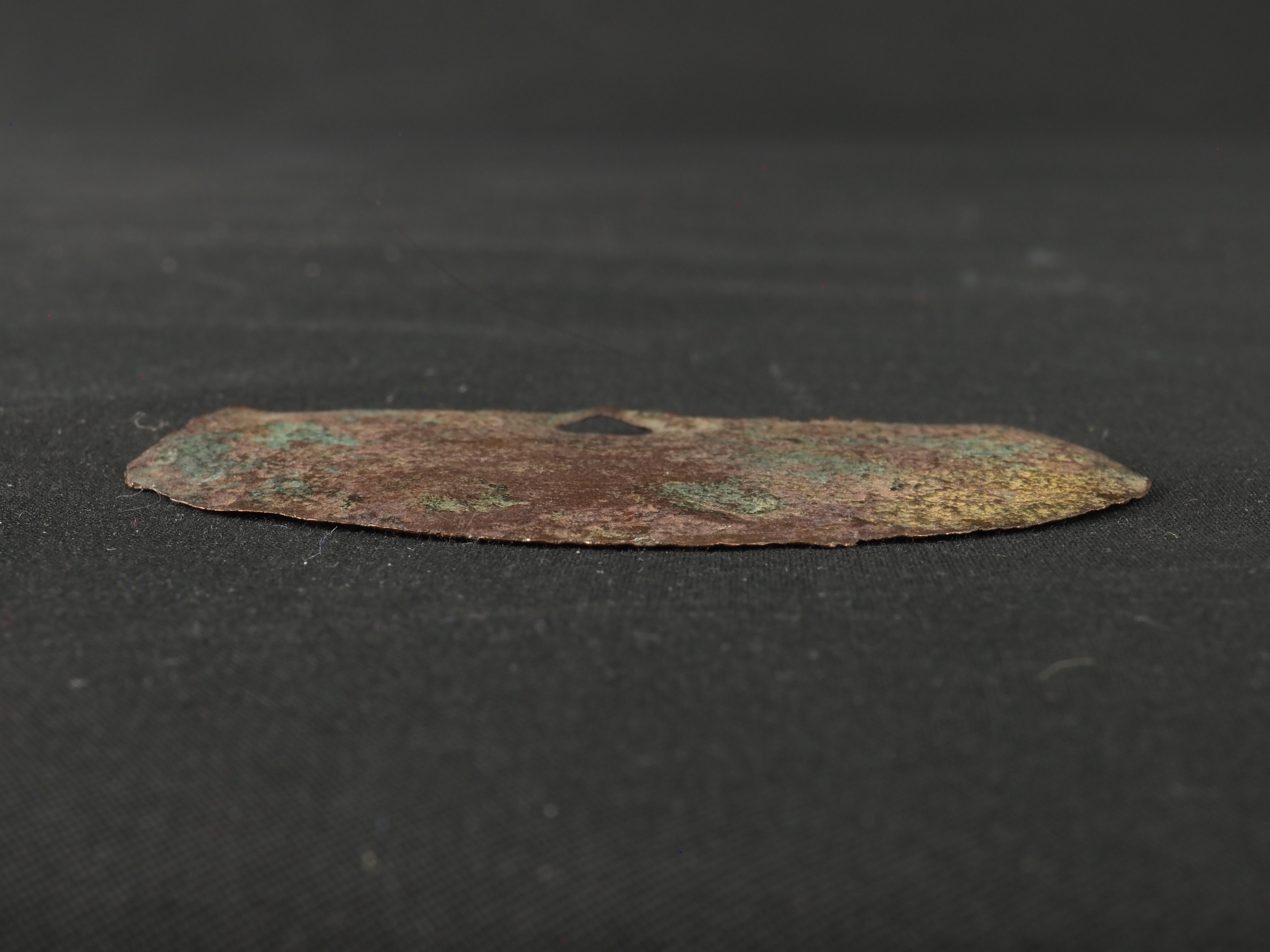 Instrumento de corte, laminar, con estado de deterioro avanzado lo que le deriva en policromía por reacción química ante adherencias superficiales. Técnica: Roca termoprocesada y aplanada. Morfología: Objeto laminar metálico de forma subesférica, de sección transversal plana en ambas caras y perforación transversal en sección distal.