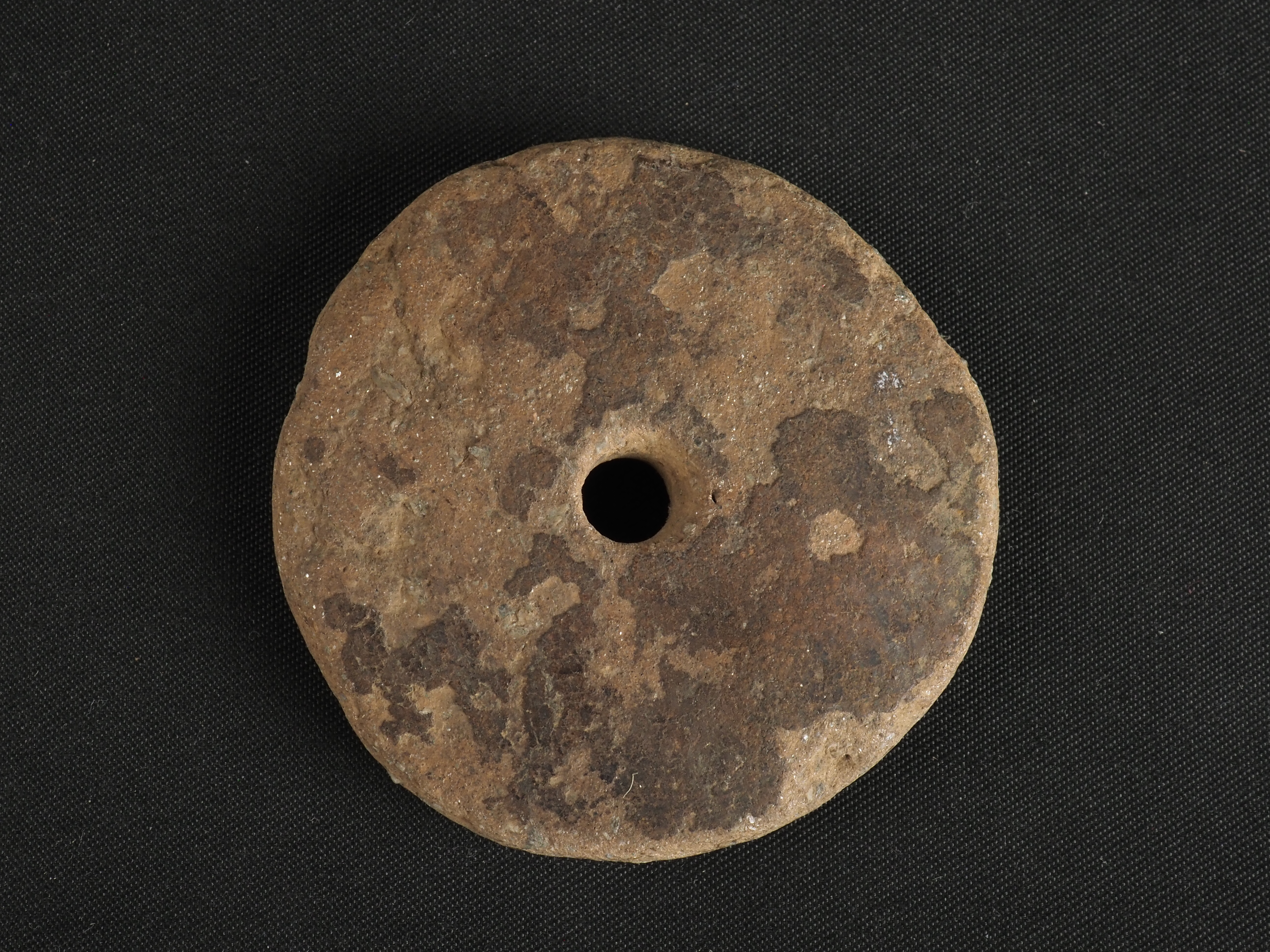 Artefacto de piedra pulida que, probablemente, se utilizaba como implemento de trabajo textil para calibrar de forma homogénea las hebras manufacturadas. Técnica: Roca tallada, pulida y perforada. Morfología: Objeto de forma esférica con perforación transversal hiperboloide central y bordes redondeados. Eje transversal es plano en ambas caras.