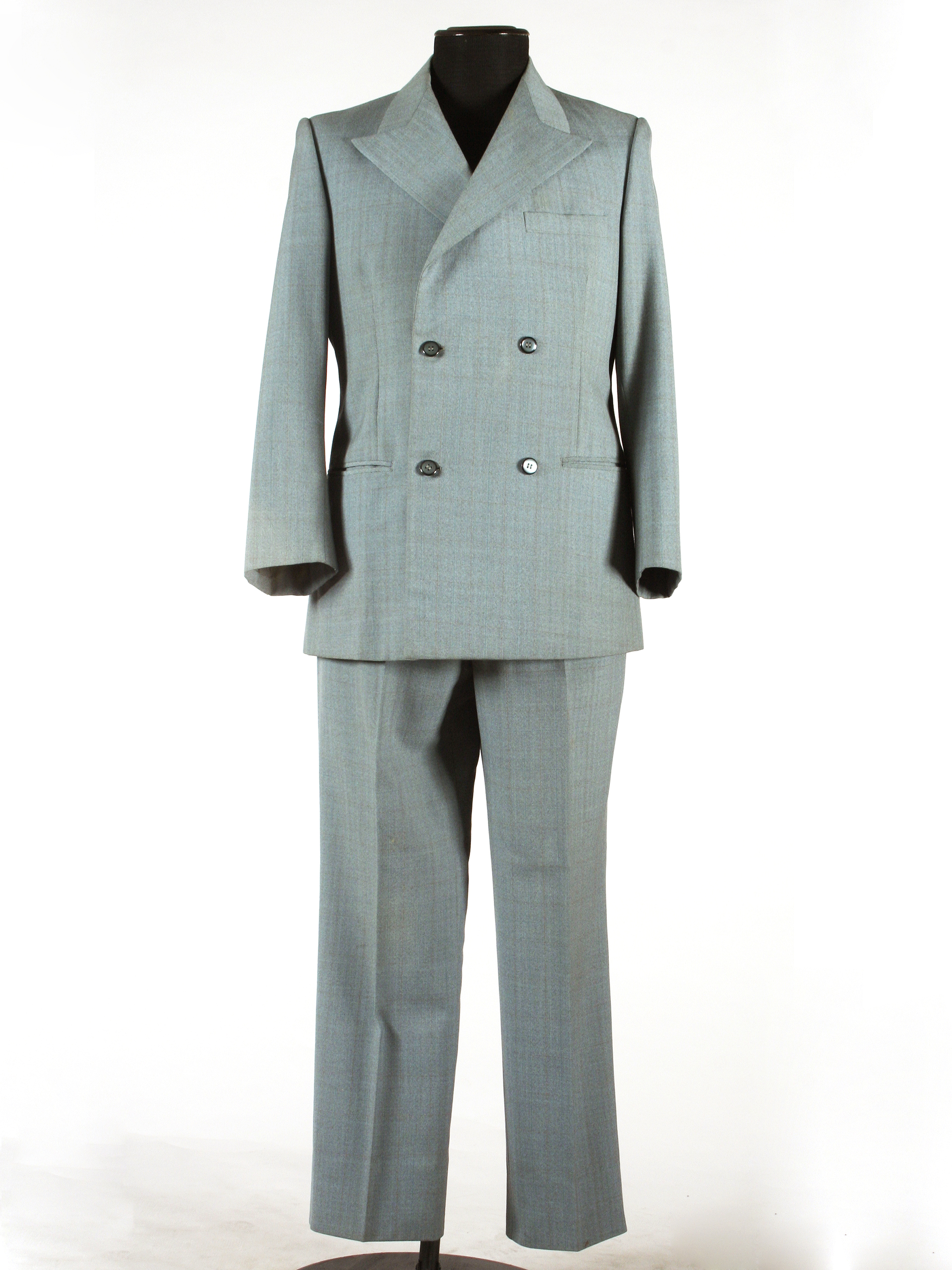 Traje ambo gris oscuro a cuadro, vestón cruzado con cuatro botones, solapa ancha y pantalón con pretina de un botón. Etiqueta 'Sastrería Opazo', Serrano 542, Valparaíso, Fono 57607. Fabricación chilena.