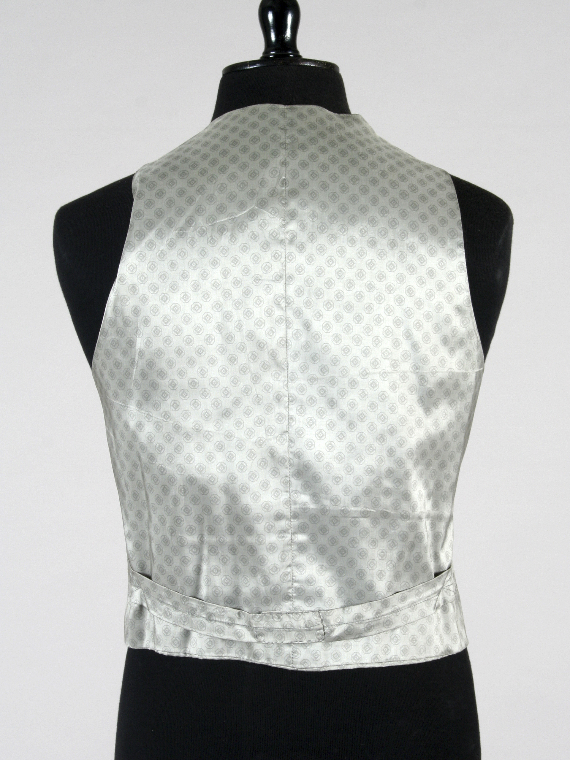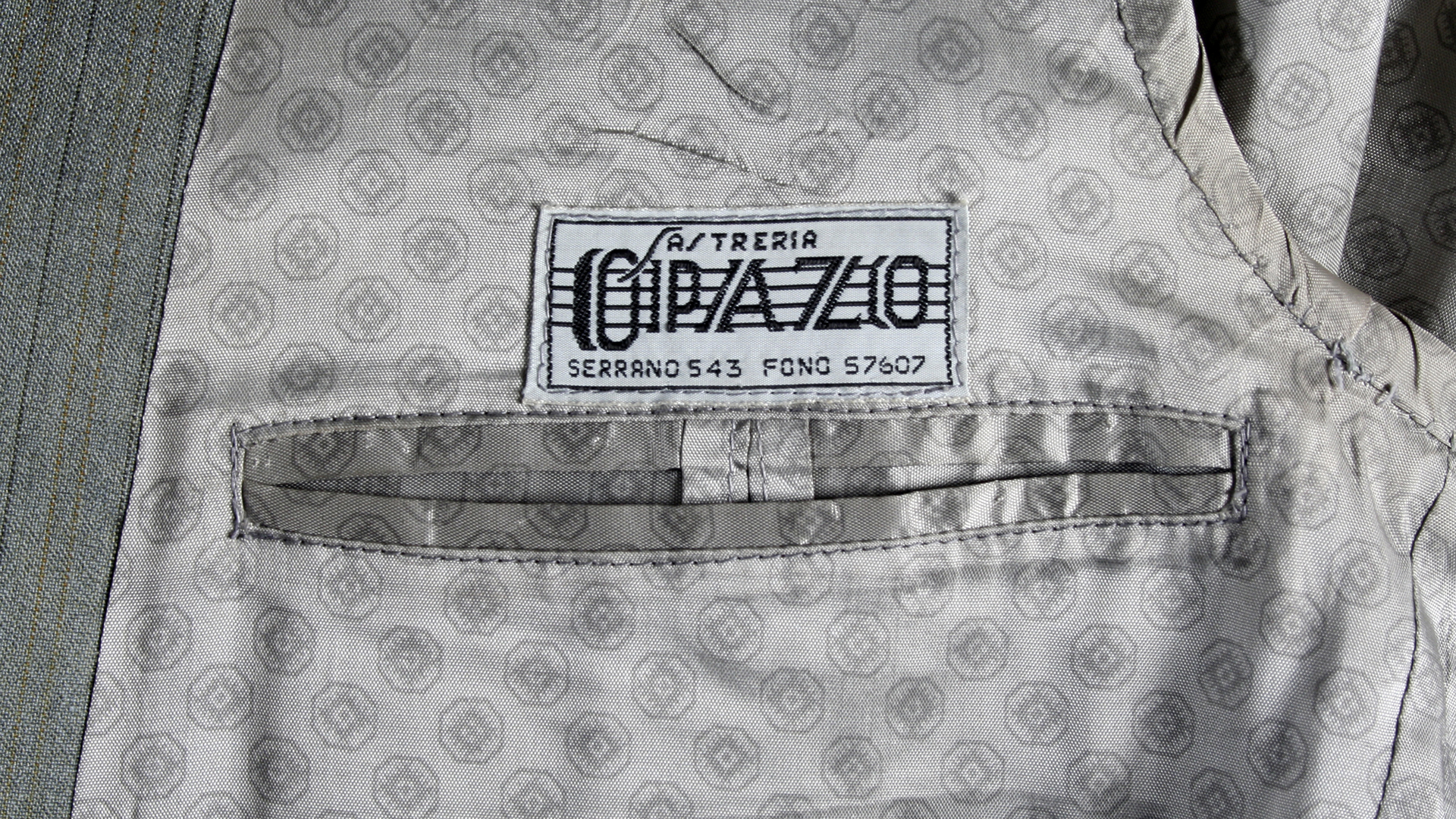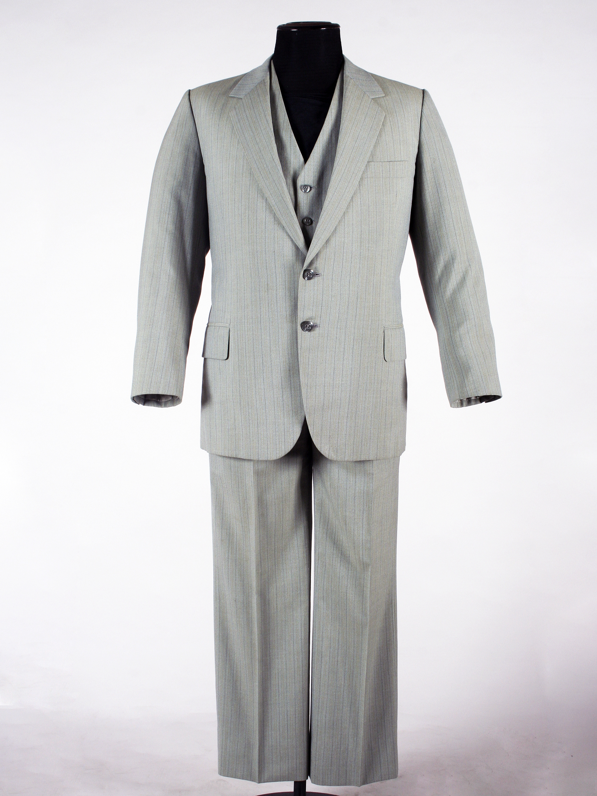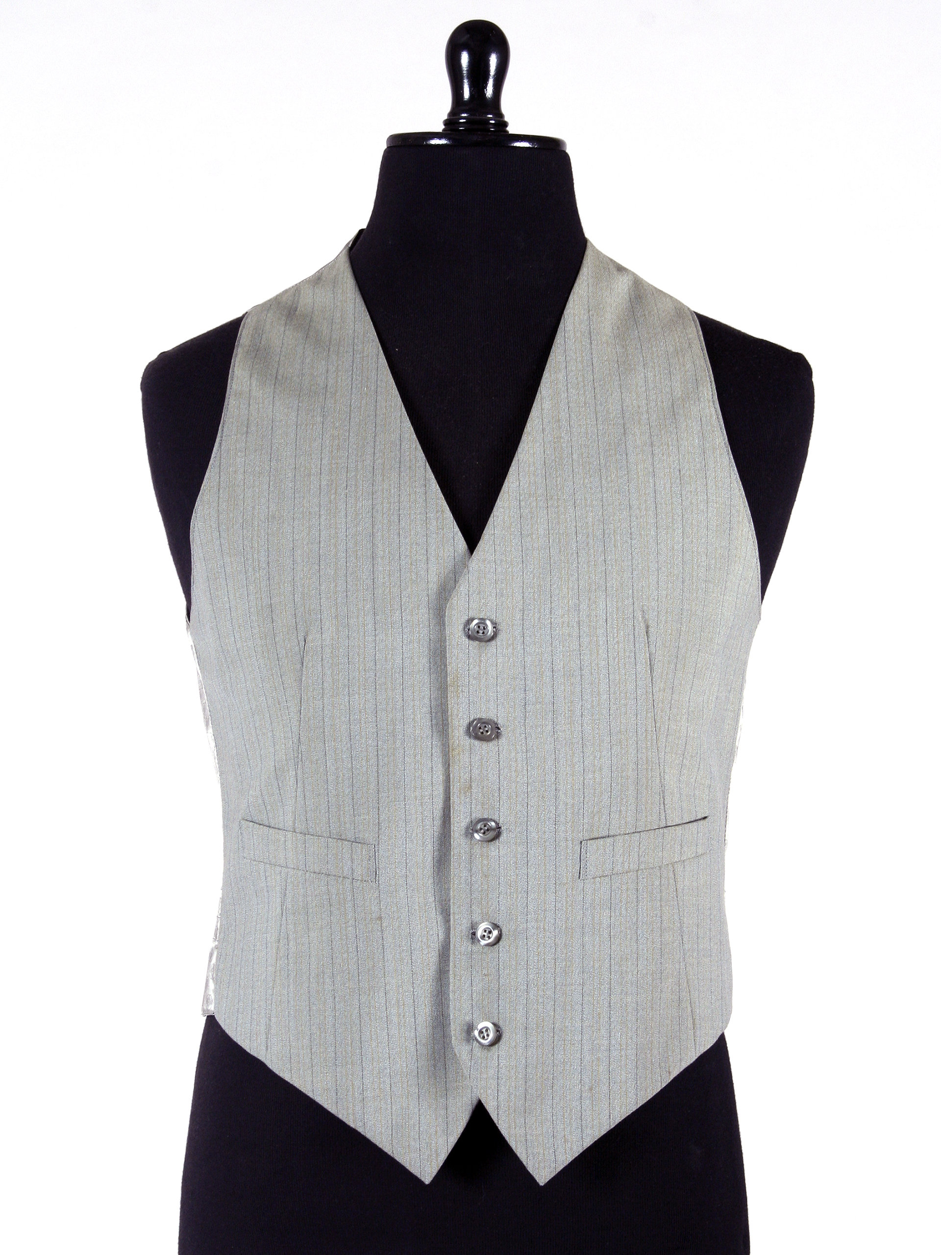 Traje gris a rayas compuesto de 3 piezas: Vestón de dos botones solapa larga, pantalón con pretina y dos botones, gilet con espalda de raso estampado. Etiqueta 'Sastrería Opazo', Serrano 542 Valparaíso, Fono 57607. Fabricación chilena.