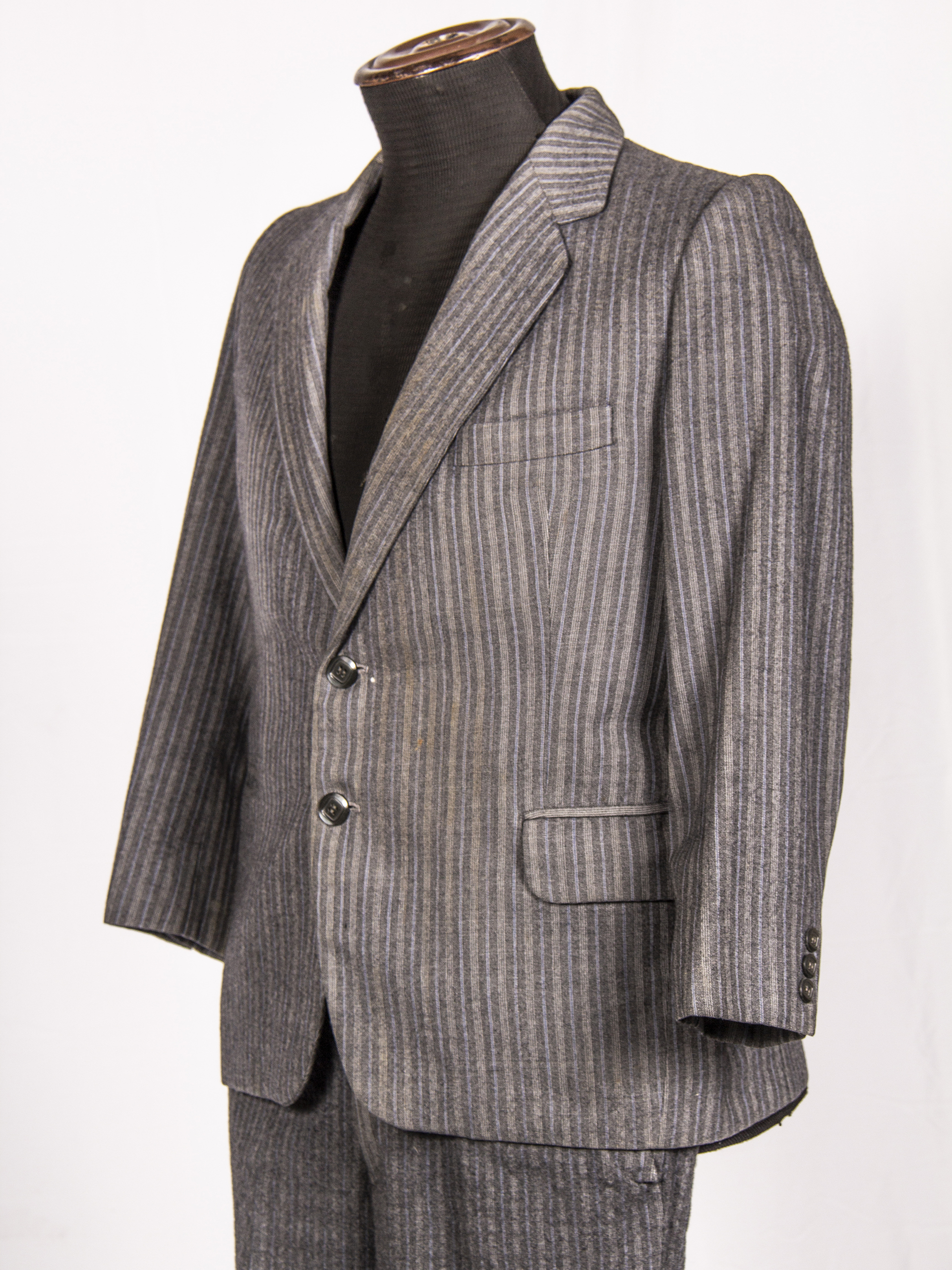 Traje 2 piezas, chaqueta gris listada 2 botones, pantalón tela más gruesa, etiqueta 'Roberto Vásquez'. Fabricación chilena. Perteneció a Alfonso Ansieta Núñez, ex alcalde y diputado por Valparaíso.