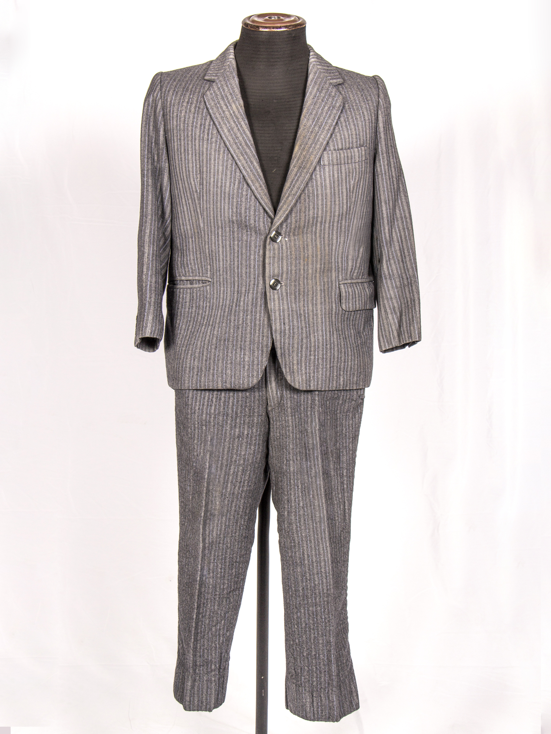 Two-piece suit, striped gray jacket with 2 buttons, thicker fabric trousers, label 'Roberto Vásquez.' Chilean manufacture. Belonged to Alfonso Ansieta Núñez, former mayor and deputy for Valparaíso.