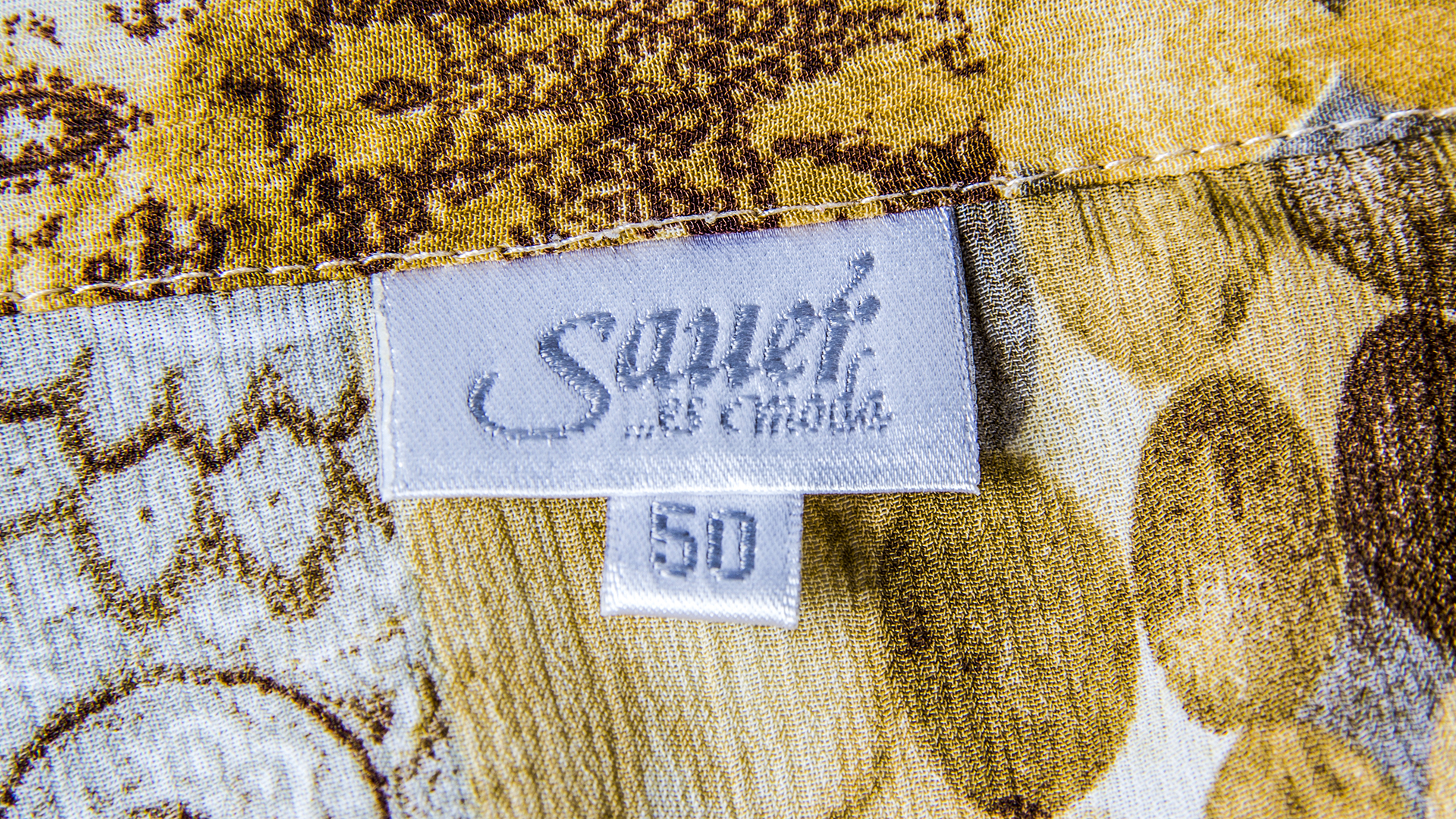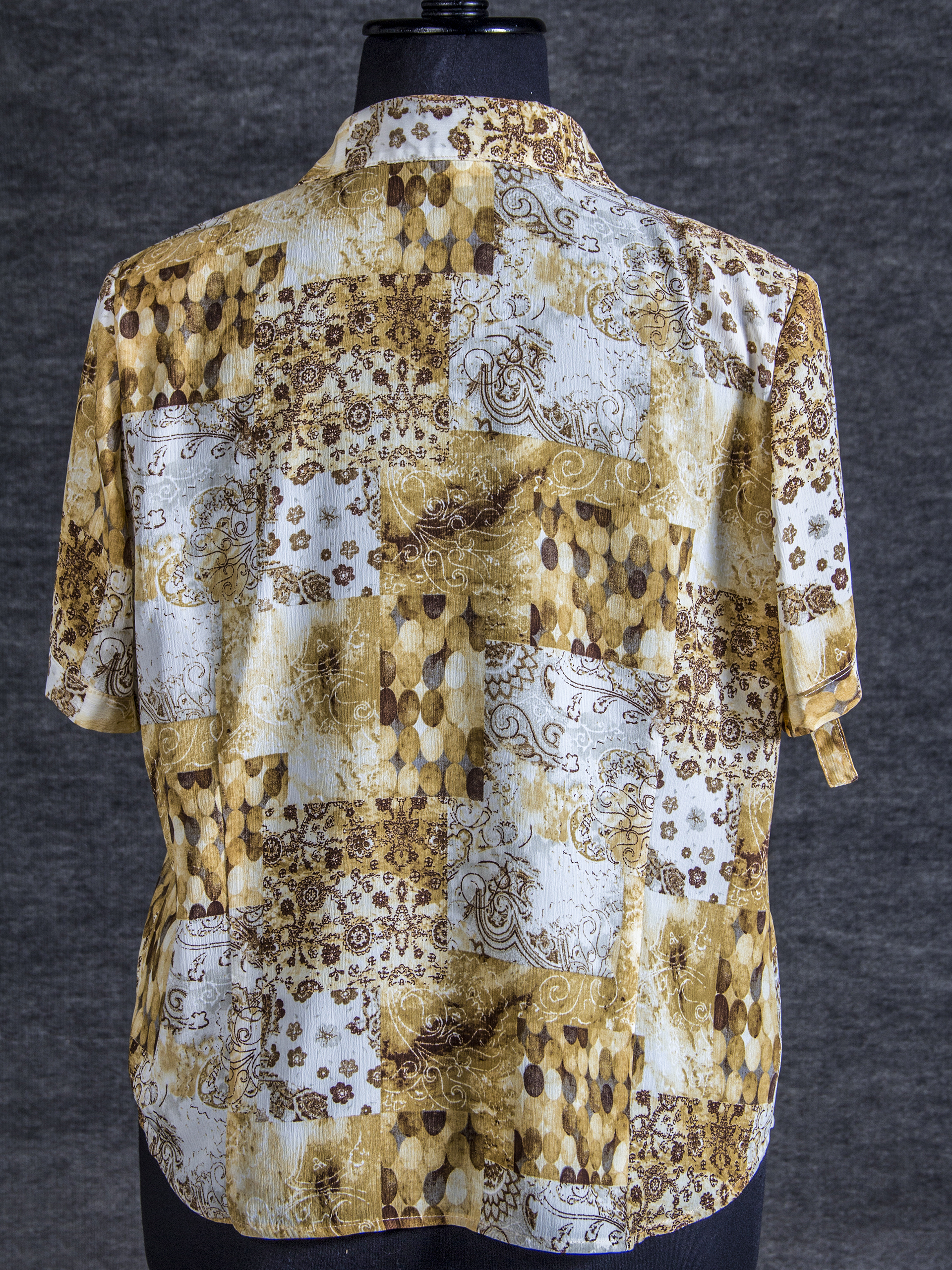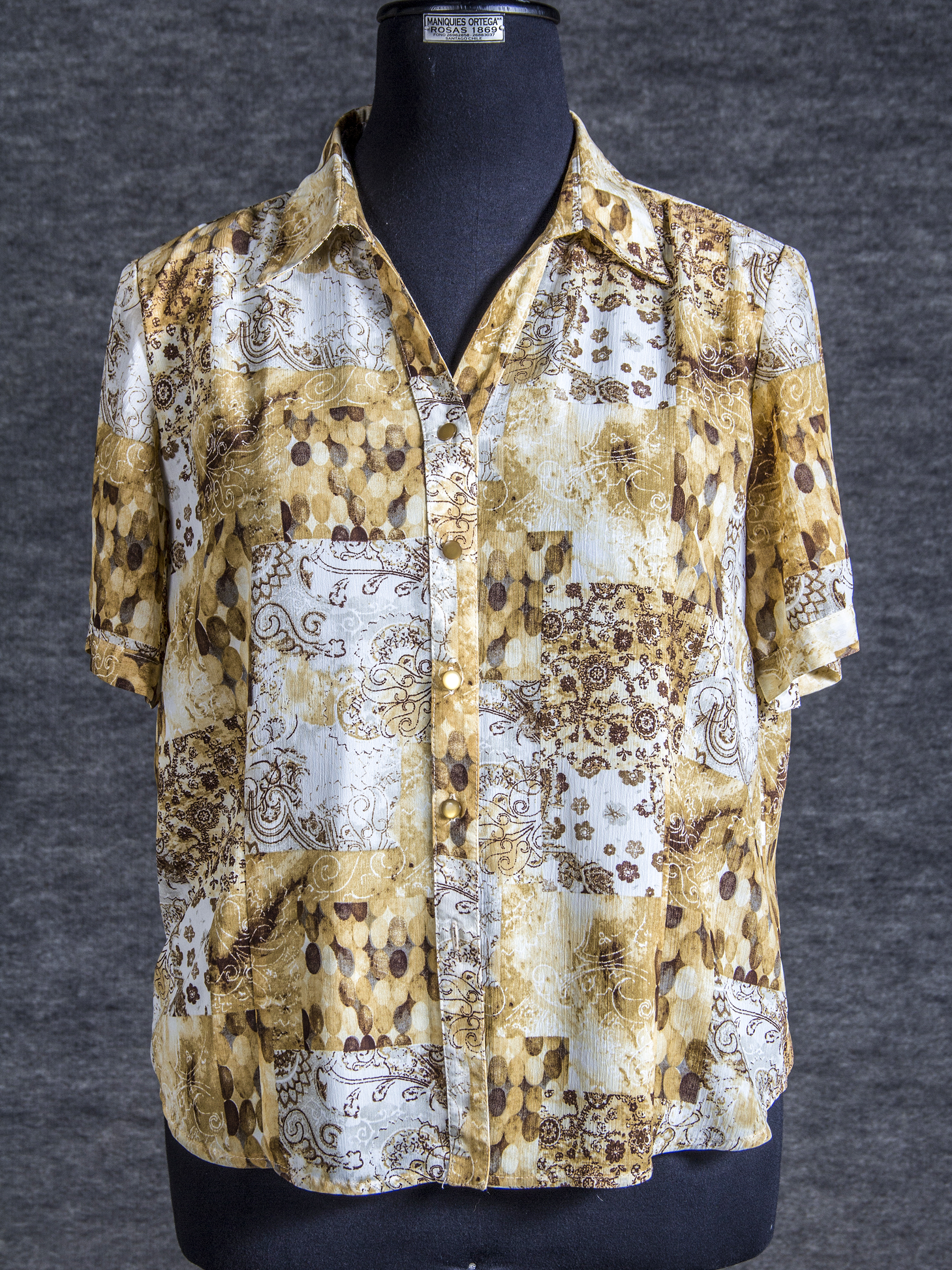 Women's blouse, short sleeves, straight lapel collar, and 6 buttons on the front, size 50, Sauer brand, printed fabric in ochre tones. It is part of the 2-piece suit CTEX-2662.