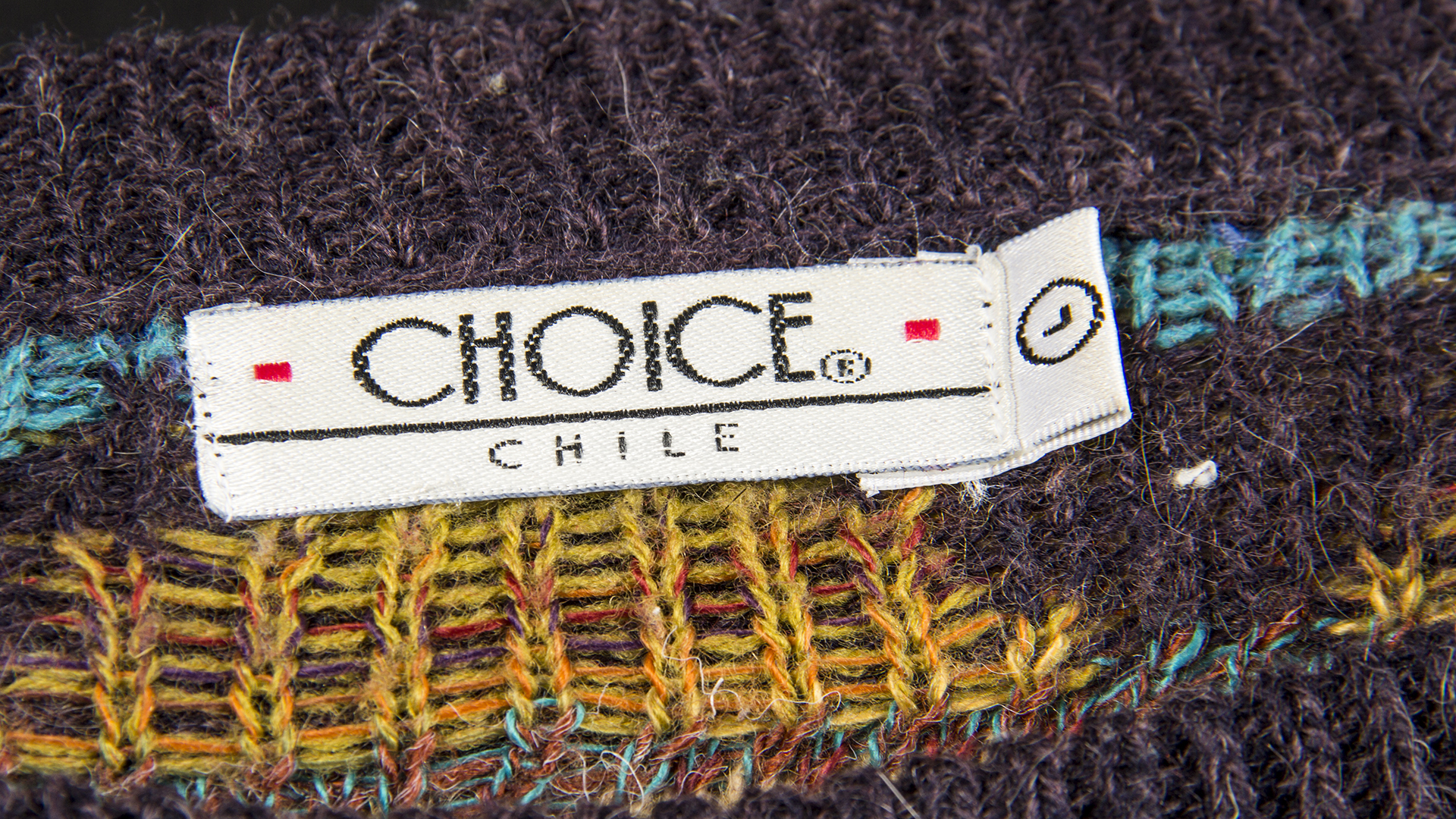 Sweater de mujer, de lana tejida, con punto fantasía, de color café, con dibujos geométricos, de colores ocres y celestes, manga larga, cuello redondo. Marca Choice, hecho en Chile. Talla L.