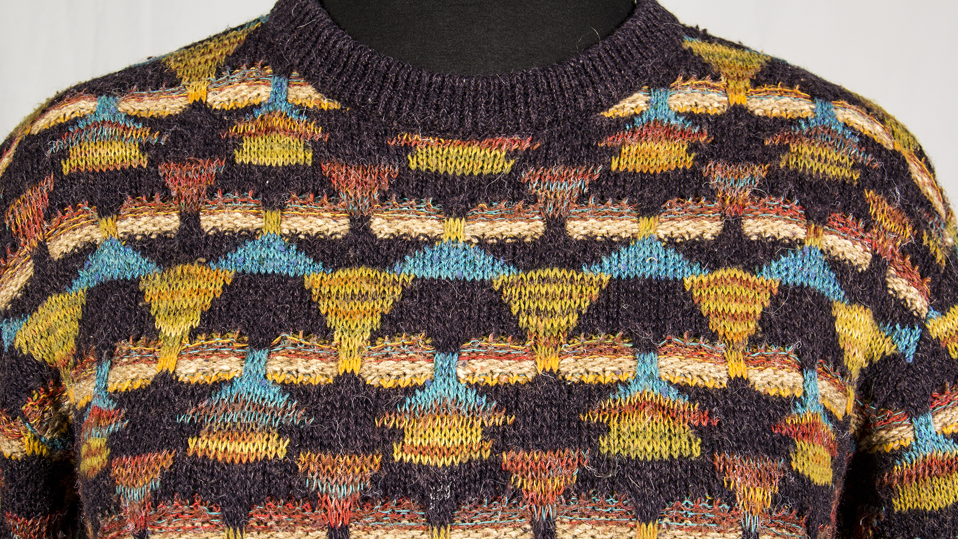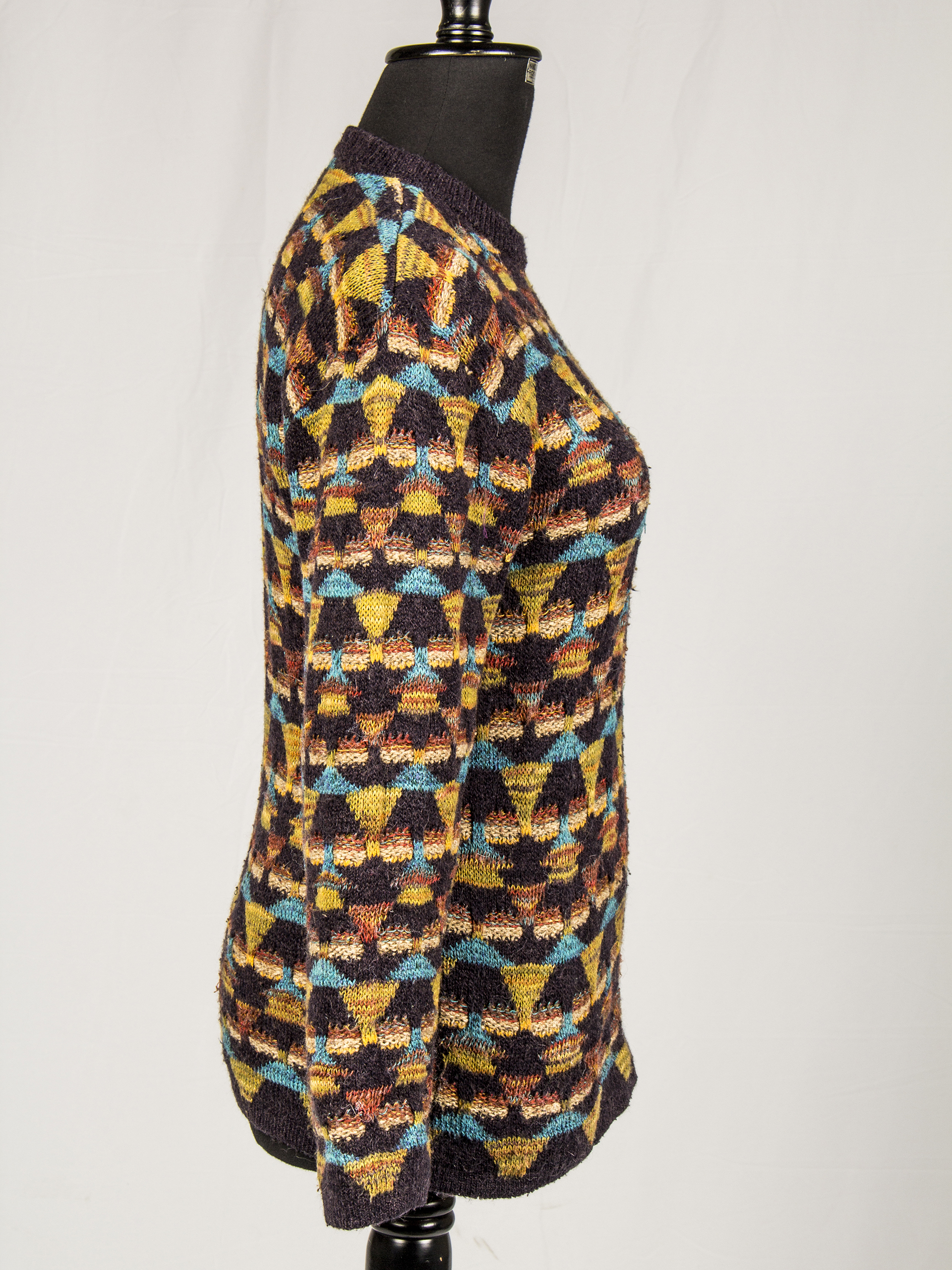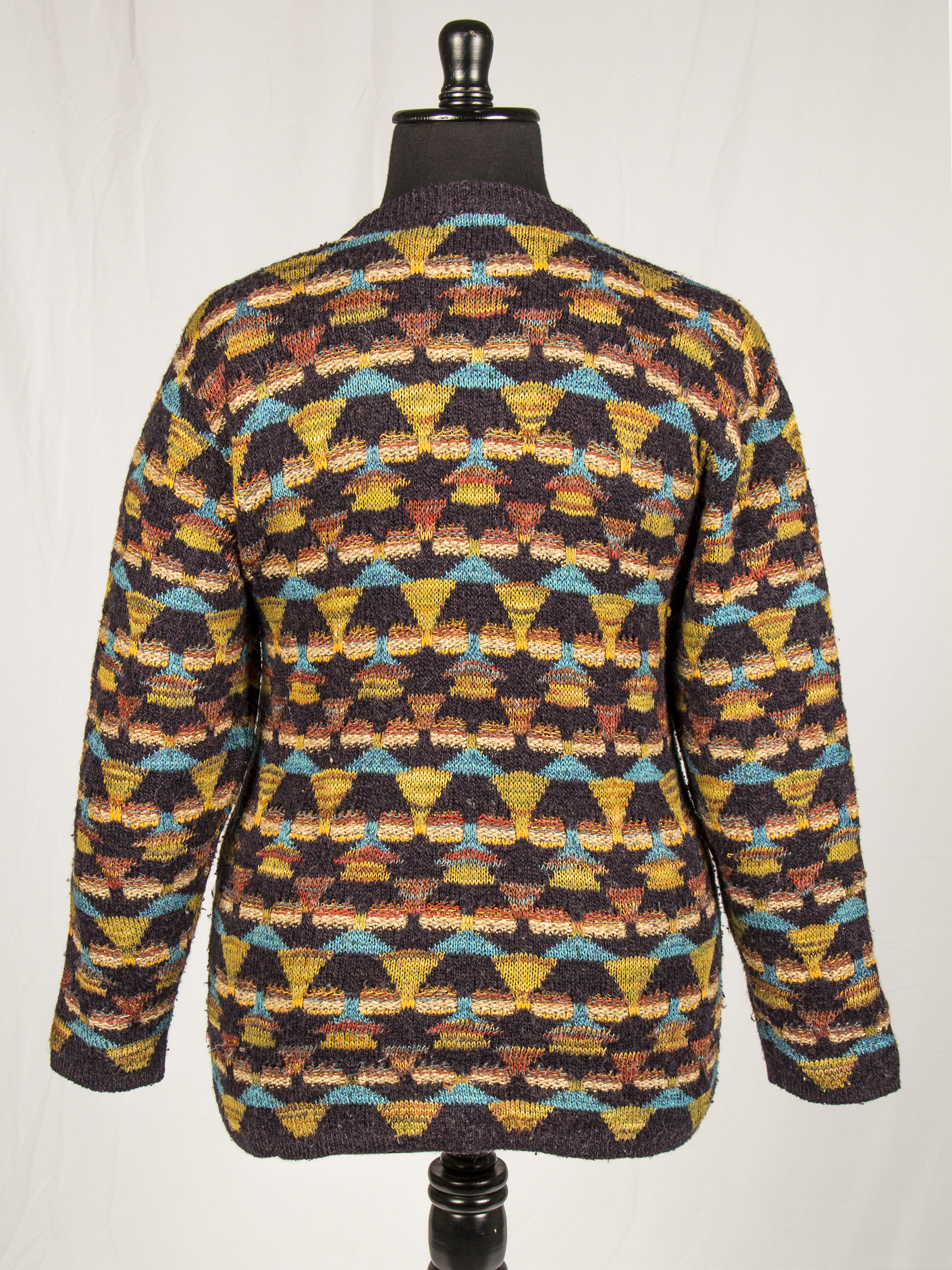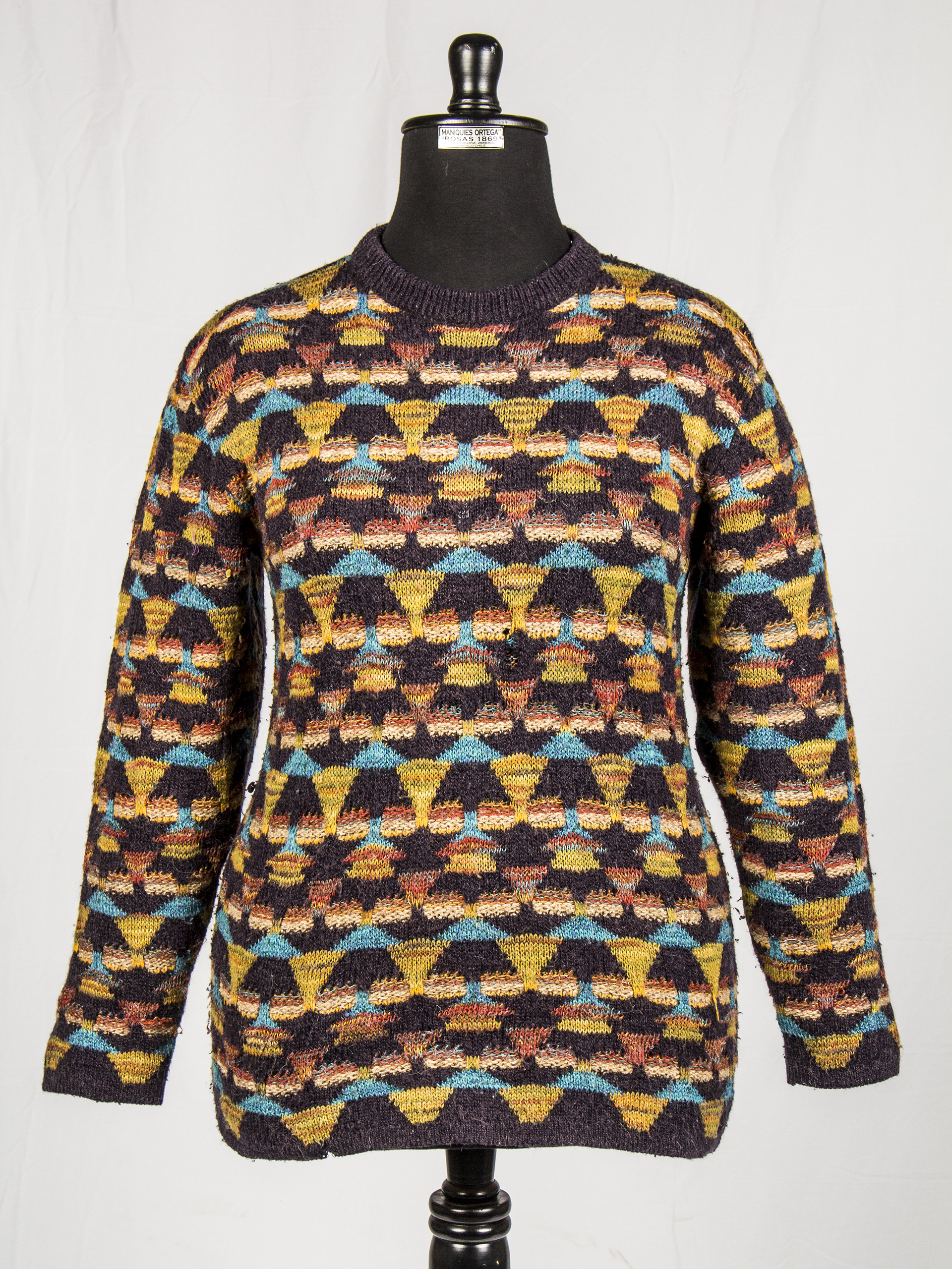 dc.description | dc.description | Sweater de mujer, de lana tejida, con punto fantasía, de color café, con dibujos geométricos, de colores ocres y celestes, manga larga, cuello redondo. Marca Choice, hecho en Chile. Talla L. | |