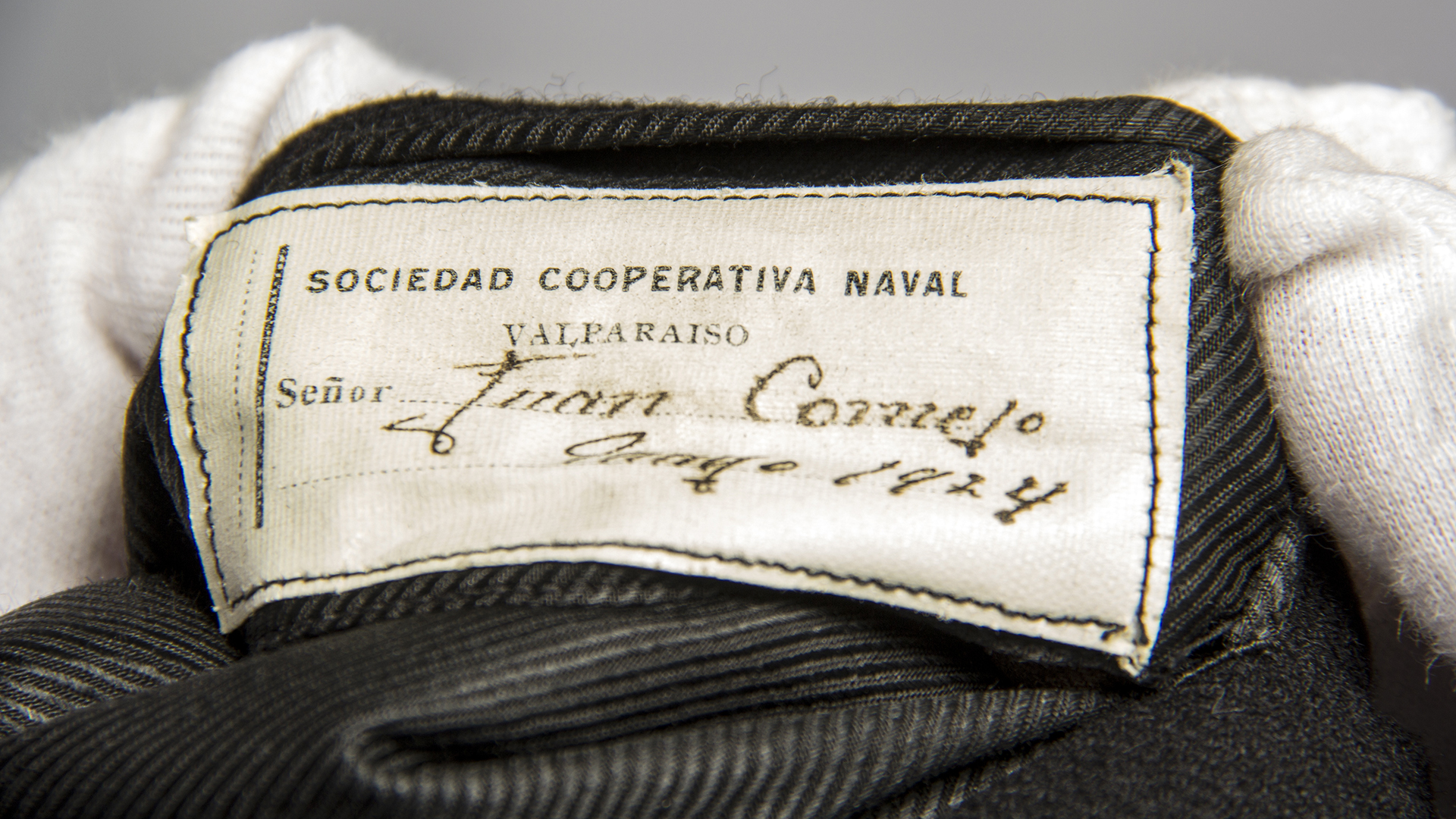 Black wool tuxedo jacket with two buttons on the front and a back tab with openings and two buttons. Label 'Soc. Cooperativa Naval' - Valparaíso in the name of Mr. Juan Cornejo, May 1924.
