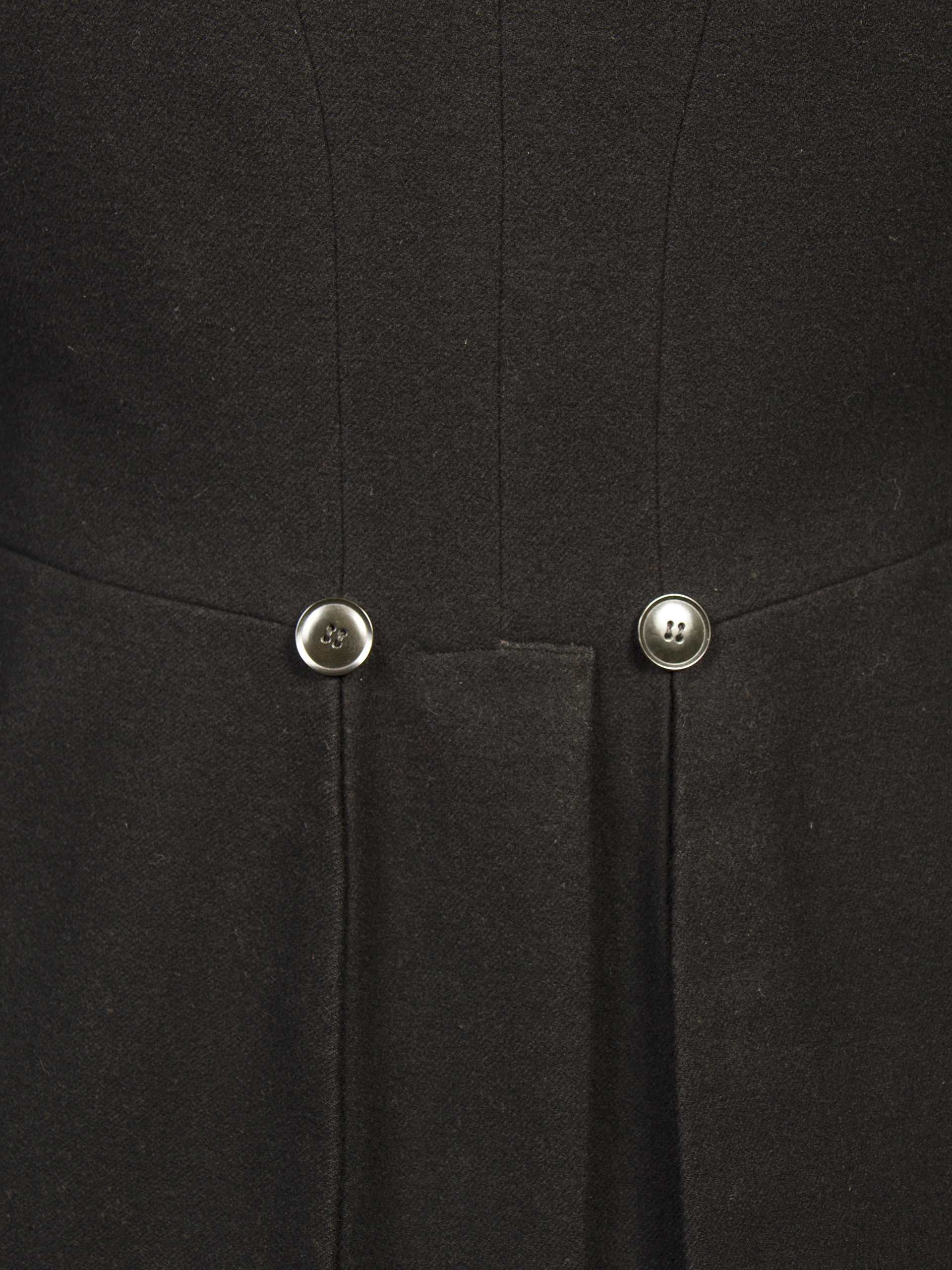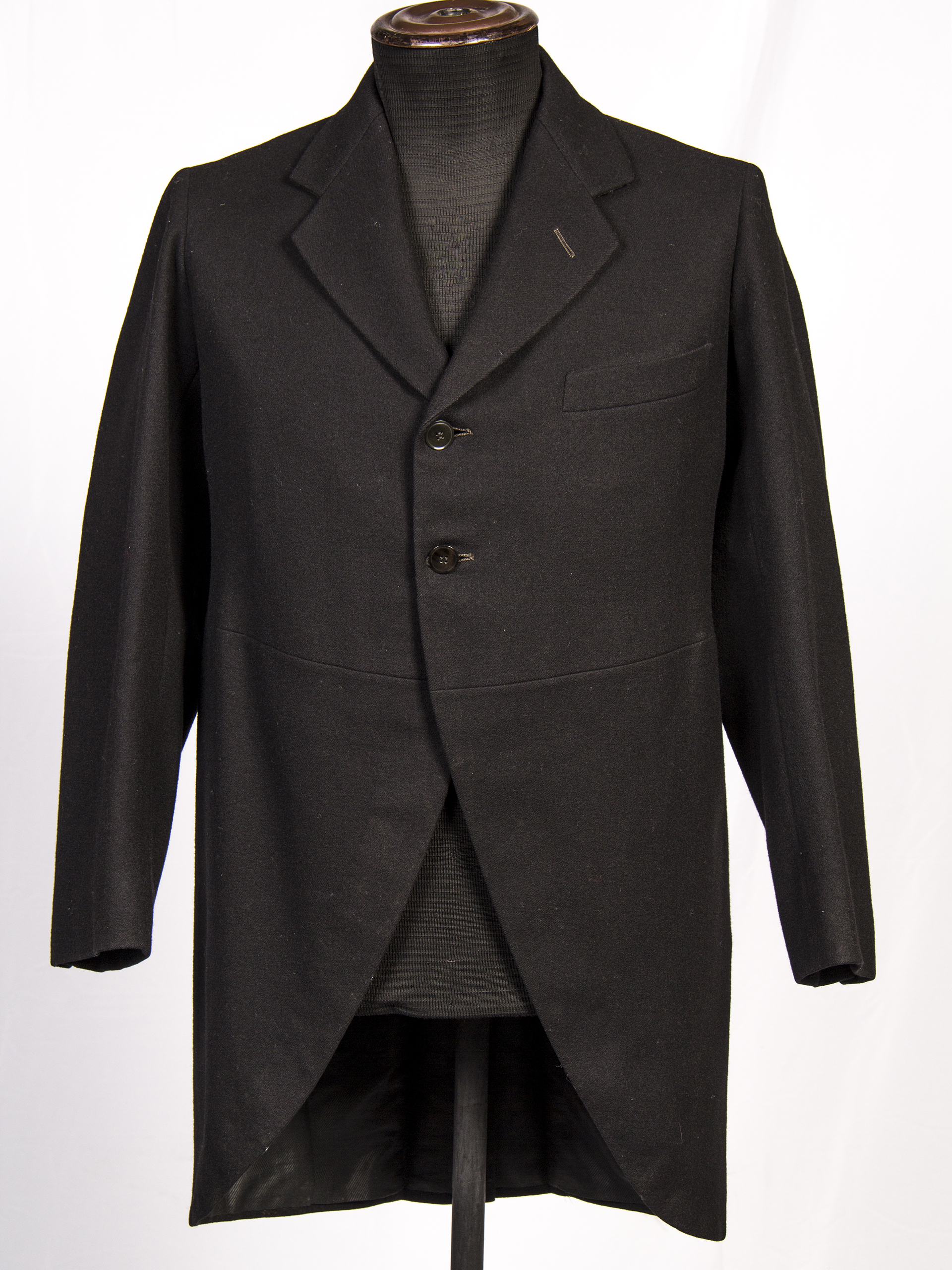 Chaqueta de Frac de paño de lana negro, con dos botones en delantero y en espalda, tabla con apertura y dos botones en espalda. Etiqueta 'Soc. Cooperativa Naval' - Valparaíso a nombre de Sr. Juan Cornejo, mayo 1924.