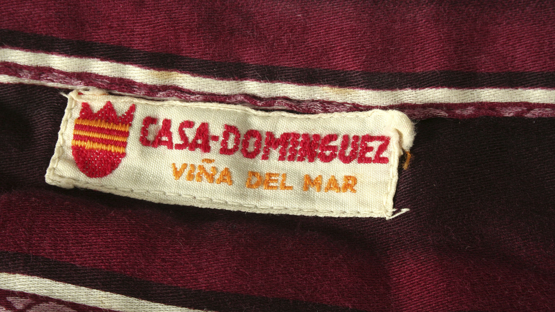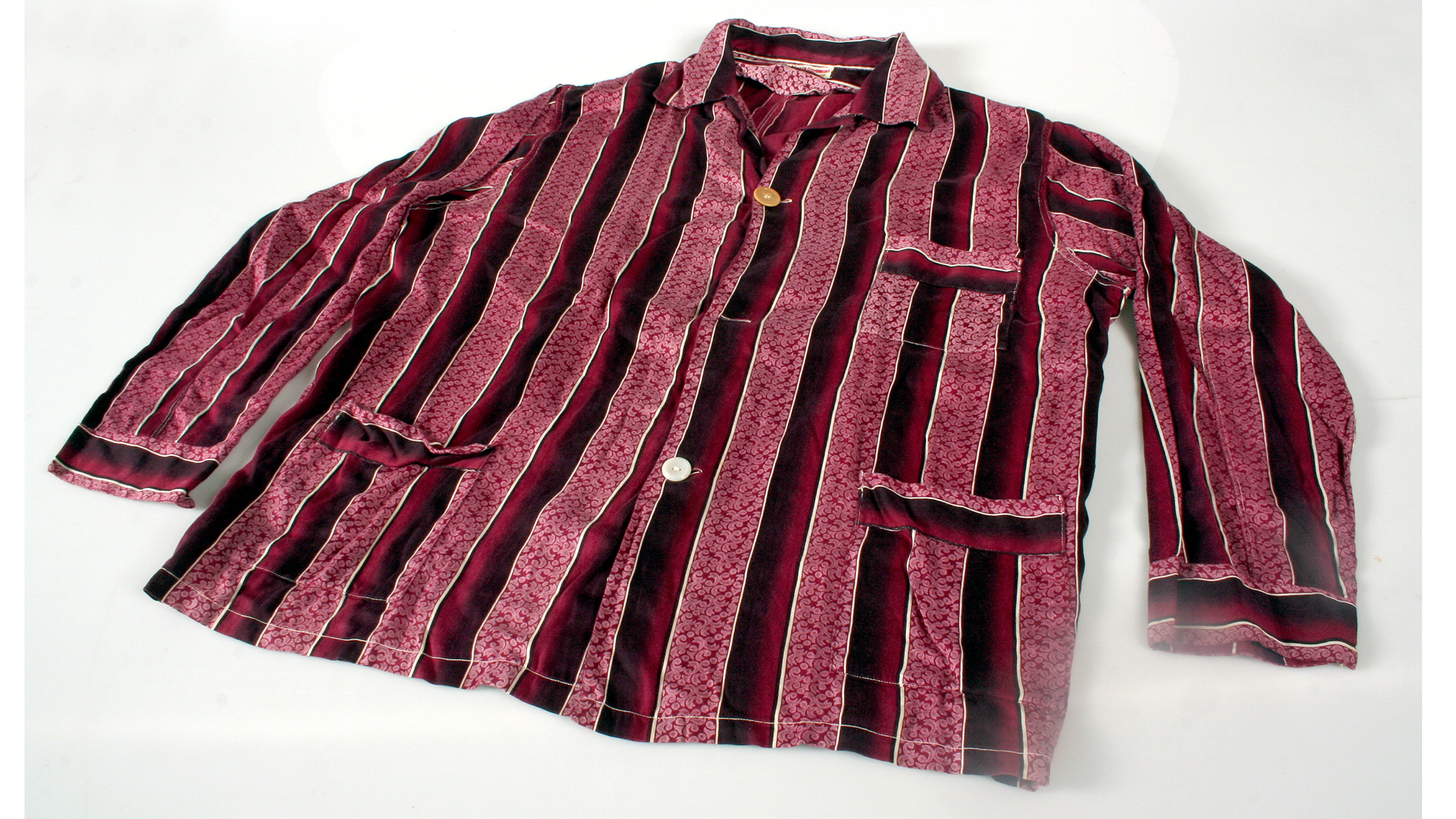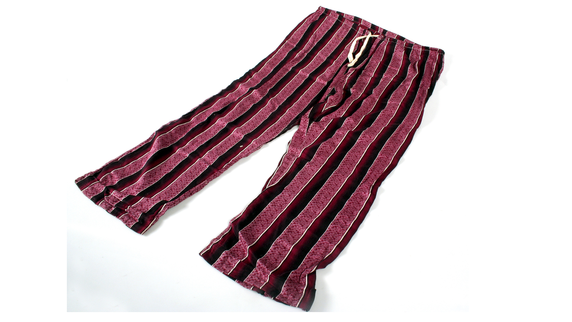 Men's cotton pajamas with burgundy stripes, drawstring waist, long sleeves with 3 pockets. Upper part with a tear under the arm and on the left side of the back. Only two buttons. Casa Domínguez label, Viña del Mar.